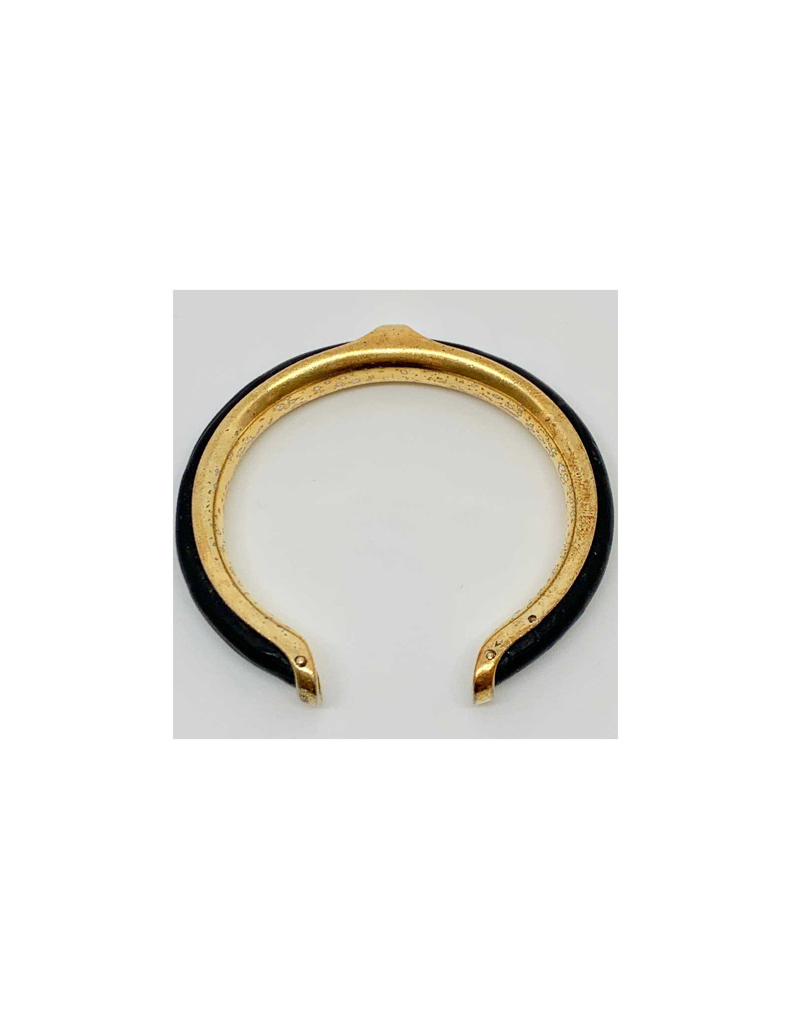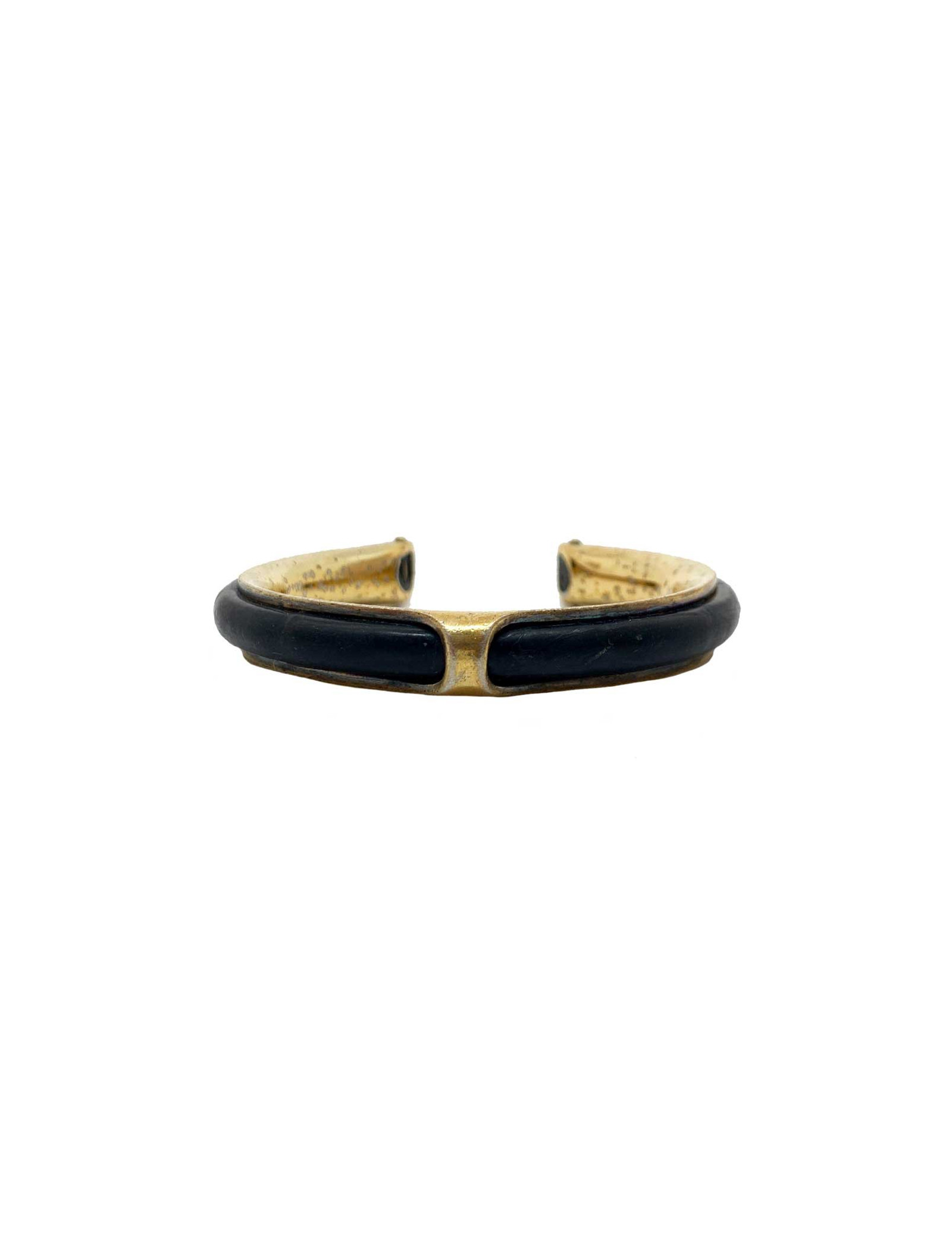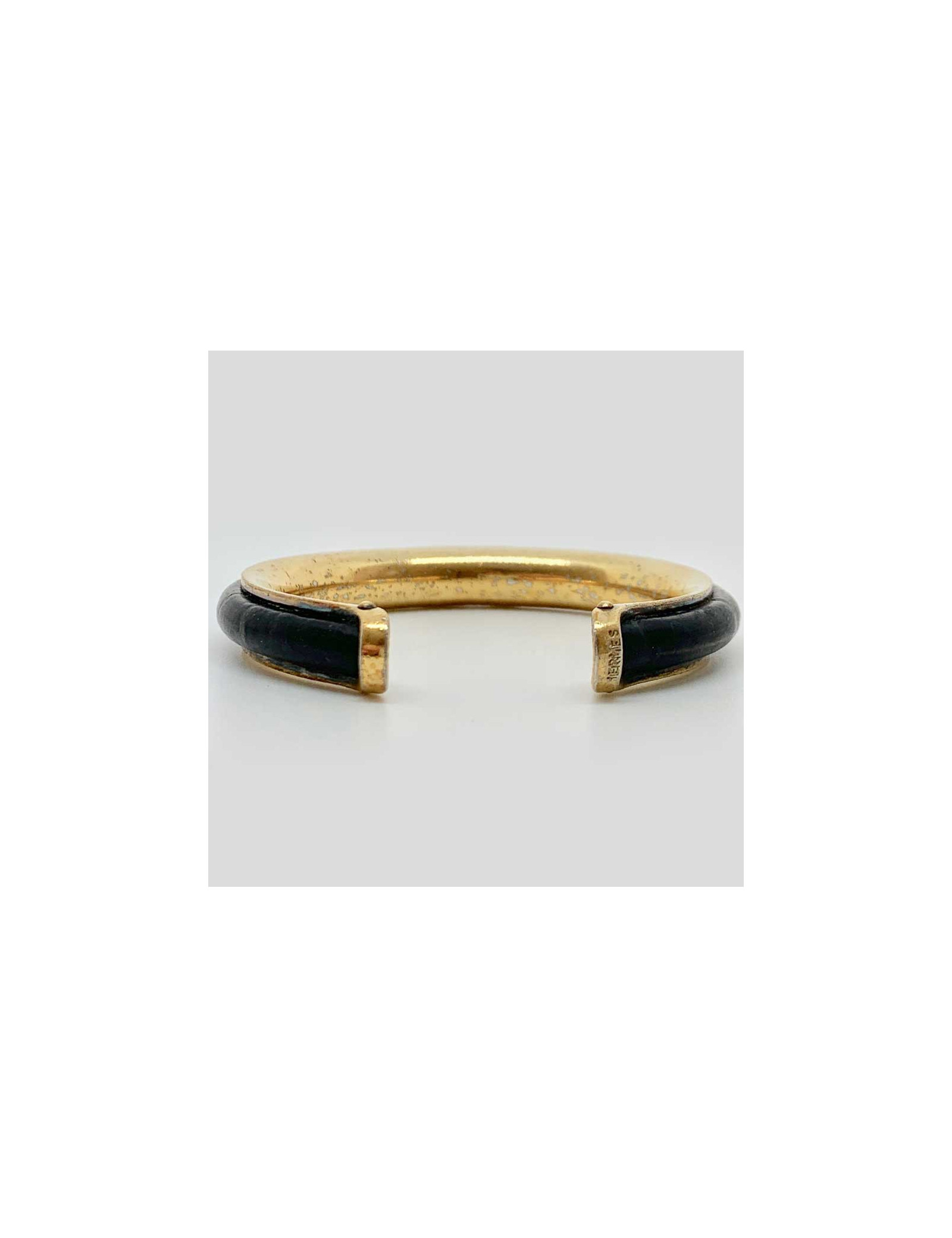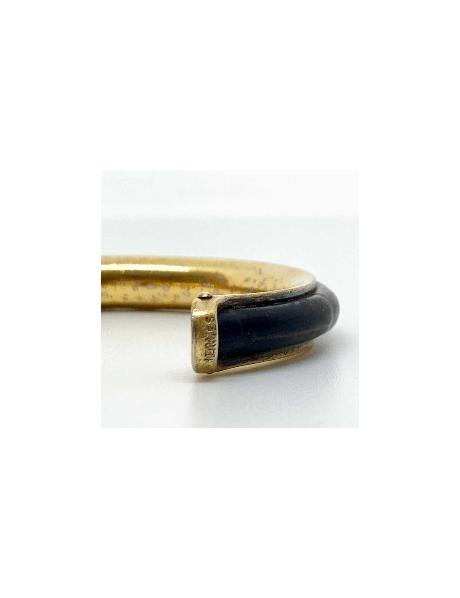 Bracelet vintage de la Maison HERMES. Il est laiton doré et cuir noir. La marque HERMES est gravée sur une extrémité du bijou ainsi que les poinçons des orfèvres.