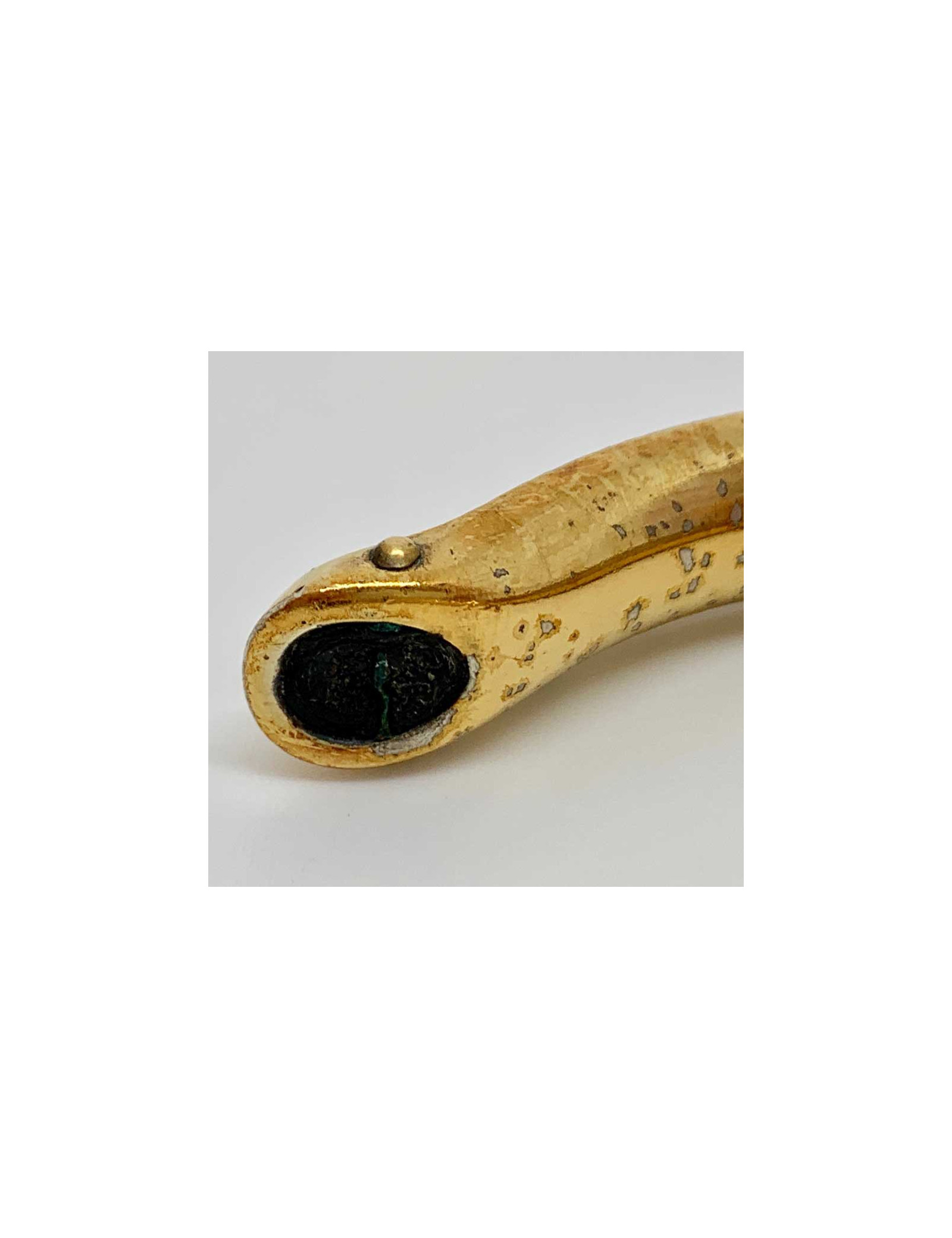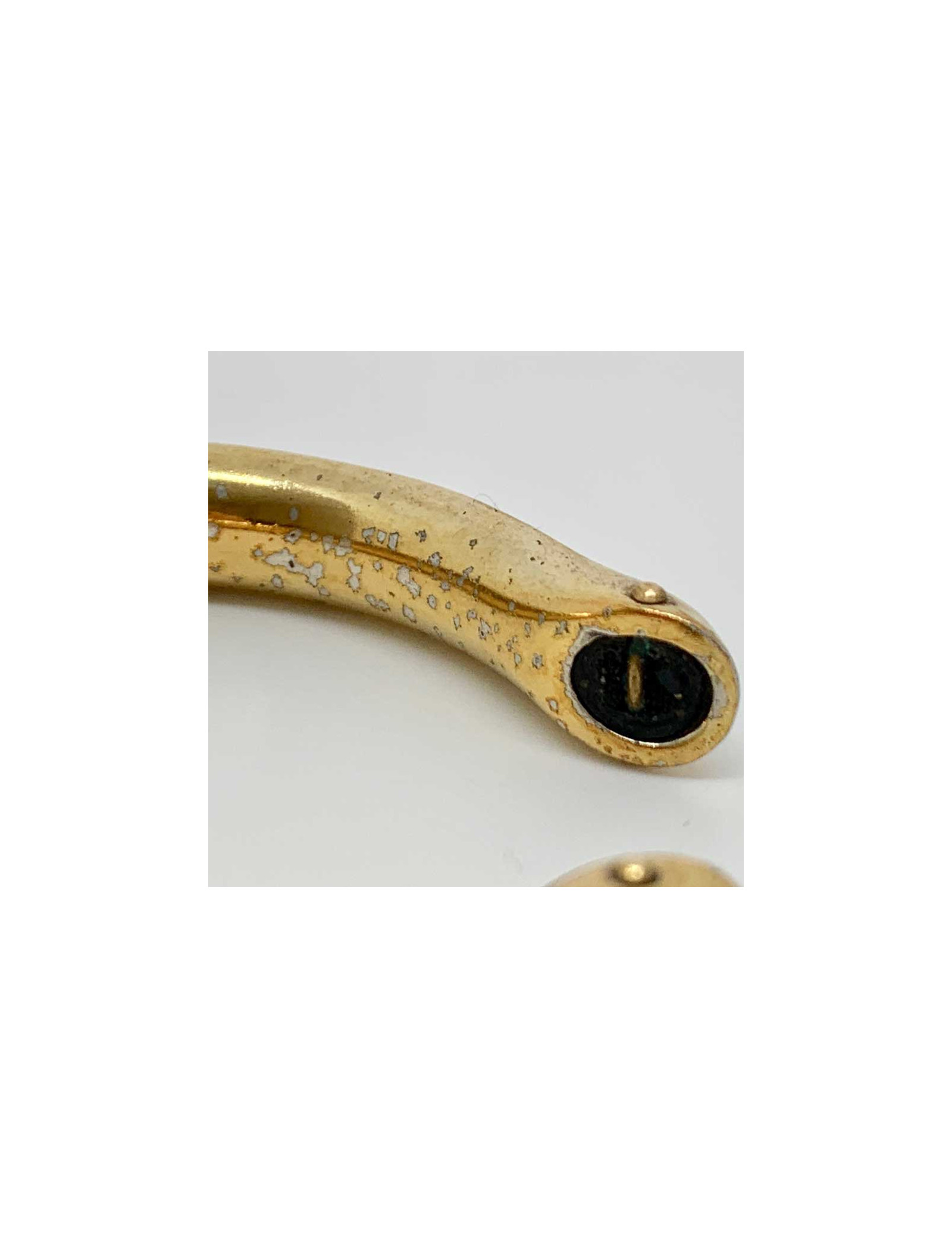 Ce bracelet est dans un état correct. En effet le cuir noir est patiné et le métal doré est piqué sur son ensemble (voir photos).