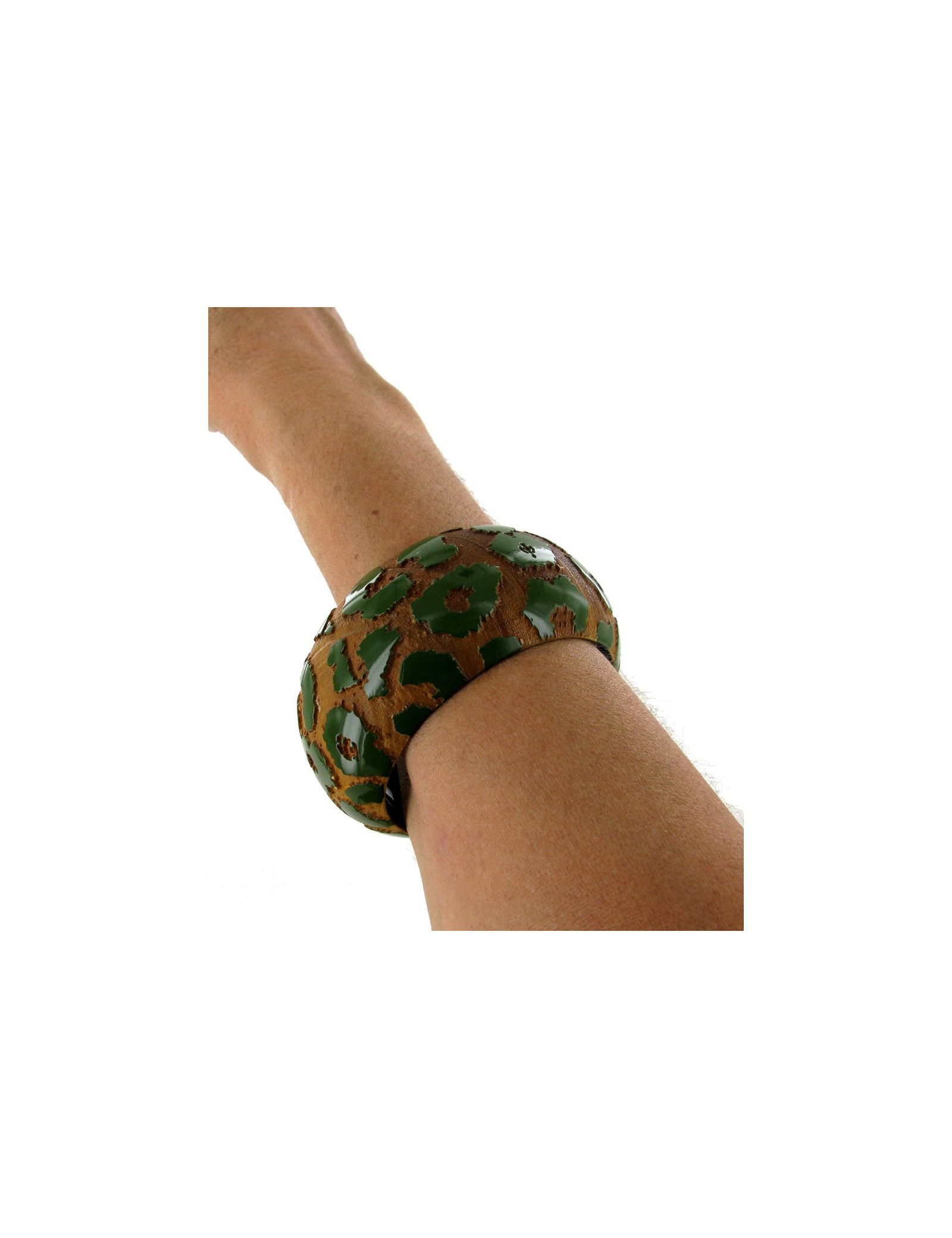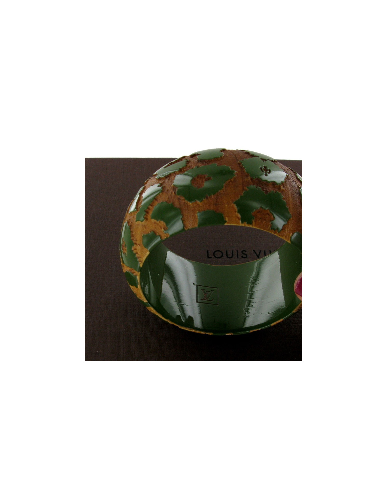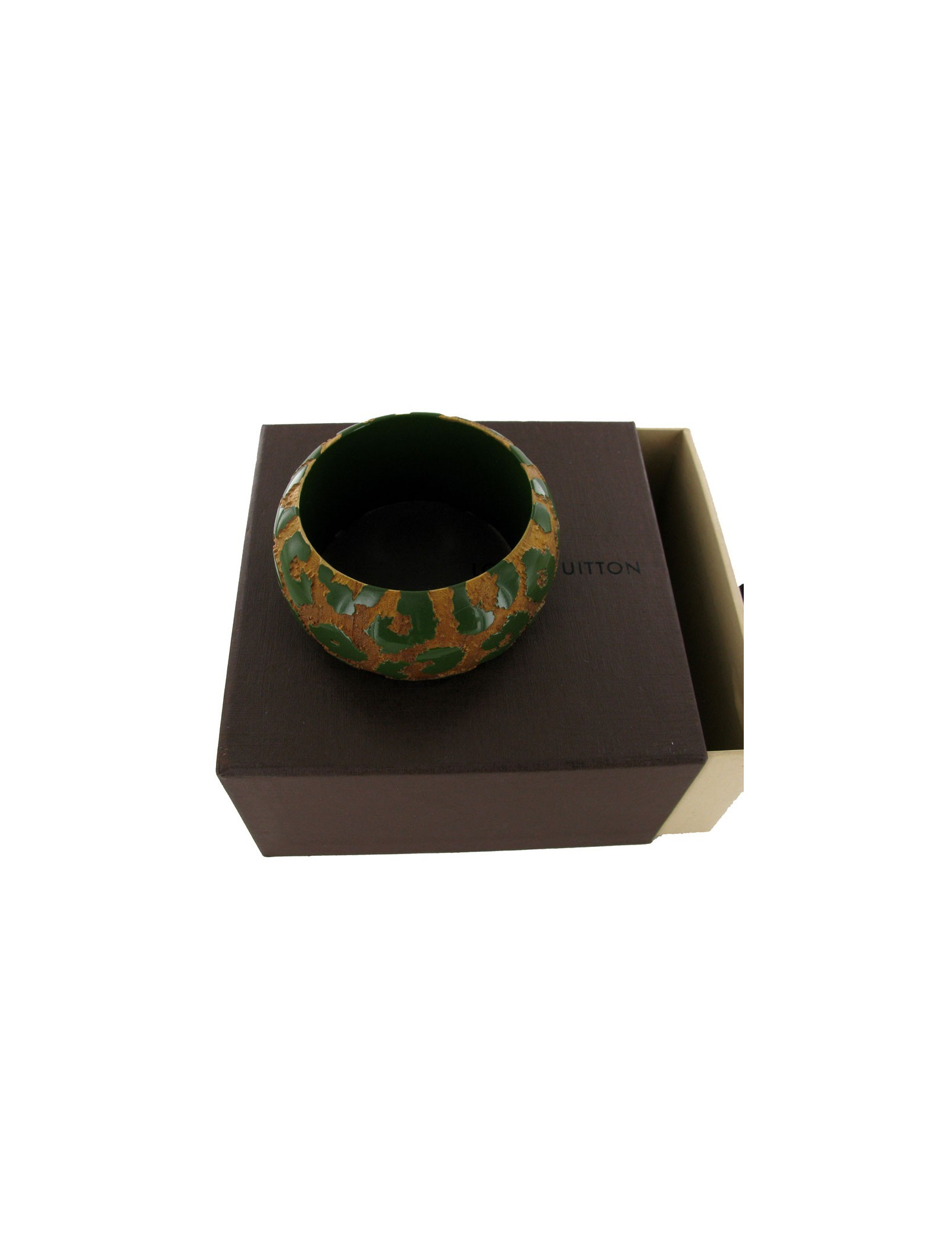 Bracelet fantaisie "Camouflage" LOUIS VUITTON en bois de couleur naturel et vert. Le sigle "LV" est gravé à l'intérieur. Pas de traces d'usure à signaler. Livré dans sa boîte d'origine.