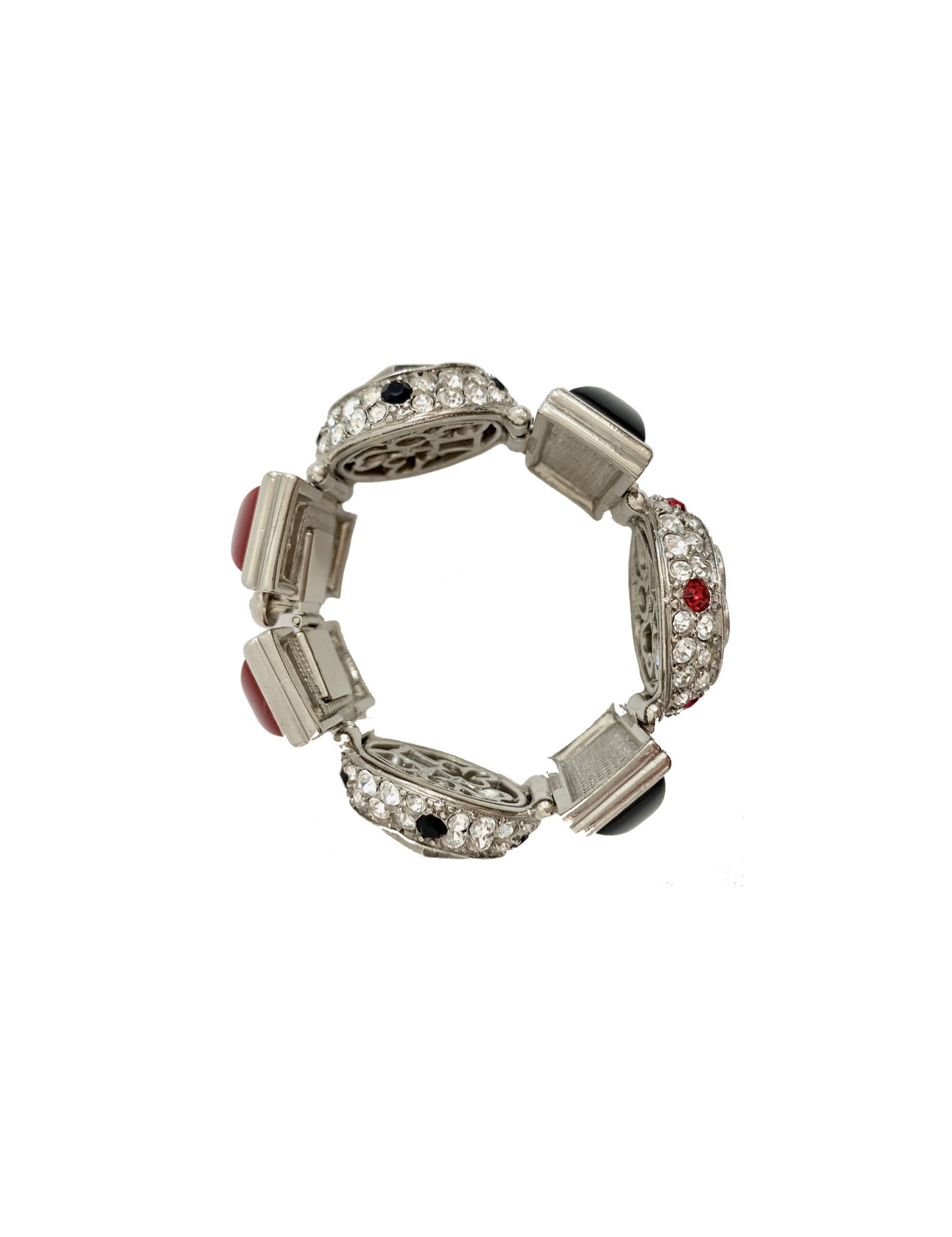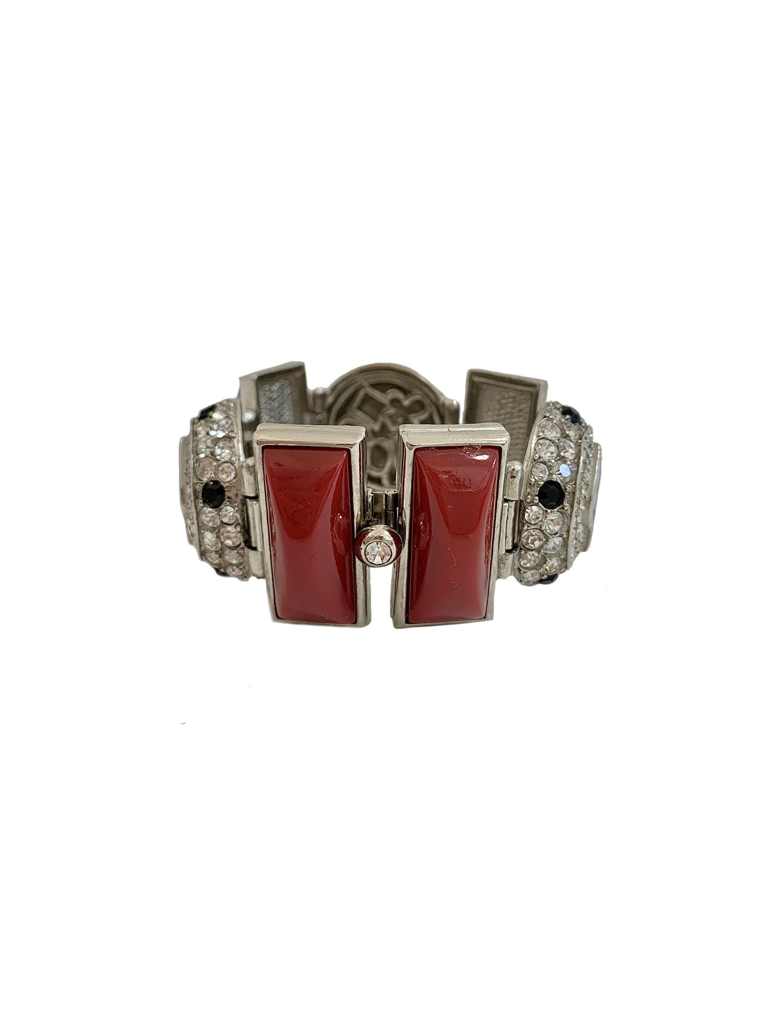 Superbe bracelet articulé de la Maison CHRISTIAN DIOR de l'époque Gianfranco Férre, en métal argenté agrémenté de pièces rectangulaires en résine rouge et noire, des éléments circulaires sertis entièrement de strass blancs, rouges et noirs. Epoque Gianfranco Ferré.
