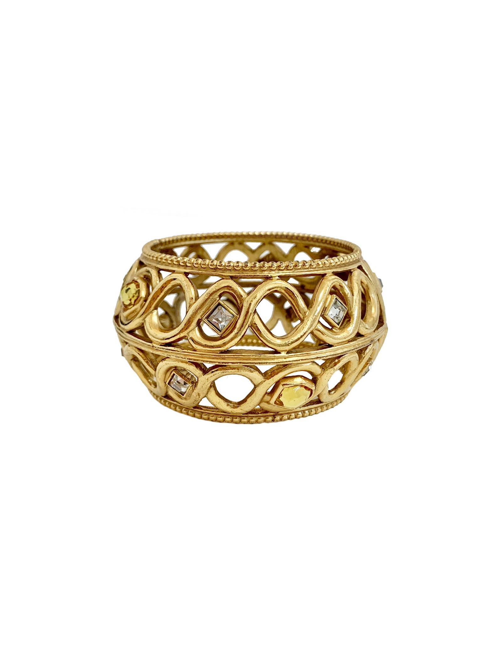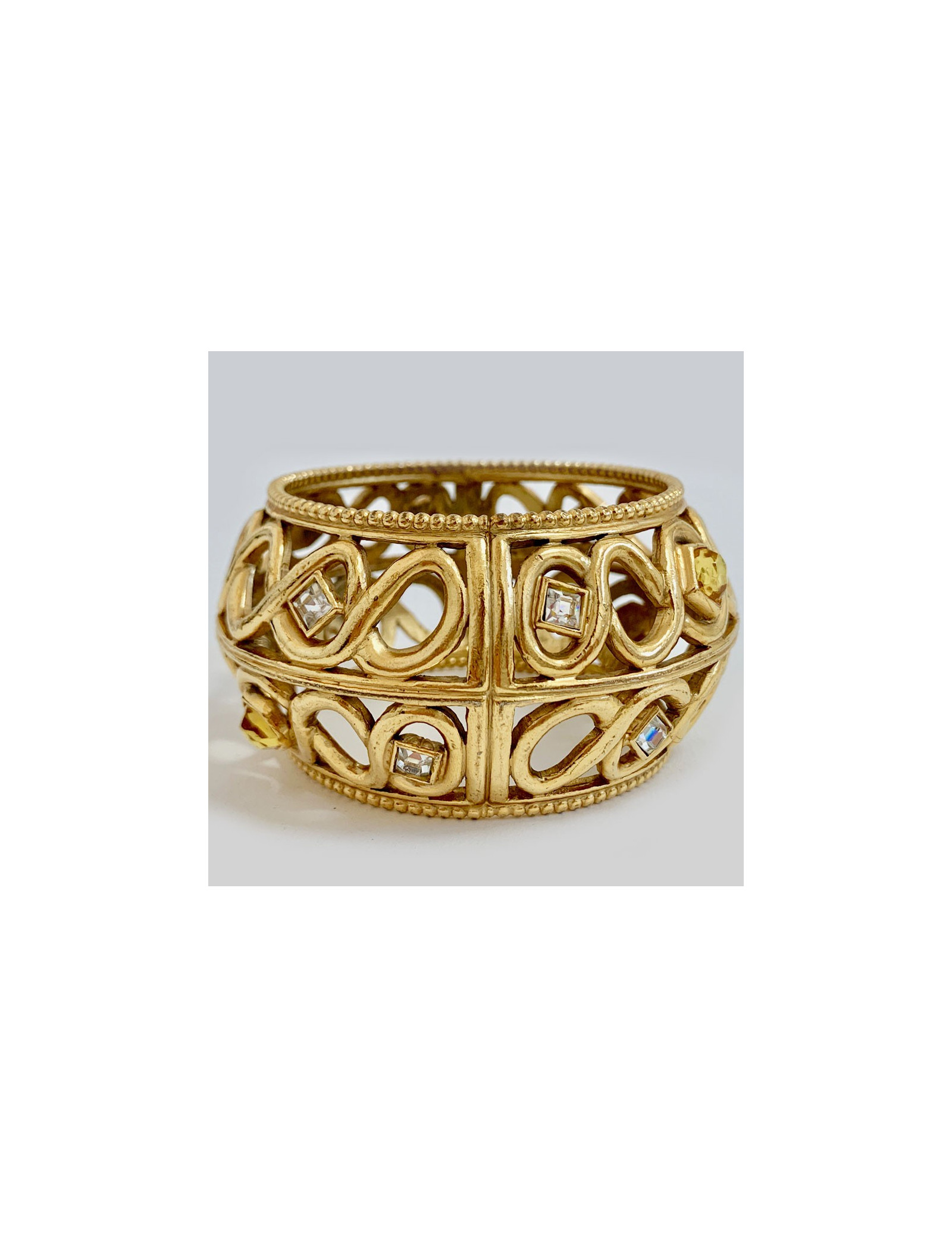 Très belle manchette Vintage ajourée, non signée attribuée à Gianfranco Ferré pour la Maison DIOR, en métal doré serti de quelques strass blanc et jaune. Elégante vous pouvez la porter seule ou superposer plusieurs manchettes. Manchette de défilé DIOR.