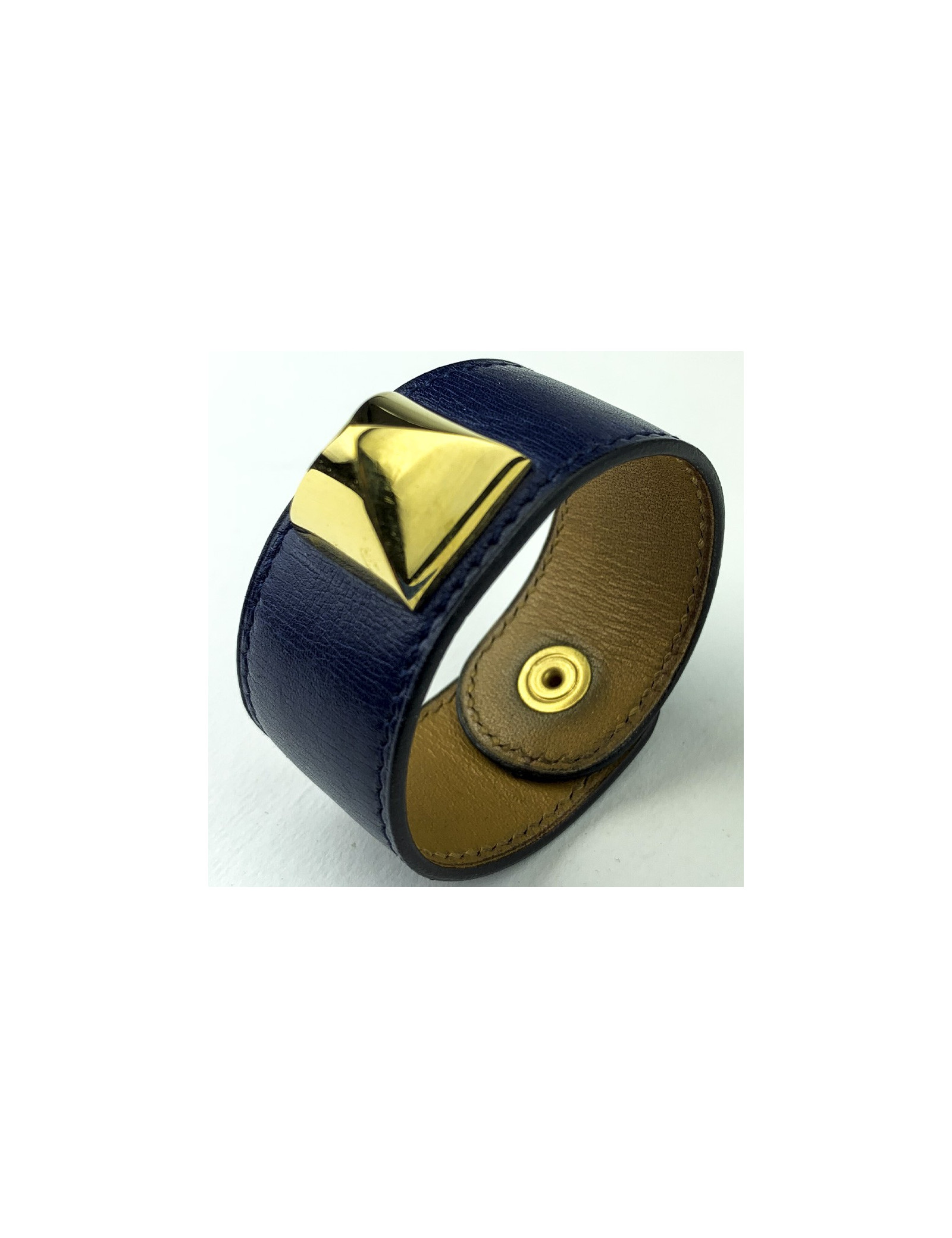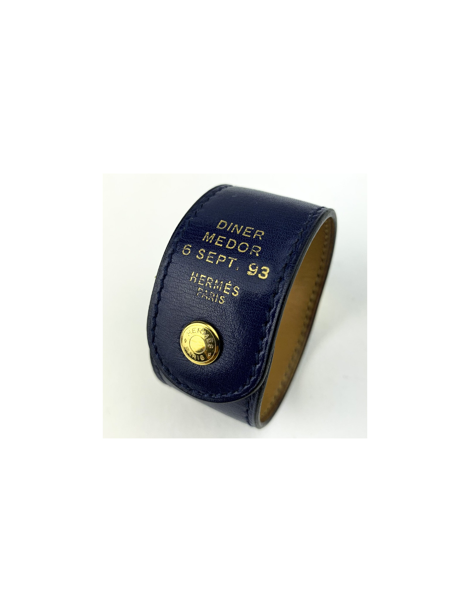 Le bracelet provient de la Maison HERMES. Il se compose d'une lanière de cuir bleu de Prusse agrémenté par le fameux clou Medor, ici en accastillage doré.