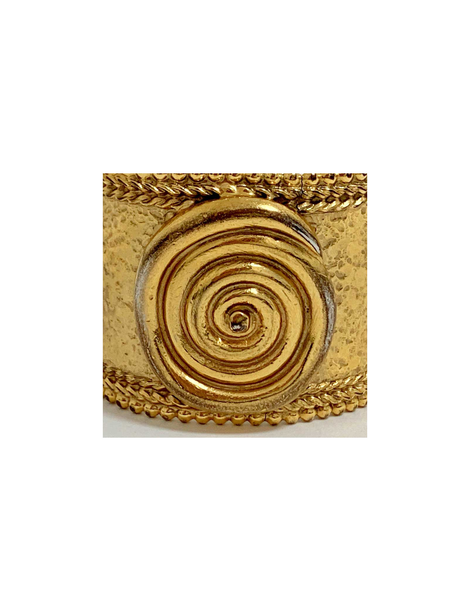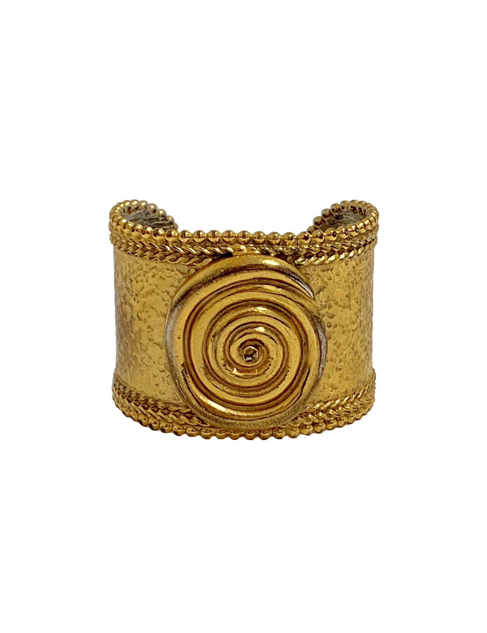 Superbe Manchette non signée attribuée à la Maison DIOR, pièce de défilé des collections Gianfranco Ferré (Directeur artistique de Christian Dior de 1988 à 1994). Elle est en métal doré avec un effet martelé. Une spirale en métal doré également se trouve en relief au centre du bijou.