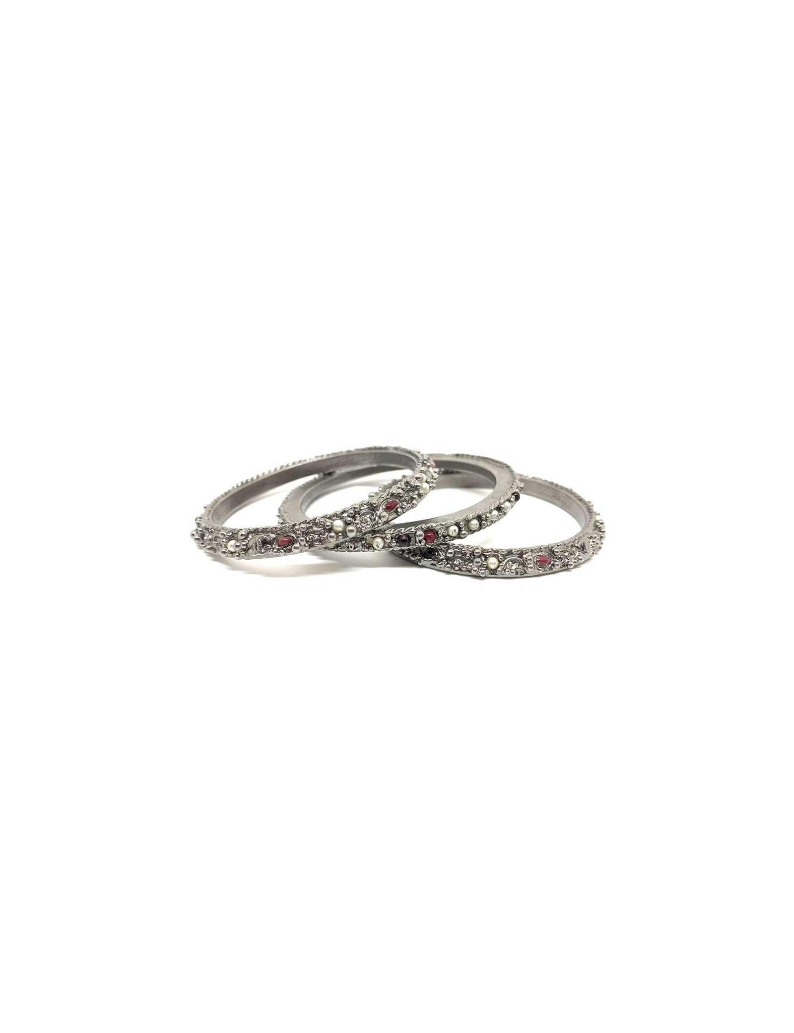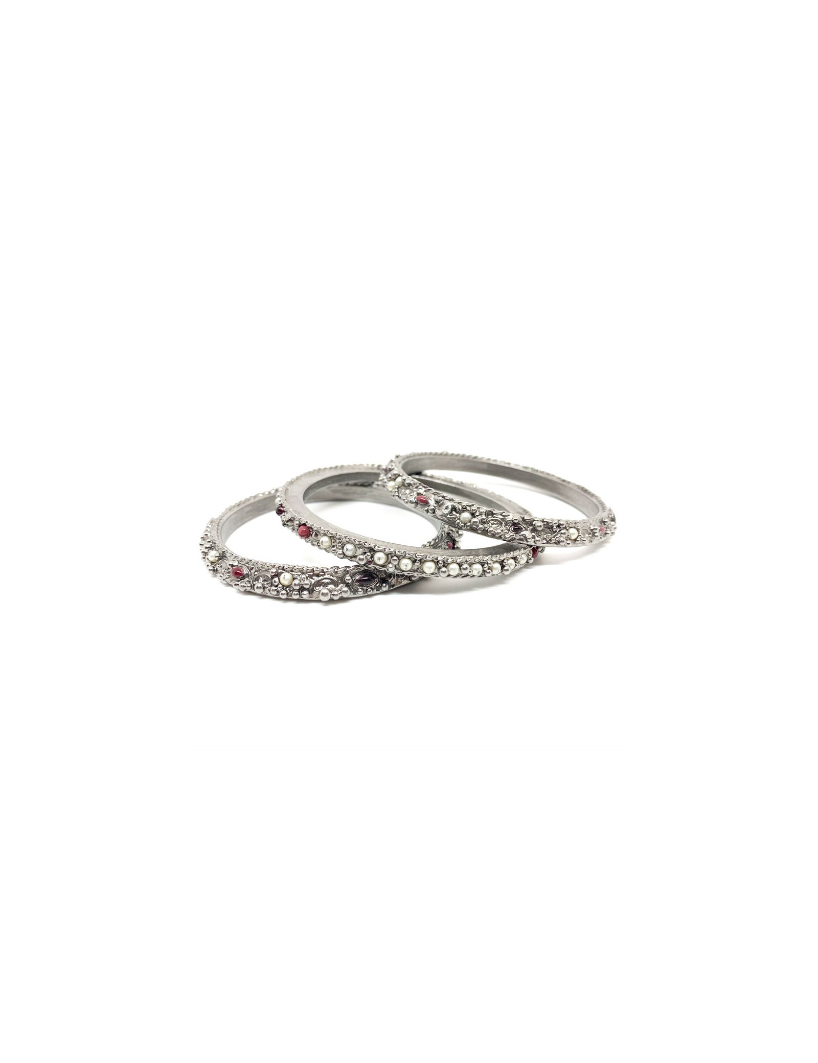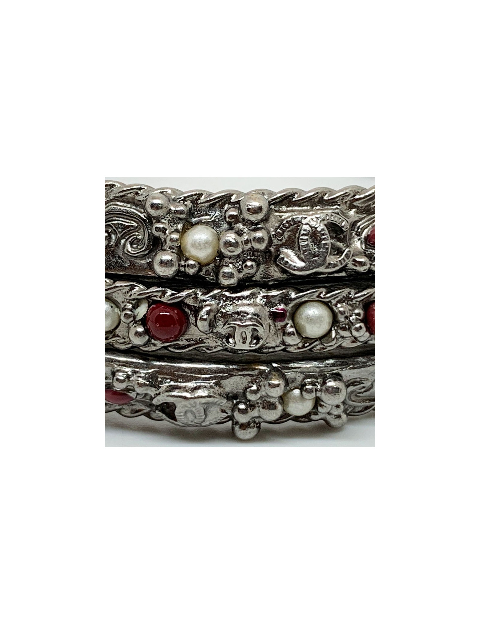Les bracelets proviennent de la Maison CHANEL. Chaque bracelet est en métal argenté, incrusté de petites perles nacrées et rouges. Deux bracelets sont identiques et le troisième plus fin que les deux autres. Ils se portent en symétrie, le plus fin au milieu des deux identiques. Chaque bracelet comporte le fameux CC gravé dans le métal.