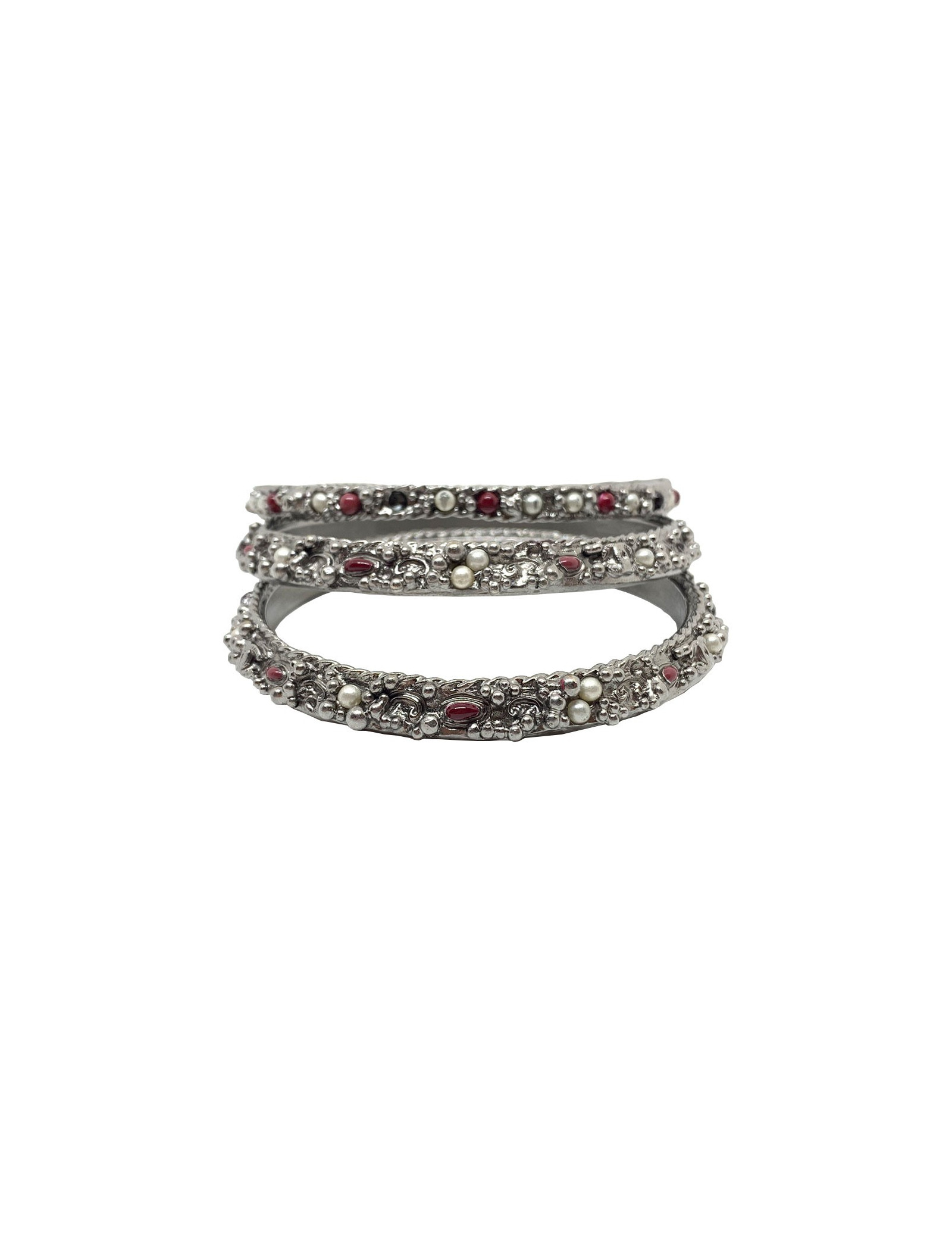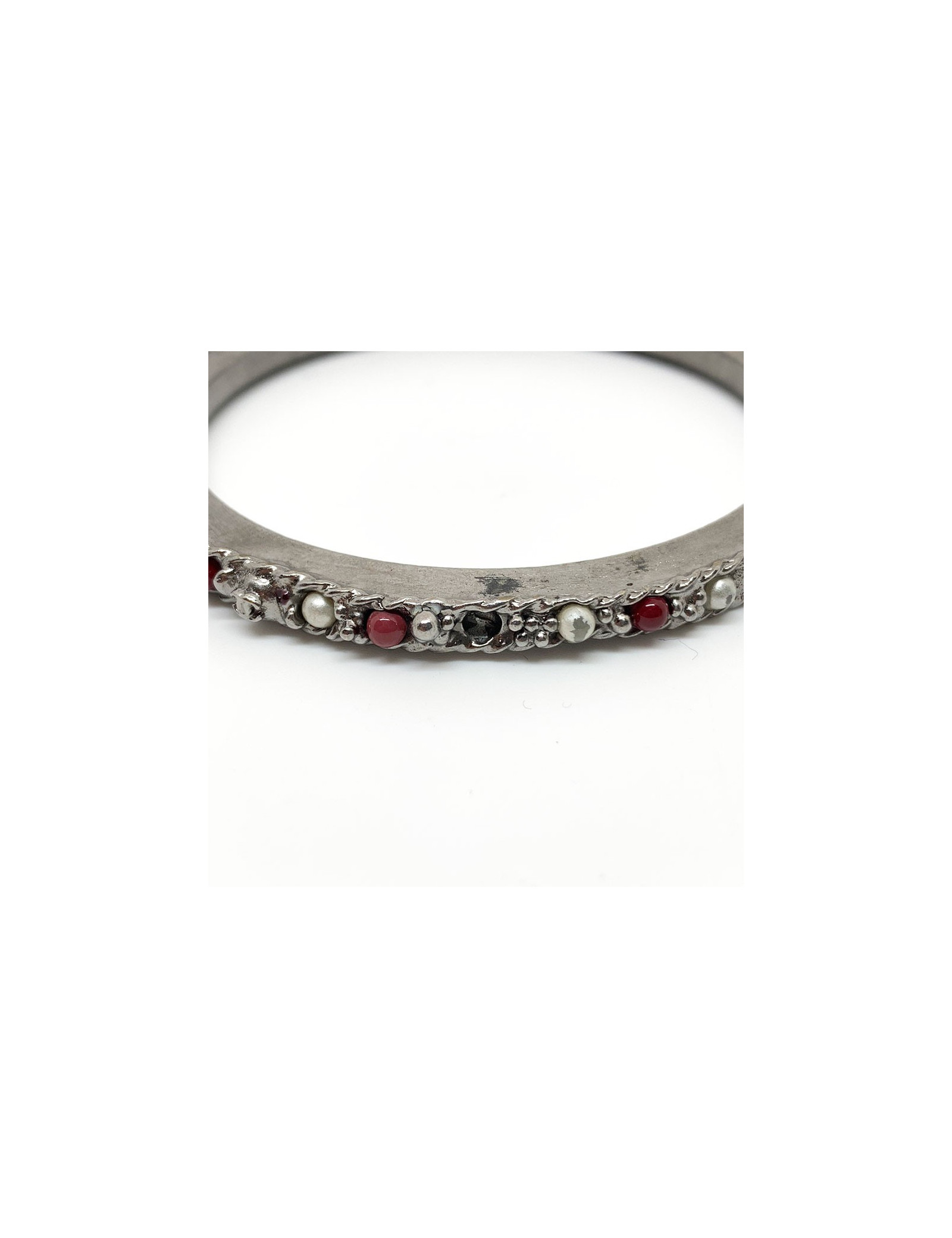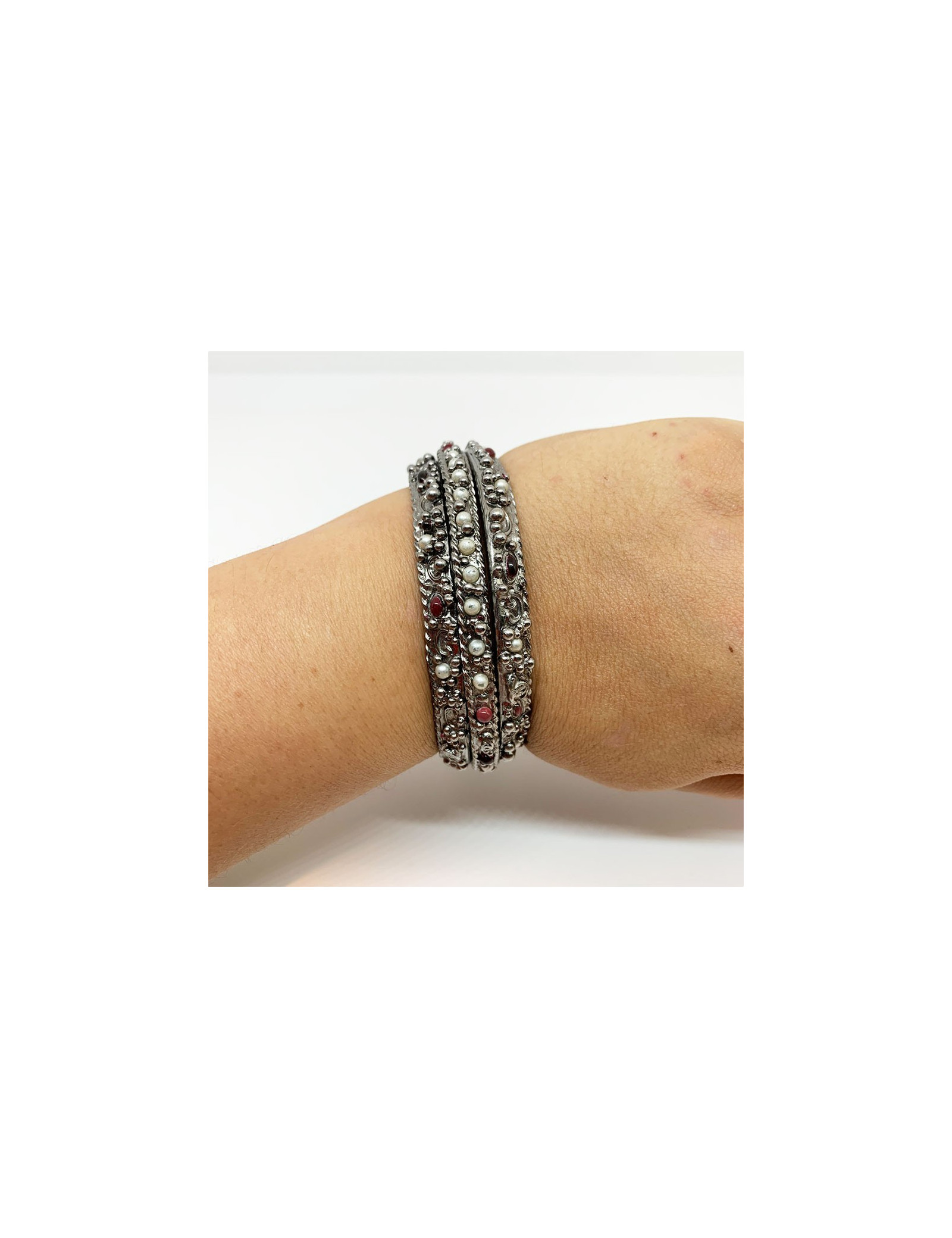 Les bracelets proviennent de la Maison CHANEL. Chaque bracelet est en métal argenté, incrusté de petites perles nacrées et rouges. Deux bracelets sont identiques et le troisième plus fin que les deux autres. Ils se portent en symétrie, le plus fin au milieu des deux identiques. Chaque bracelet comporte le fameux CC gravé dans le métal.