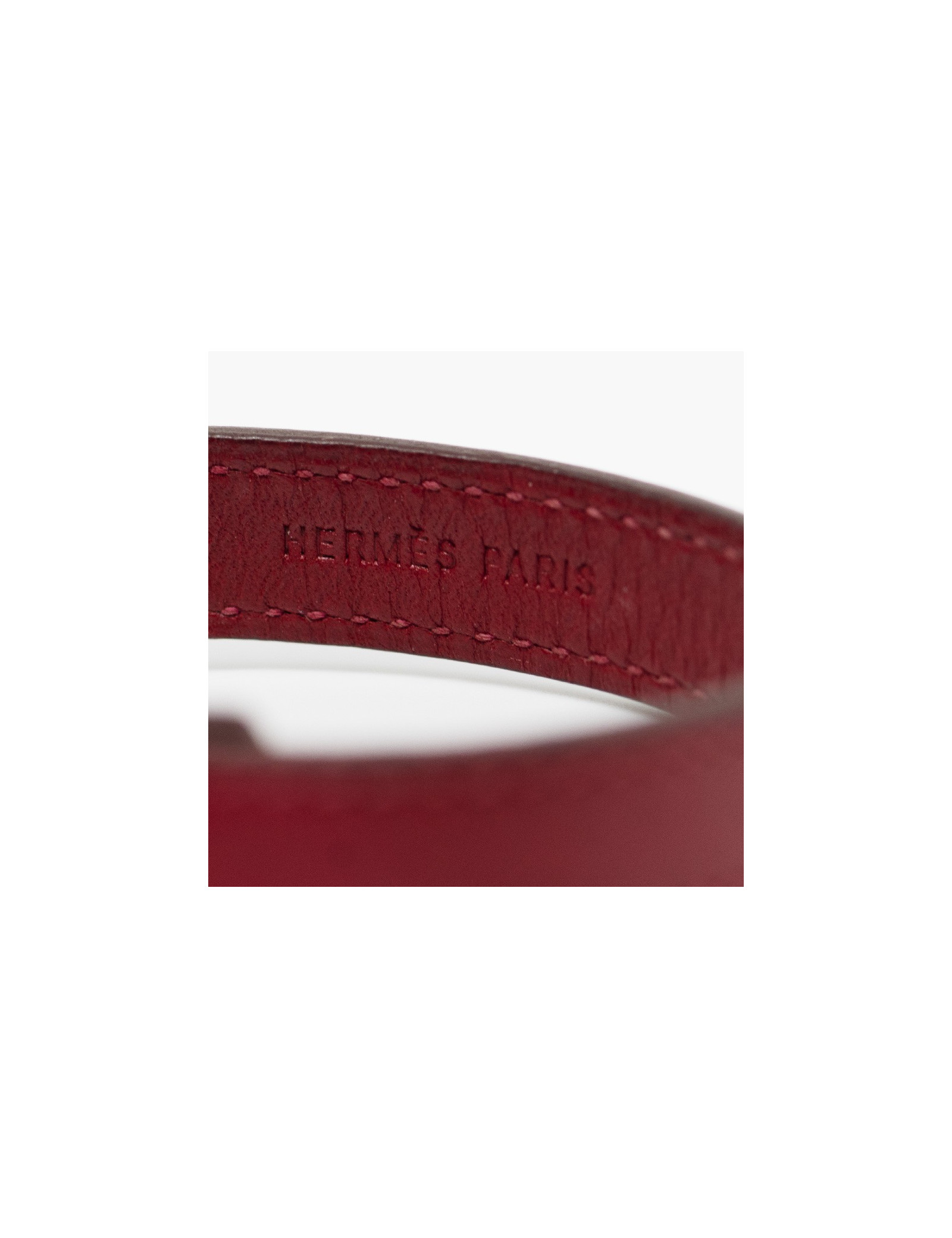 Le bracelet est un modèle "clou de selle" de la maison HERMES. Son cuir est de couleur rouge cerise et son fermoir clou de selle en métal argent palladié. Le clou comporte l'inscription HERMES PARIS.