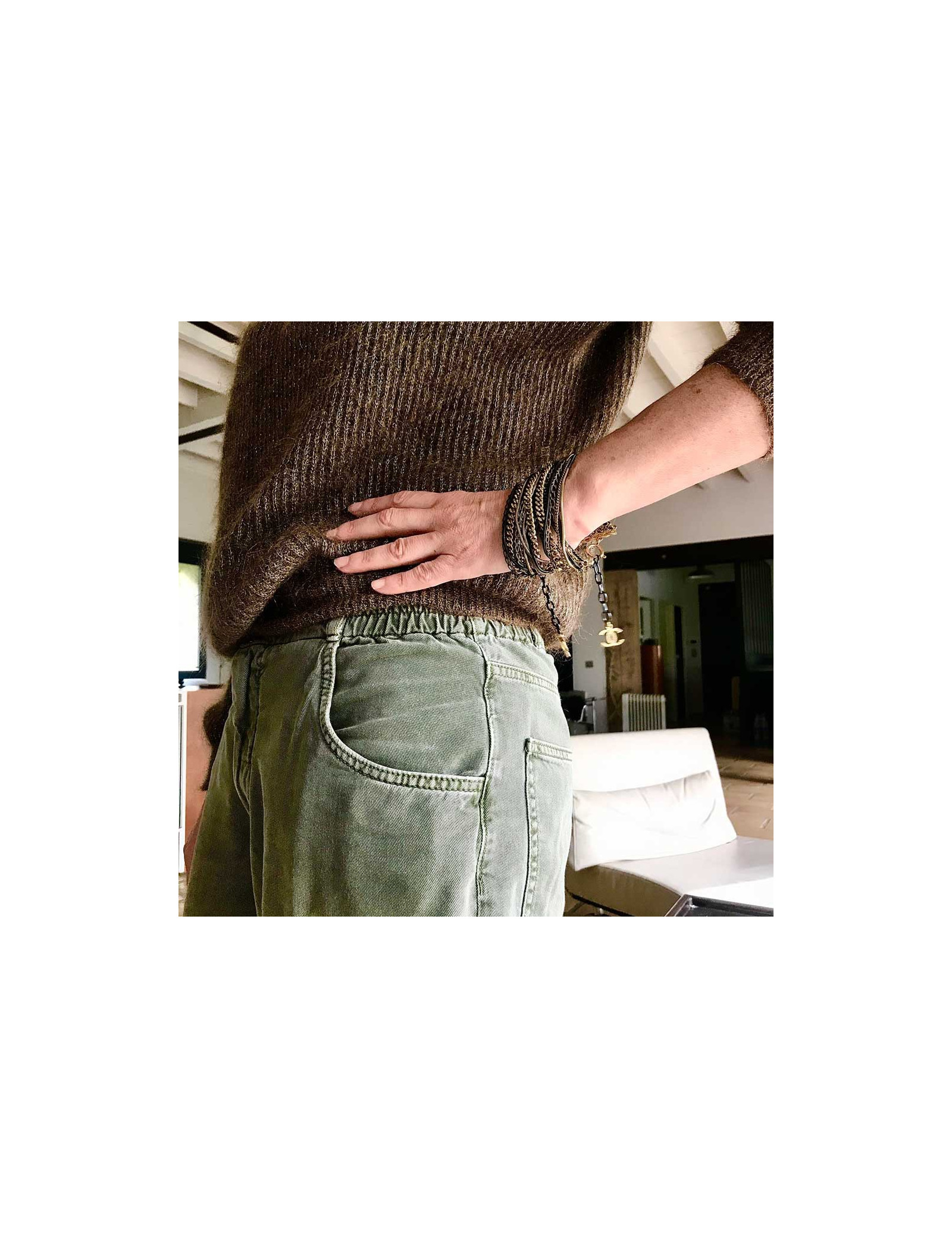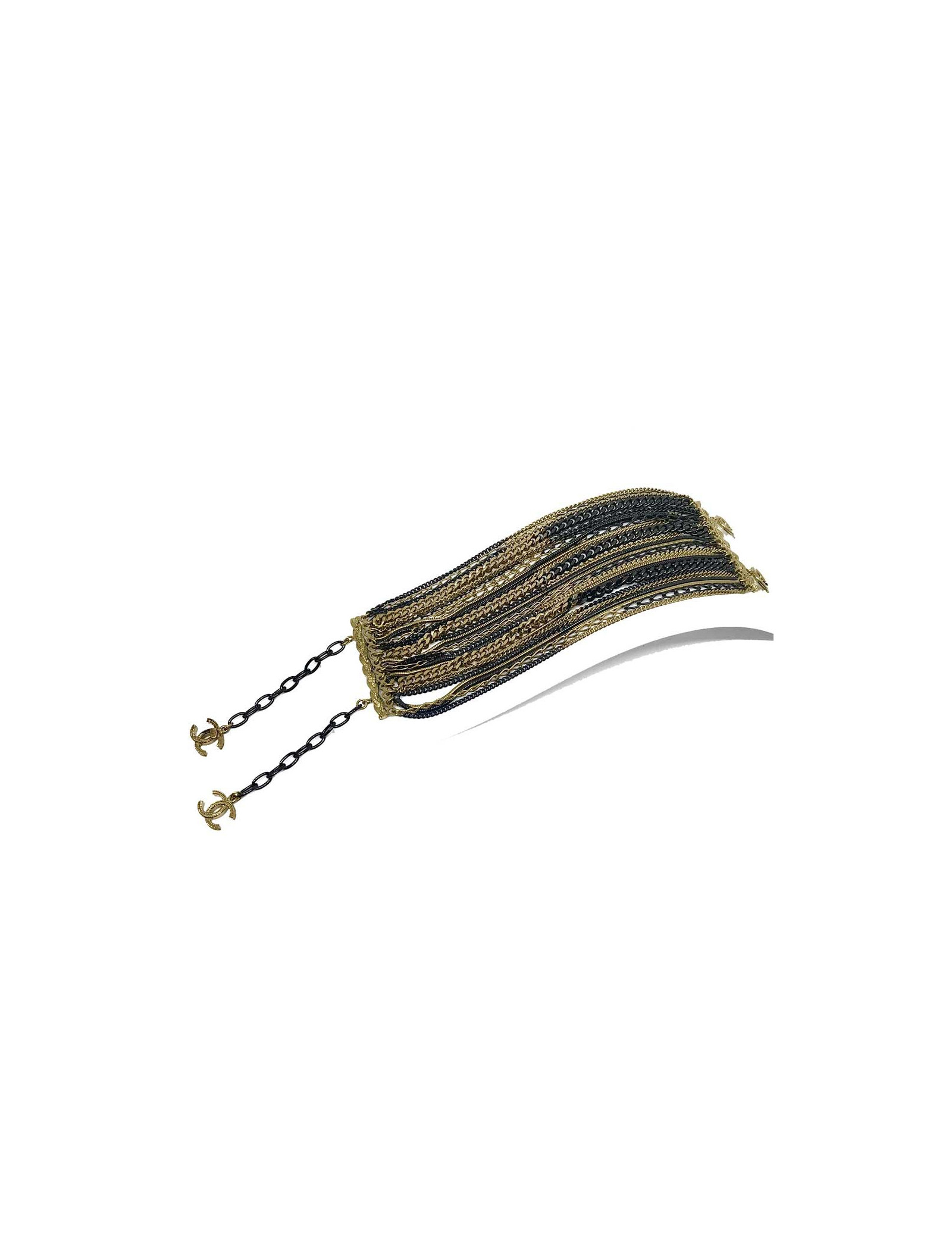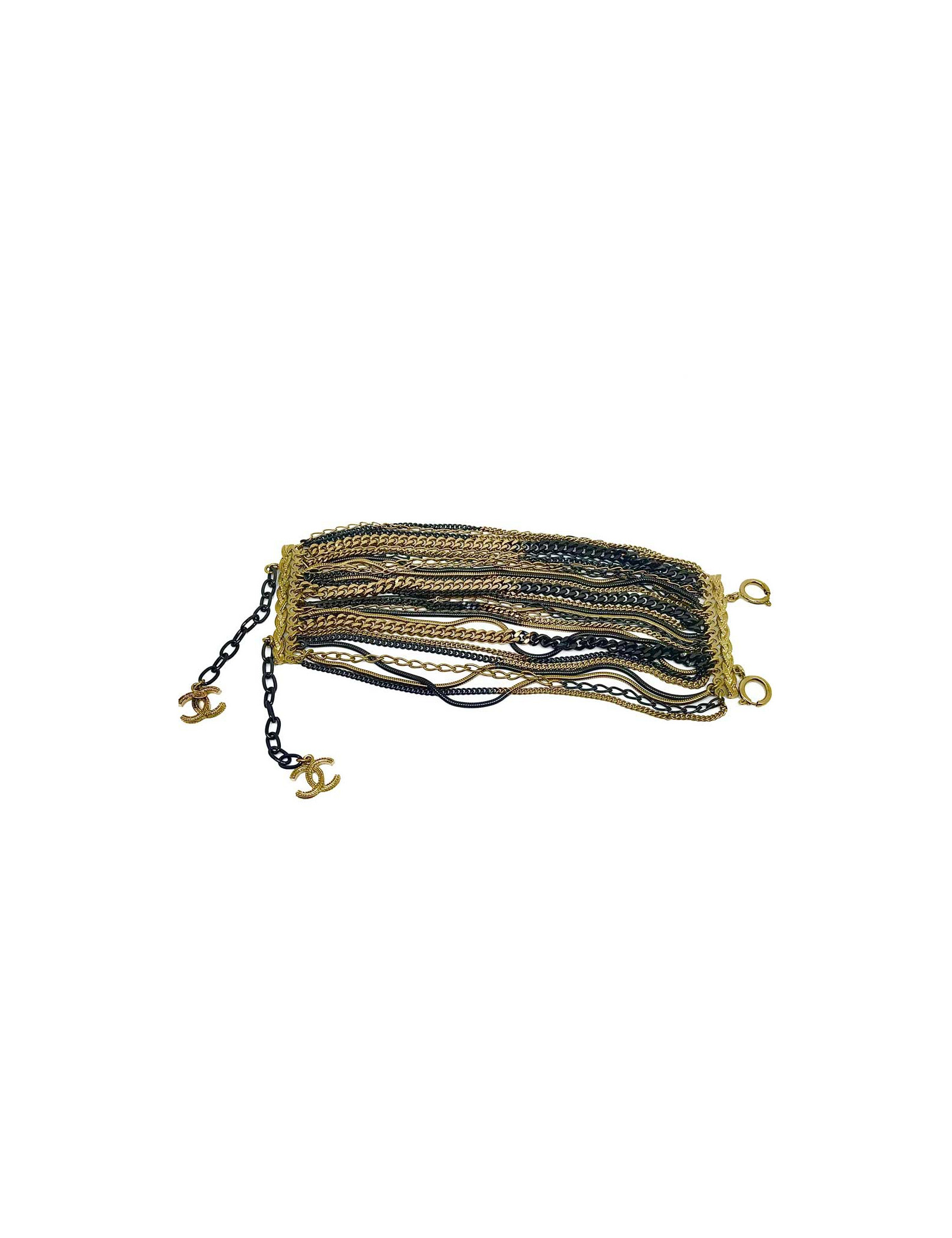 Bracelet manchette composé de multiples chaines de couleur or vieilli et ruthenium (métal noir). Présence du stamp Chanel, fermeture par double mousqueton.
