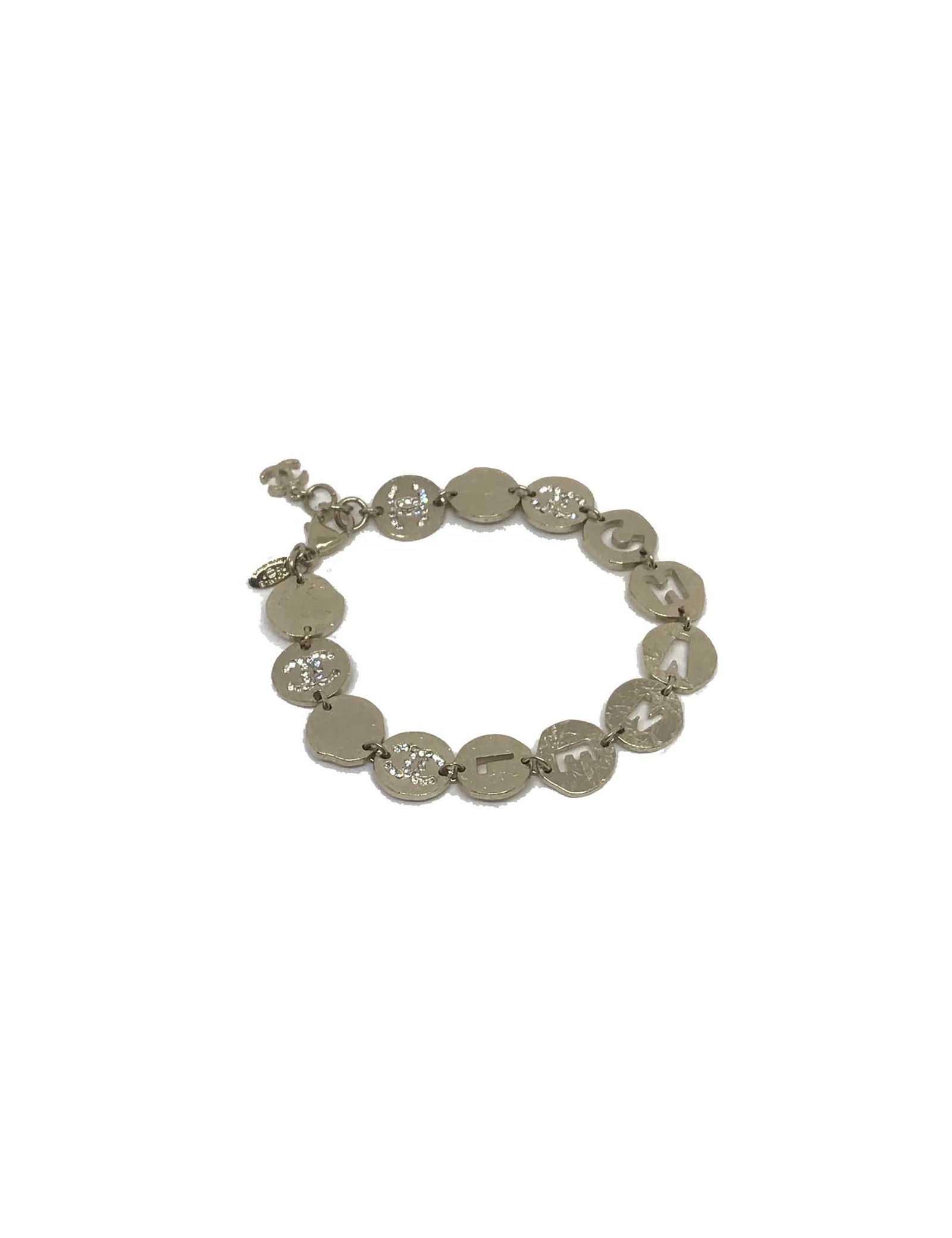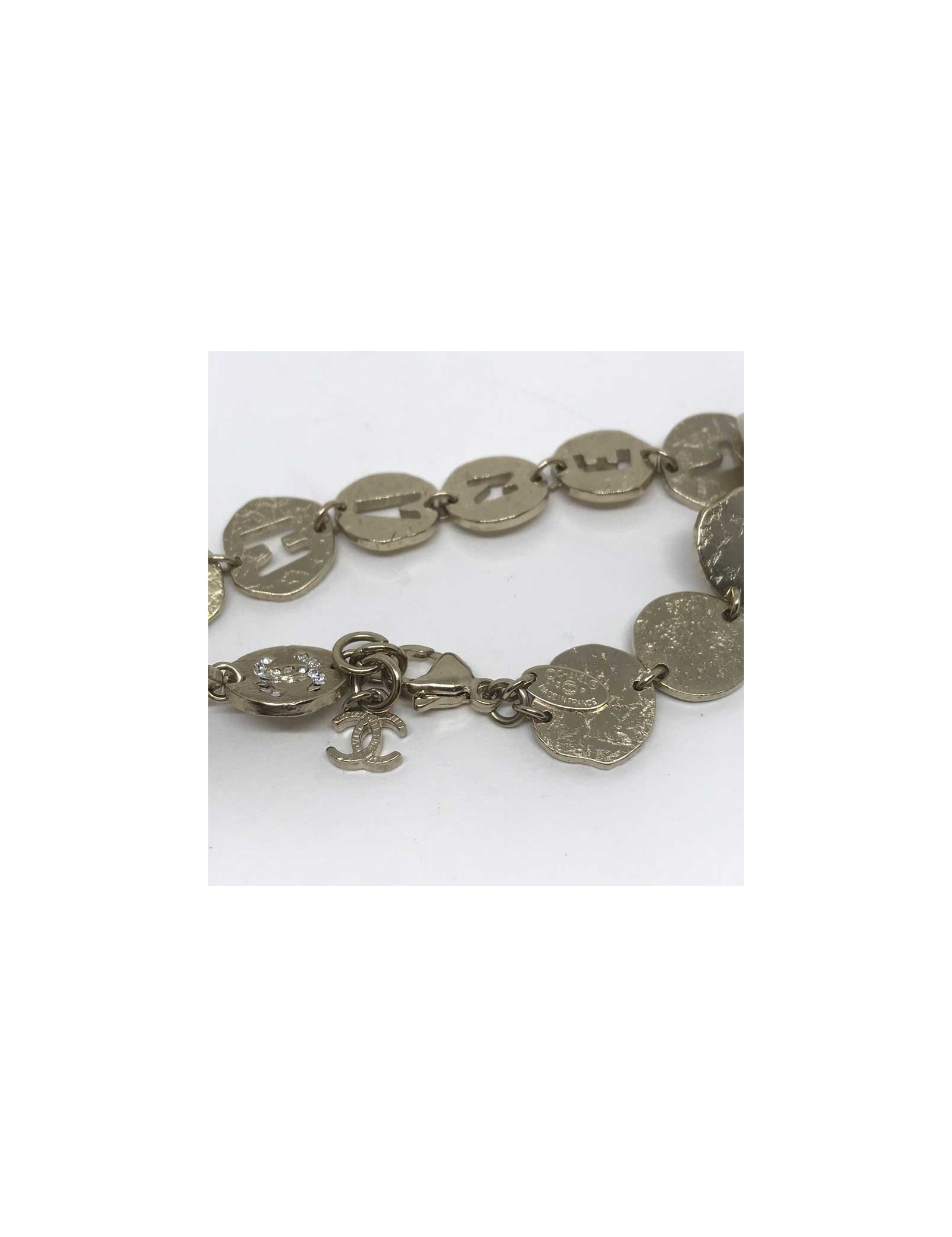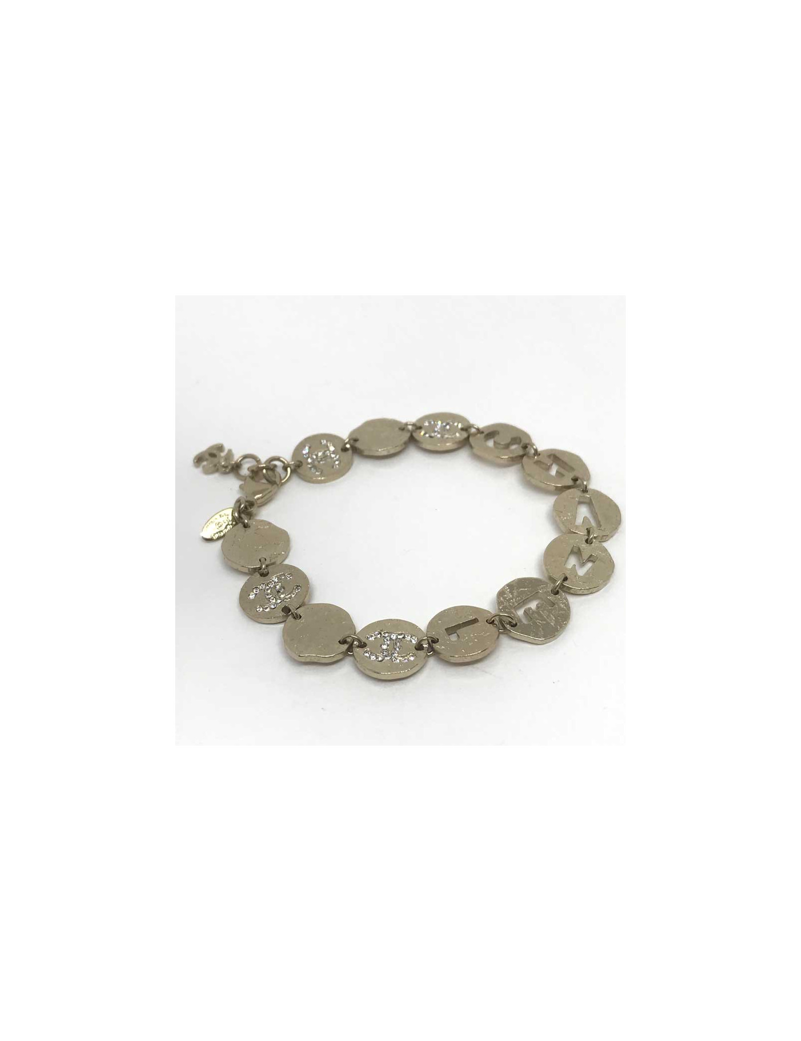 Ce bracelet CHANEL est composé de 13 cercles en métal frappé de couleur dorée. Les cercles du milieu du bracelet sont ajourés des lettres C, H, A, N, E, L pour former le mot CHANEL. Quatre cercles du bracelet sont strassés d'un double C. Le bracelet est agréable à porter, pas trop lourd, ni trop léger. Il peut se porter seul ou être accompagné d'autres bijoux Chanel, comme de belles perles.
