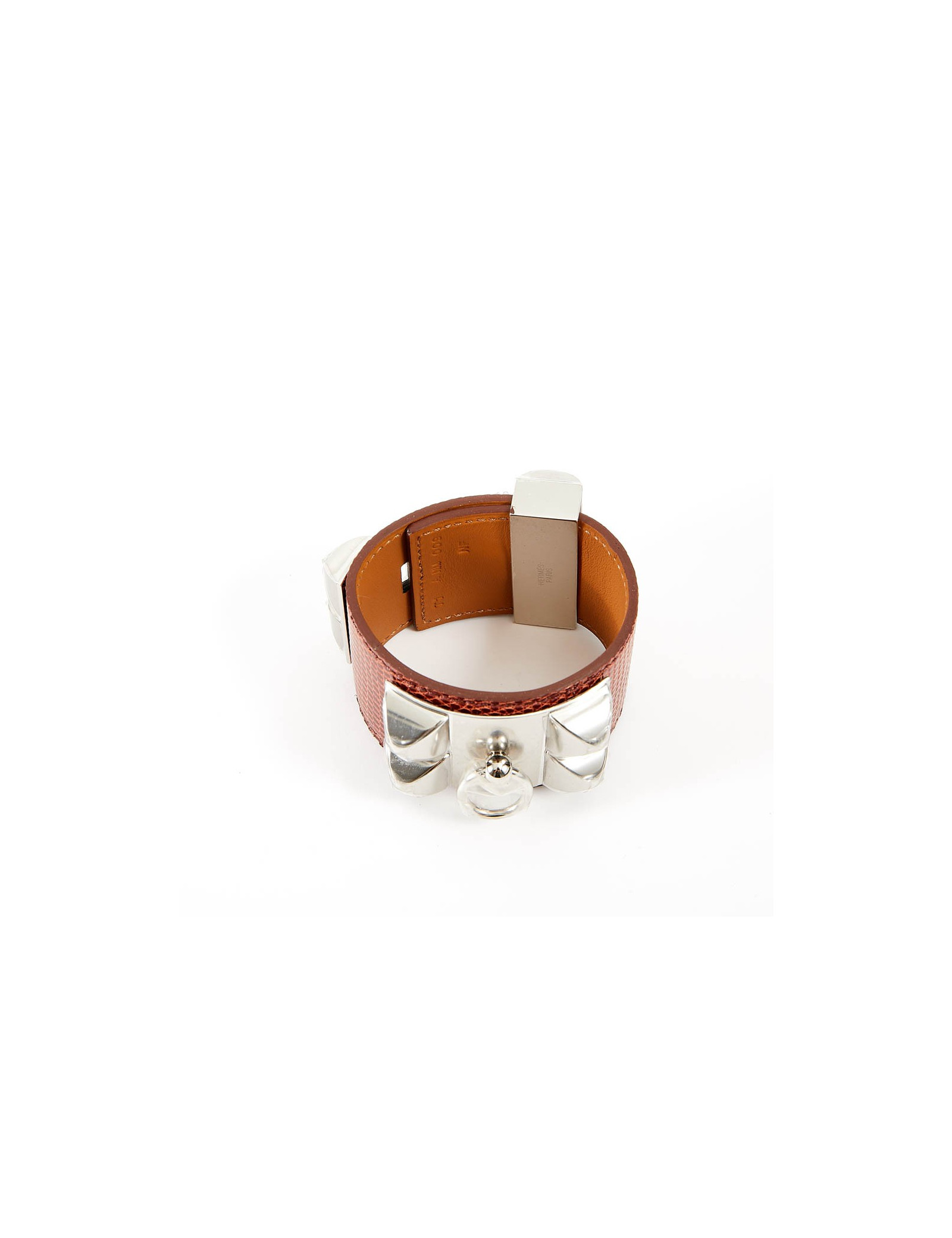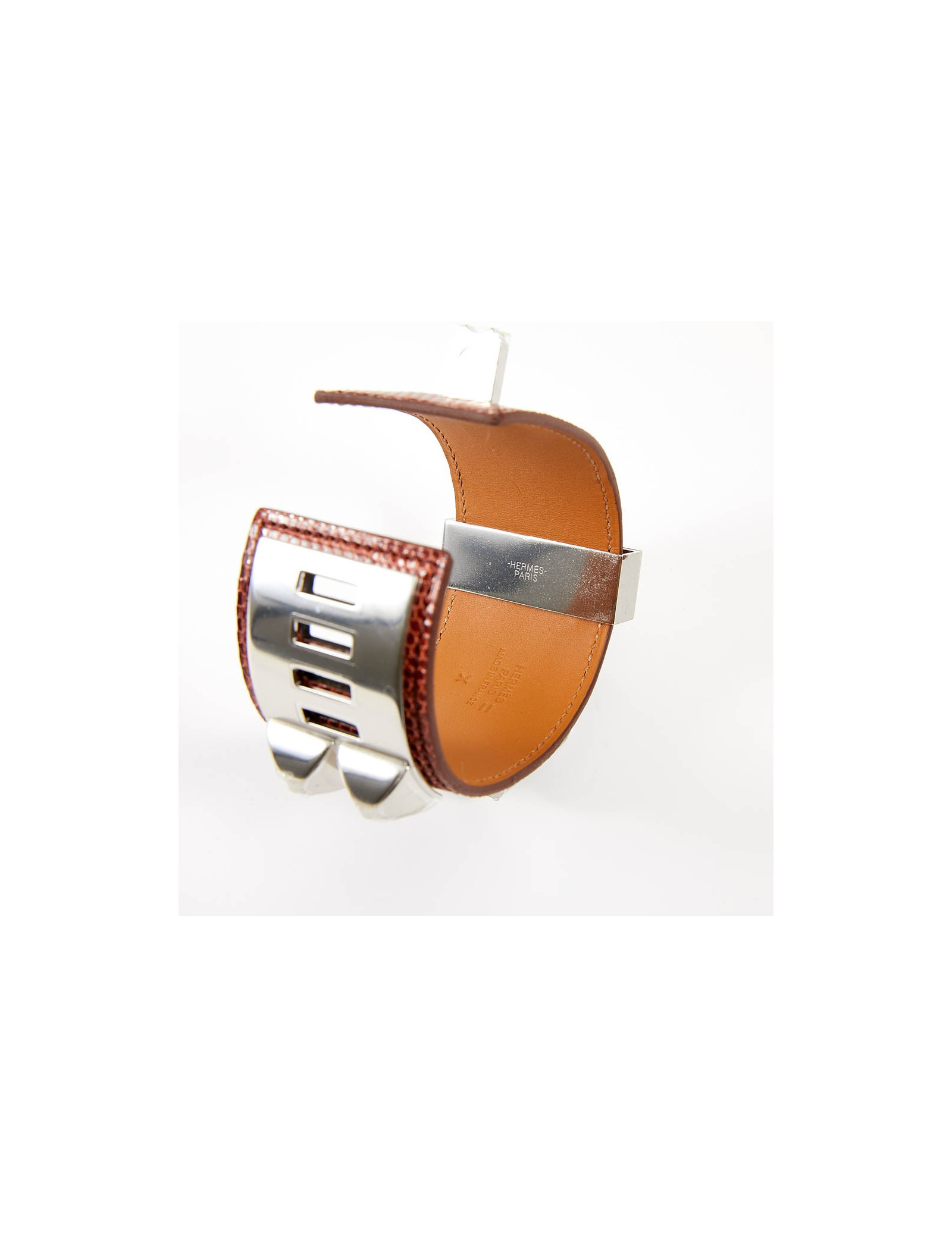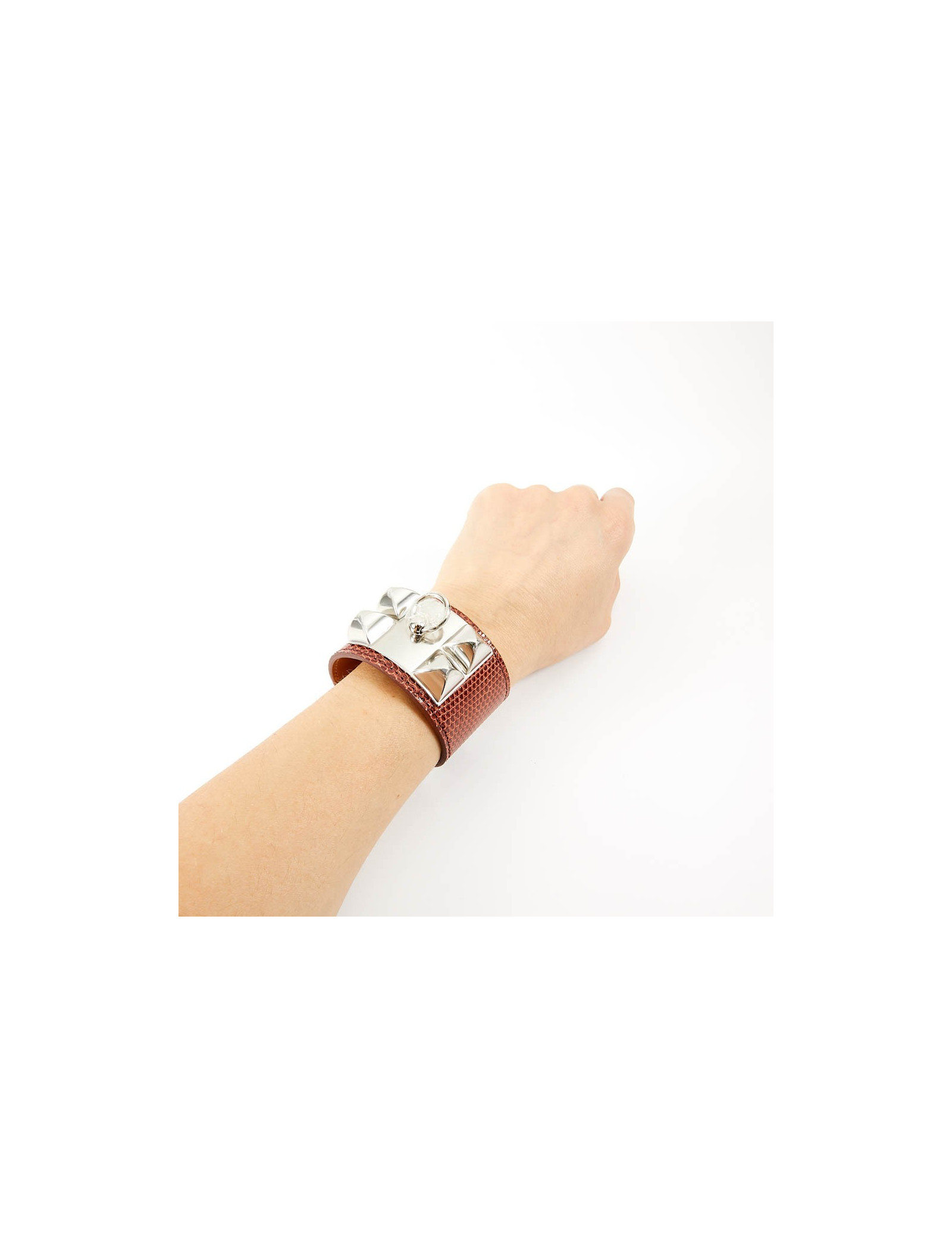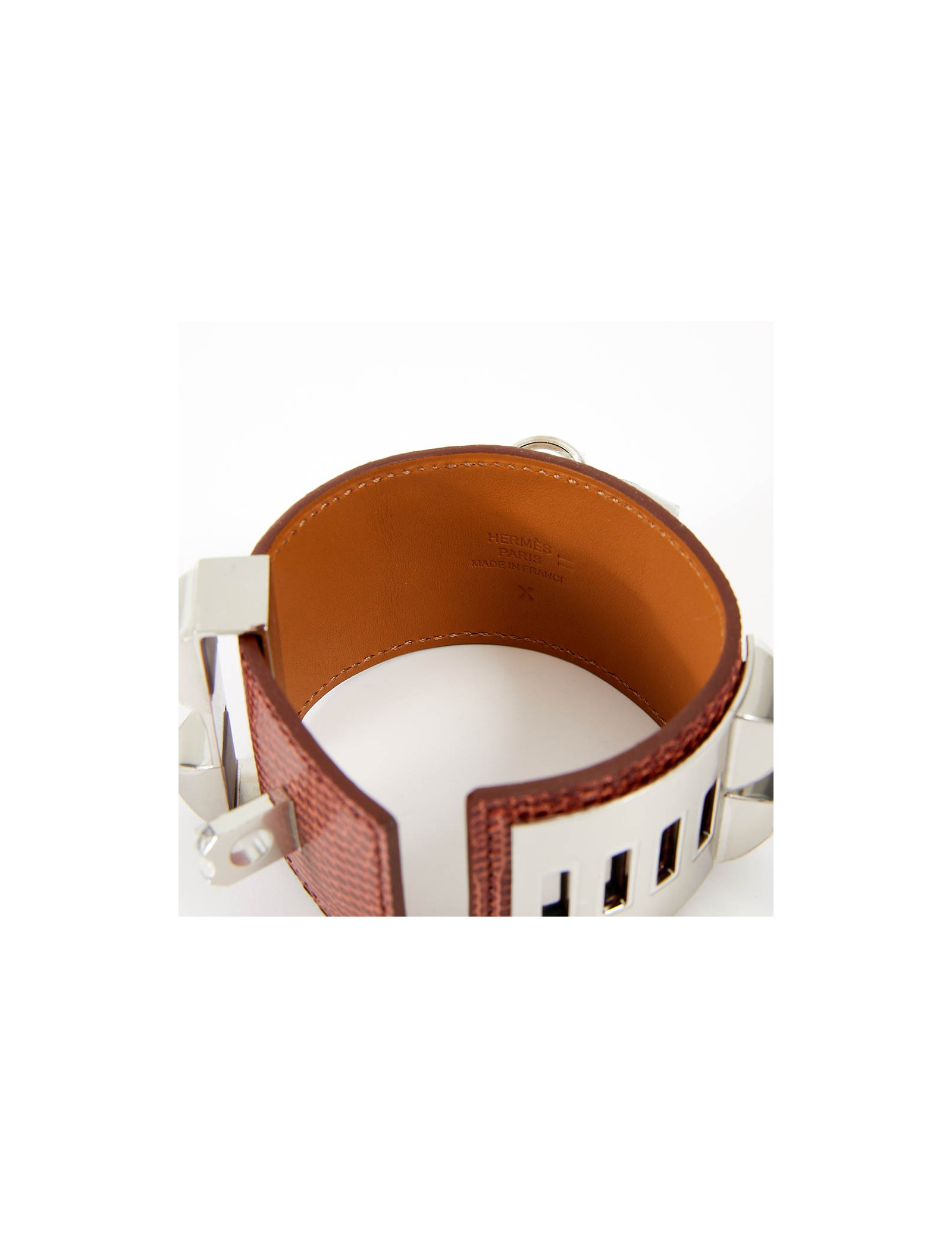 La manchette CDC est de la Maison Hermes. Un intemporel qui saura toujours donner une touche sophistiquée et rock à votre tenue. Elle représente un collier de chien, ici en cuir lisse de lézard de couleur étrusque (rouge brique/foncé). La manchette proposée ici a un accastillage en laiton argent
