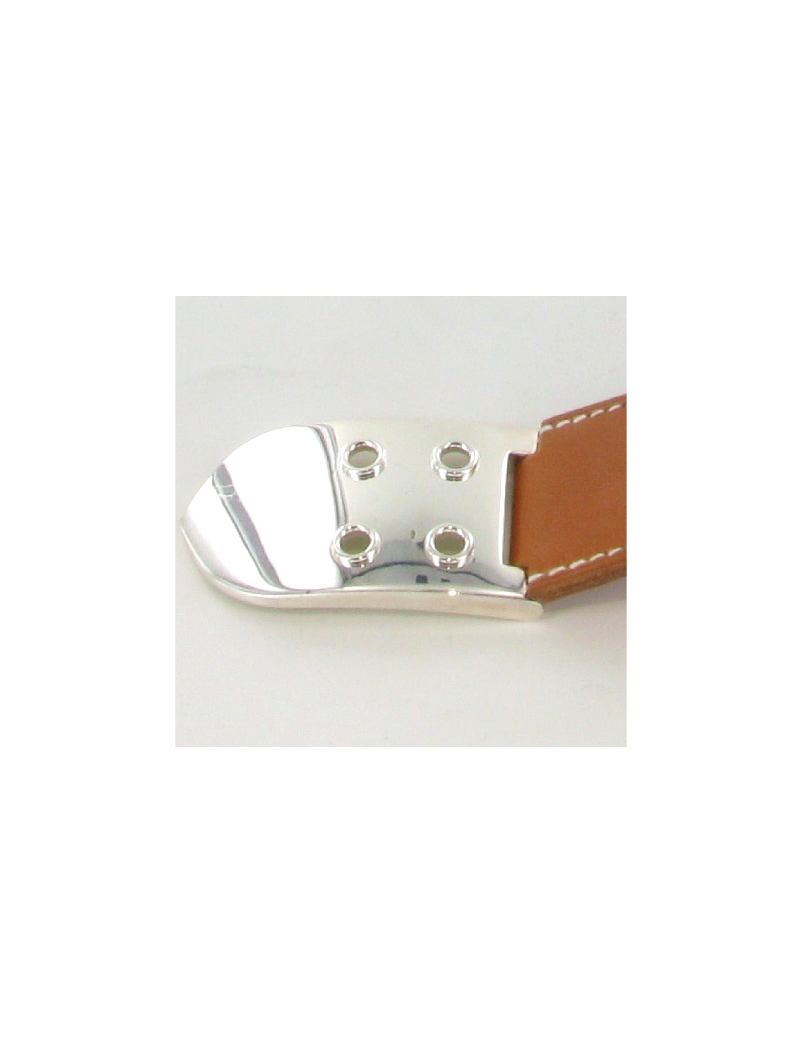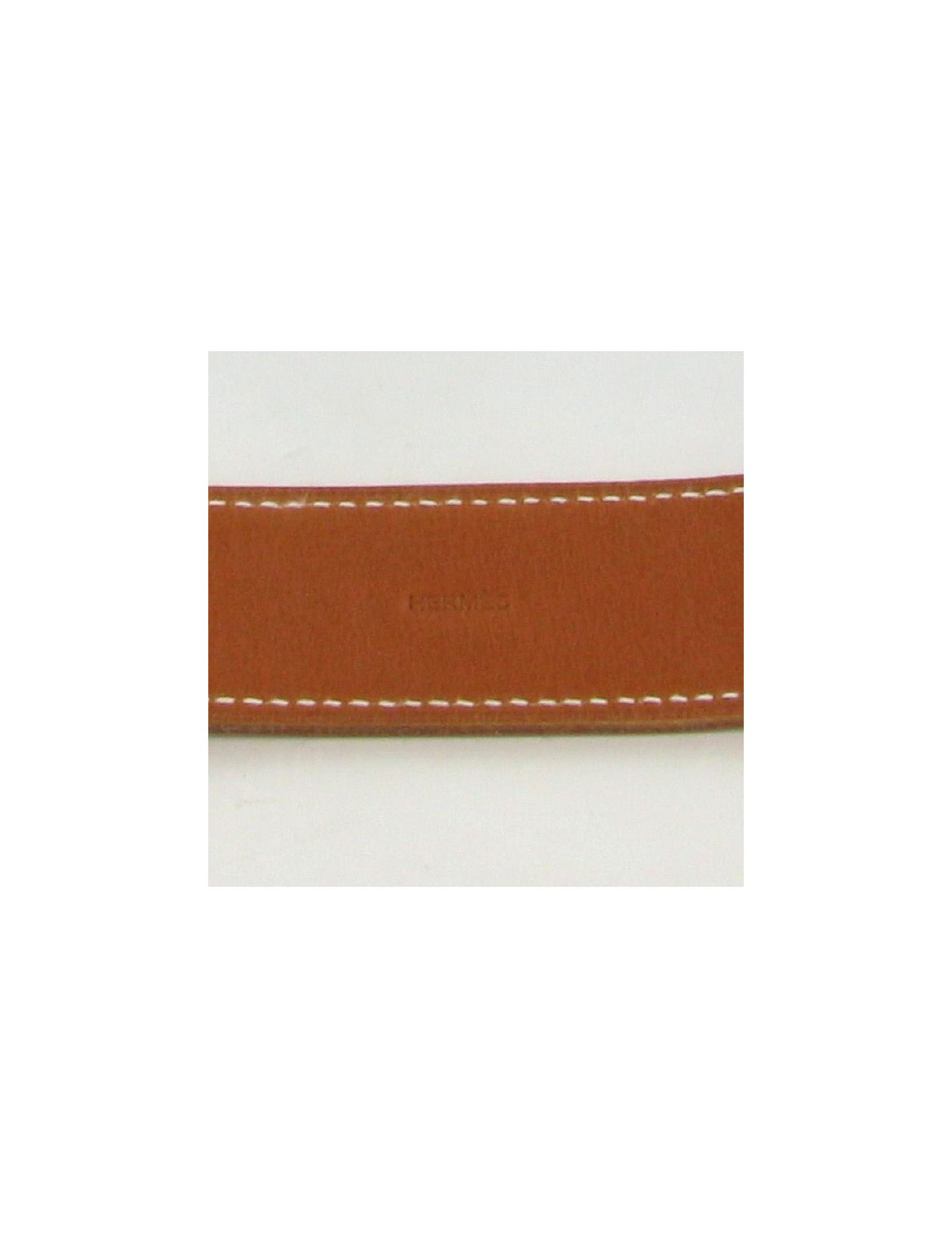 Bracelet HERMES, modèle Boucle Sellier, grand modèle, boucle argent, en cuir naturel camel. Taille GM . Deux longueurs possibles. Le cuir est bordé de piqûres sellier. Micro-rayures d'usage En très bon état, ce magnifique bracelet est fourni dans son dustbag Hermès . Poids argent : 81 grammes - Longueur : 22 cm - hauteur 2.8 cm
