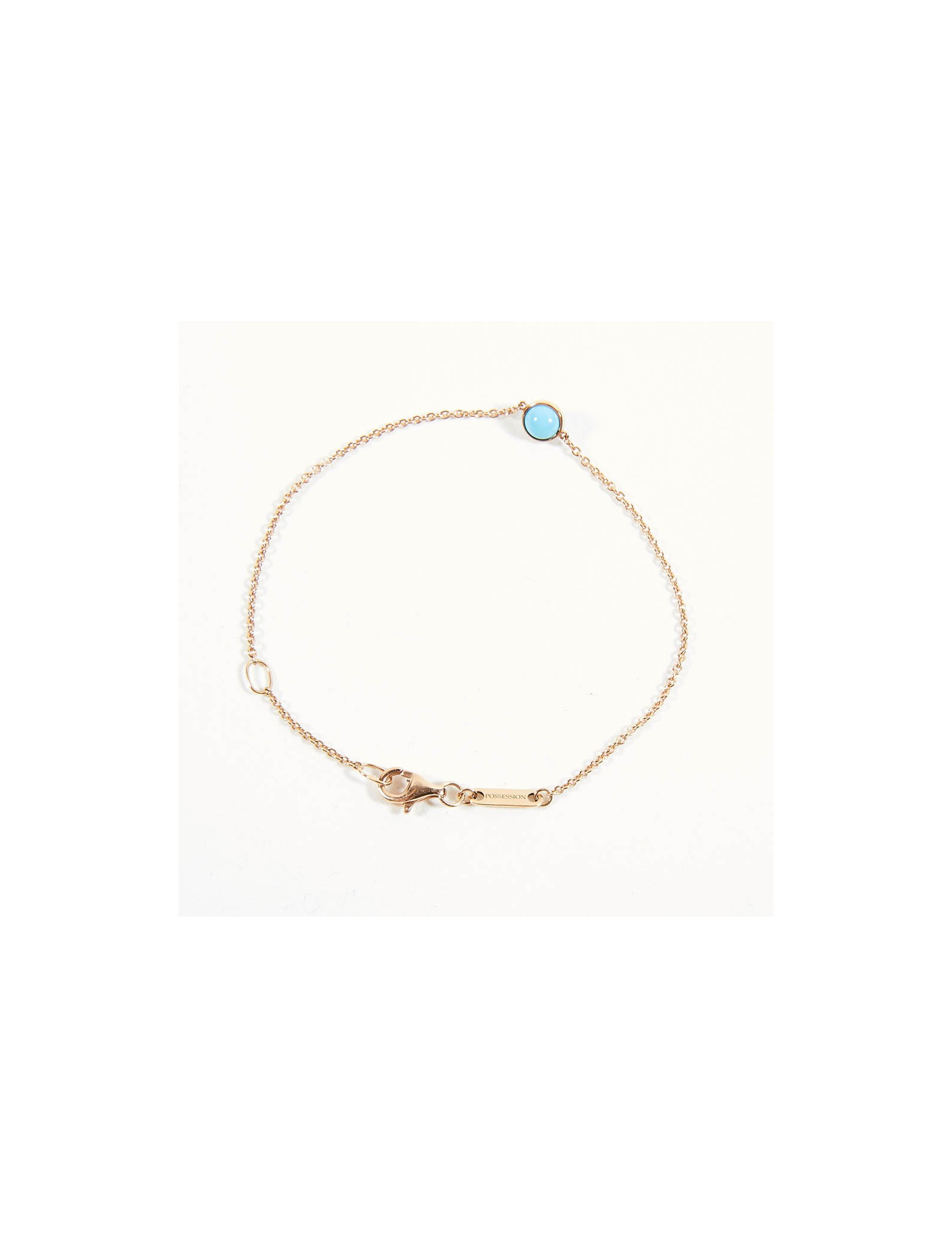 Ce bracelet est en or rose. Or 18K. C'est une fine chaîne. Il est sertie d'un pierre fine turquoise stabilisée. Il a sa plaque avec l'inscription "Possession".