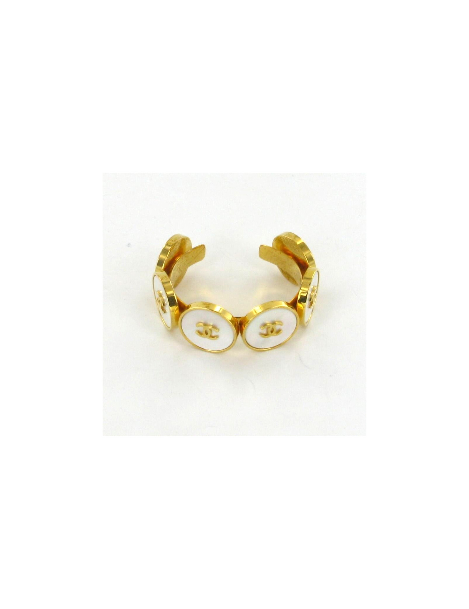 Bracelet CHANEL jonc doré rigide agrémenté de pièces en métal doré rondes de nacre blanche siglées CC. Très moderne, cette pièce est en parfait état. Longueur ajustable. Made in France.