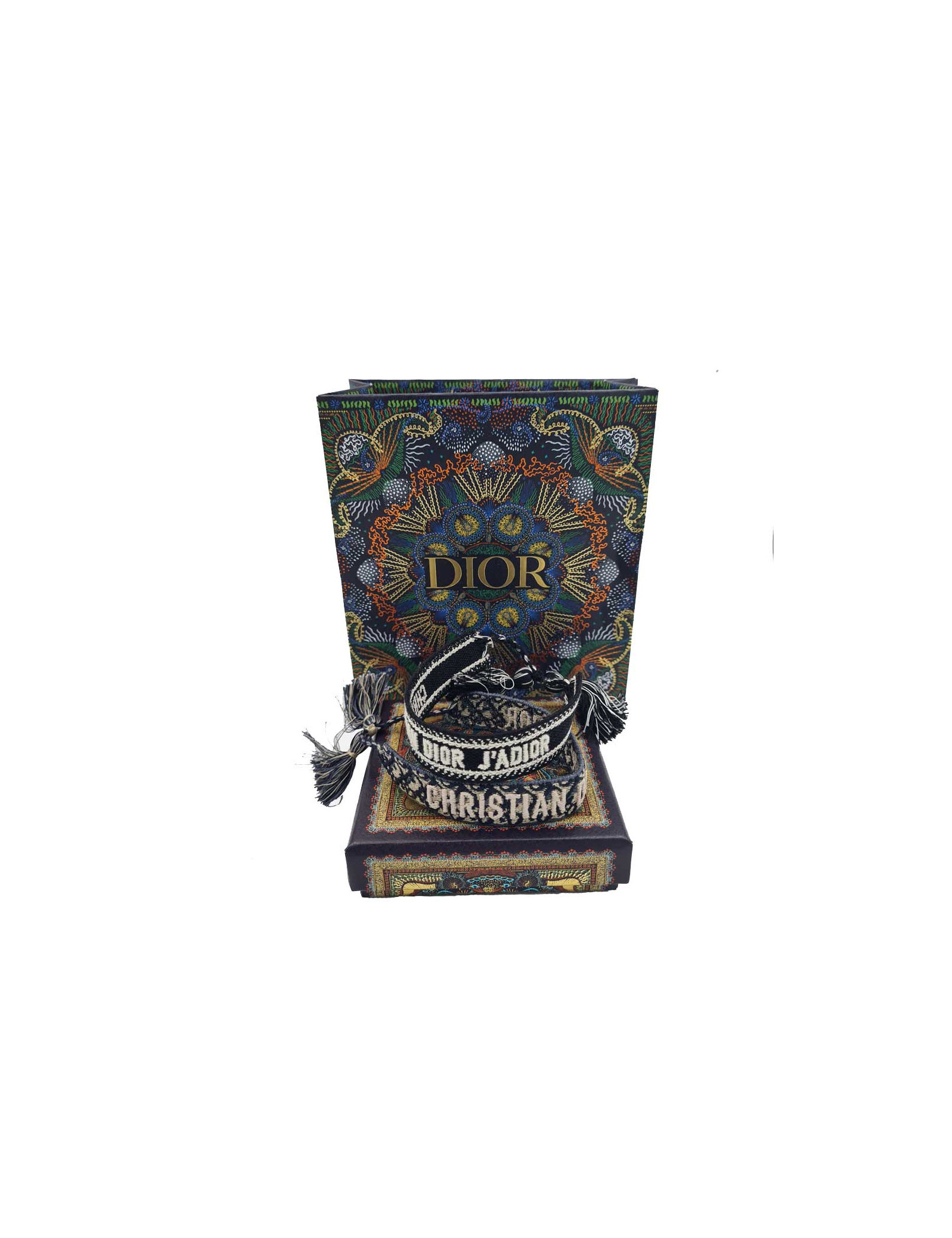 La signature "CHRISTIAN DIOR J'ADIOR" est dessiné sur le coton tissé. Un des bracelets est sur fond de toile oblique et l'autre uni.