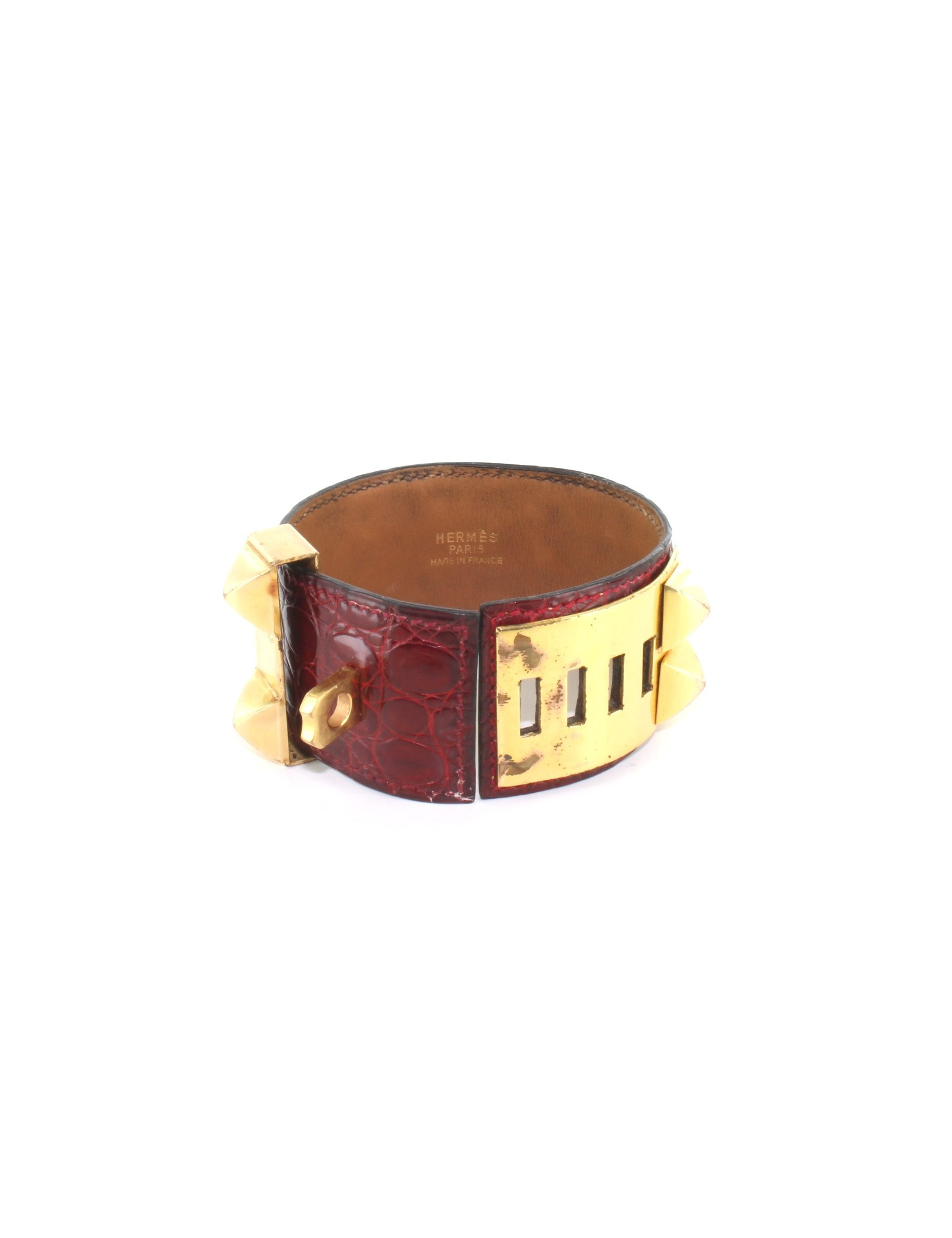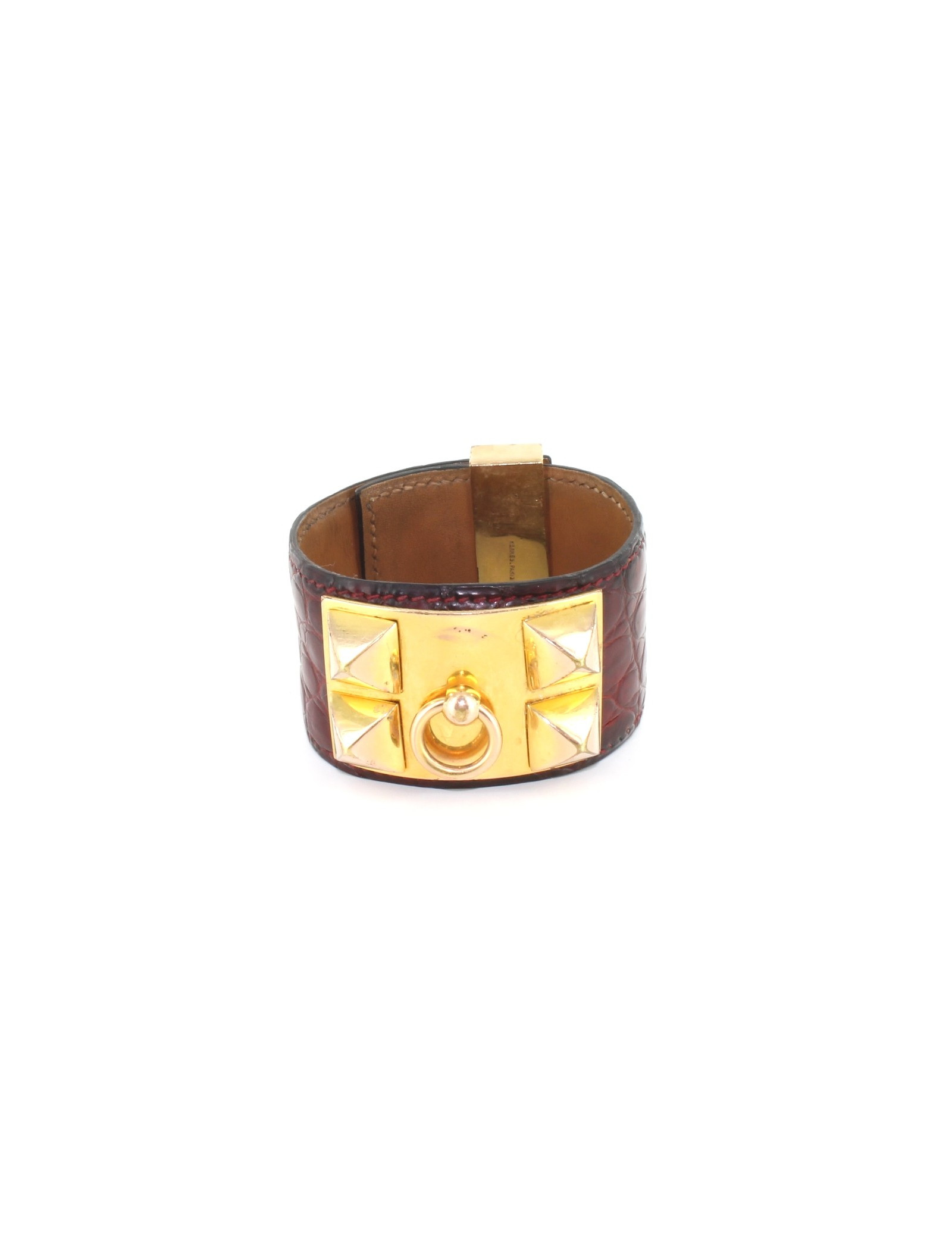 Manchette HERMES collier de chien vintage en crocodile rouge foncé et or