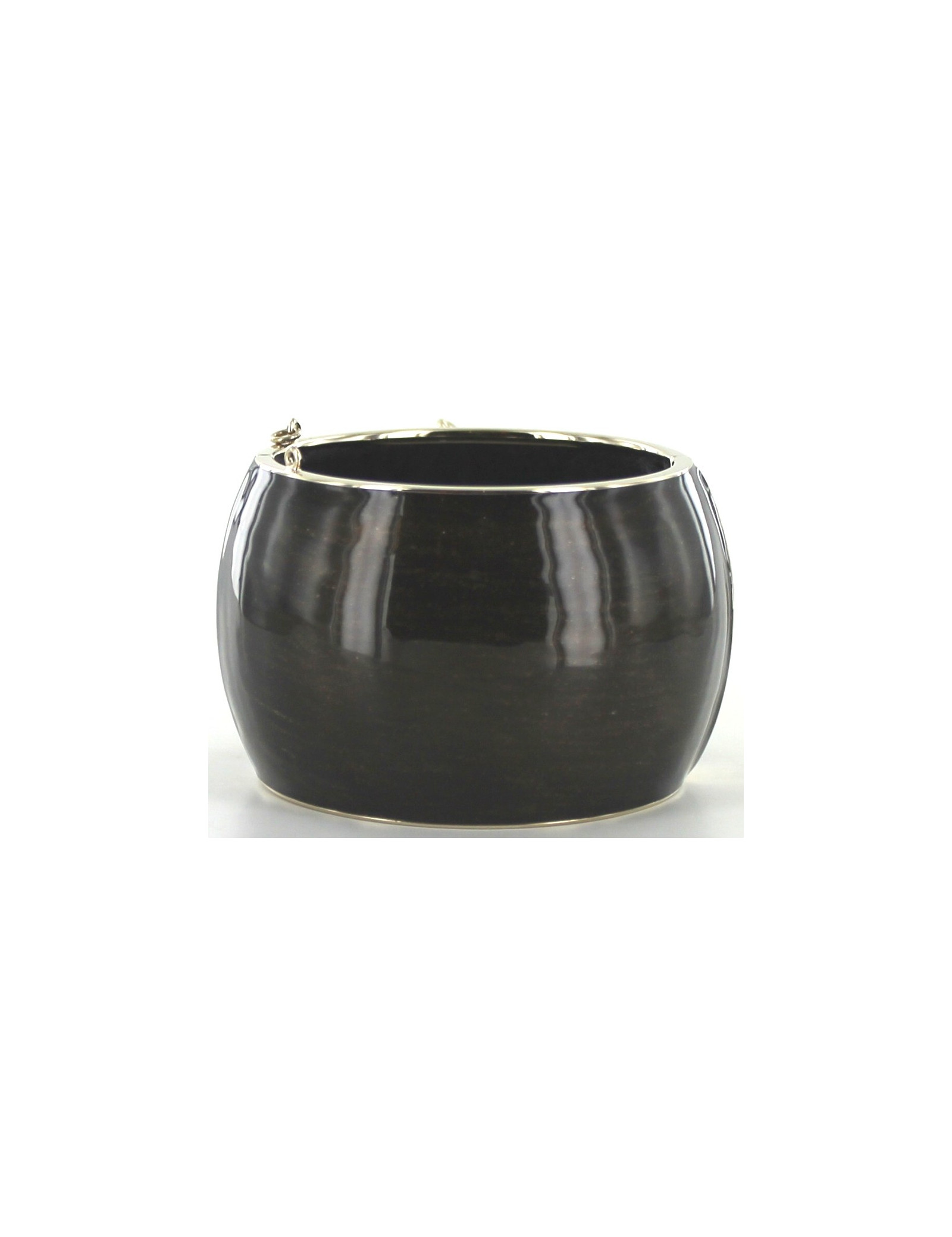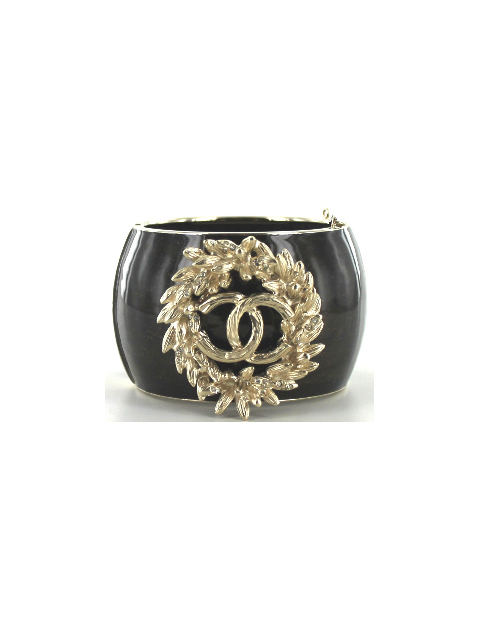Manchette CHANEL en résine noire et or avec bijou motif feuillage (laurier) en métal doré pâle et signature CC. Des strass blancs sont délicatement aposés sur les feuilles. Doublure intérieure en satin noir matelassé. Fermeture aimantée. Chaîne de sûreté manquante.