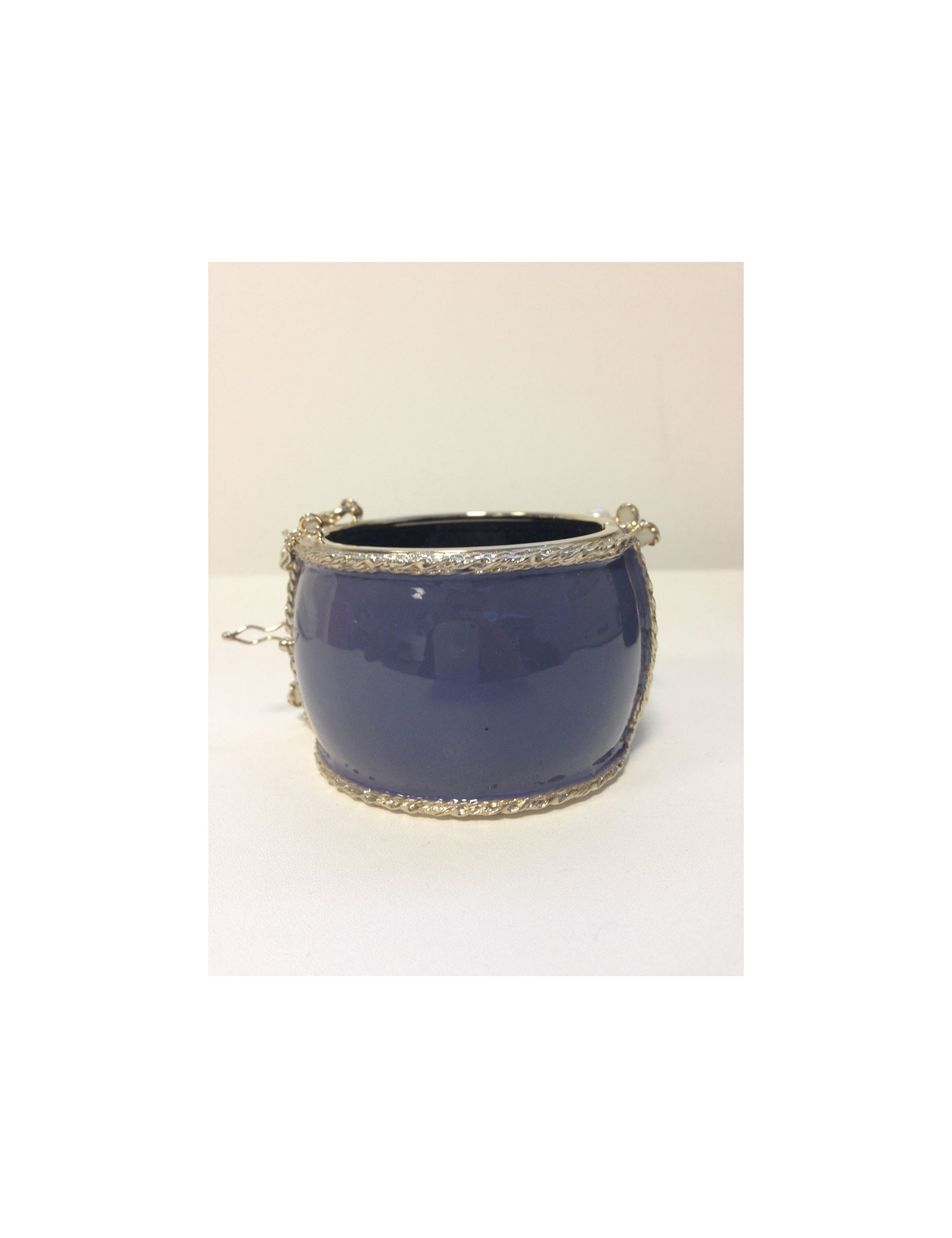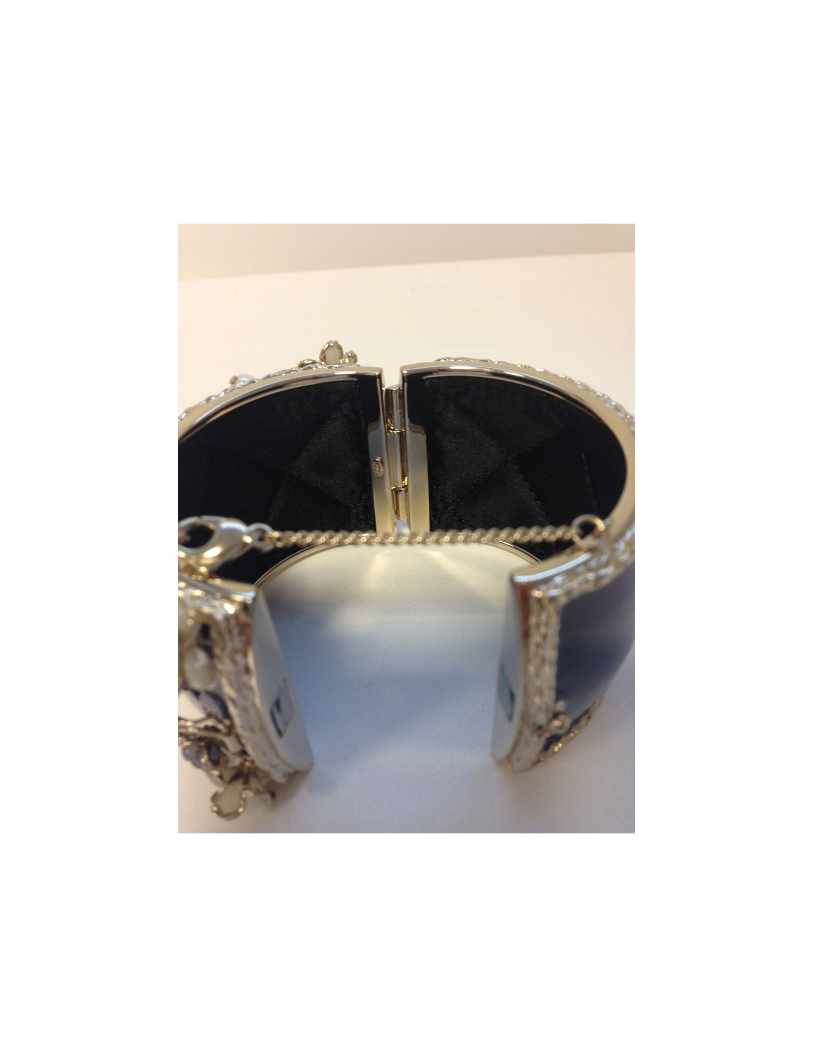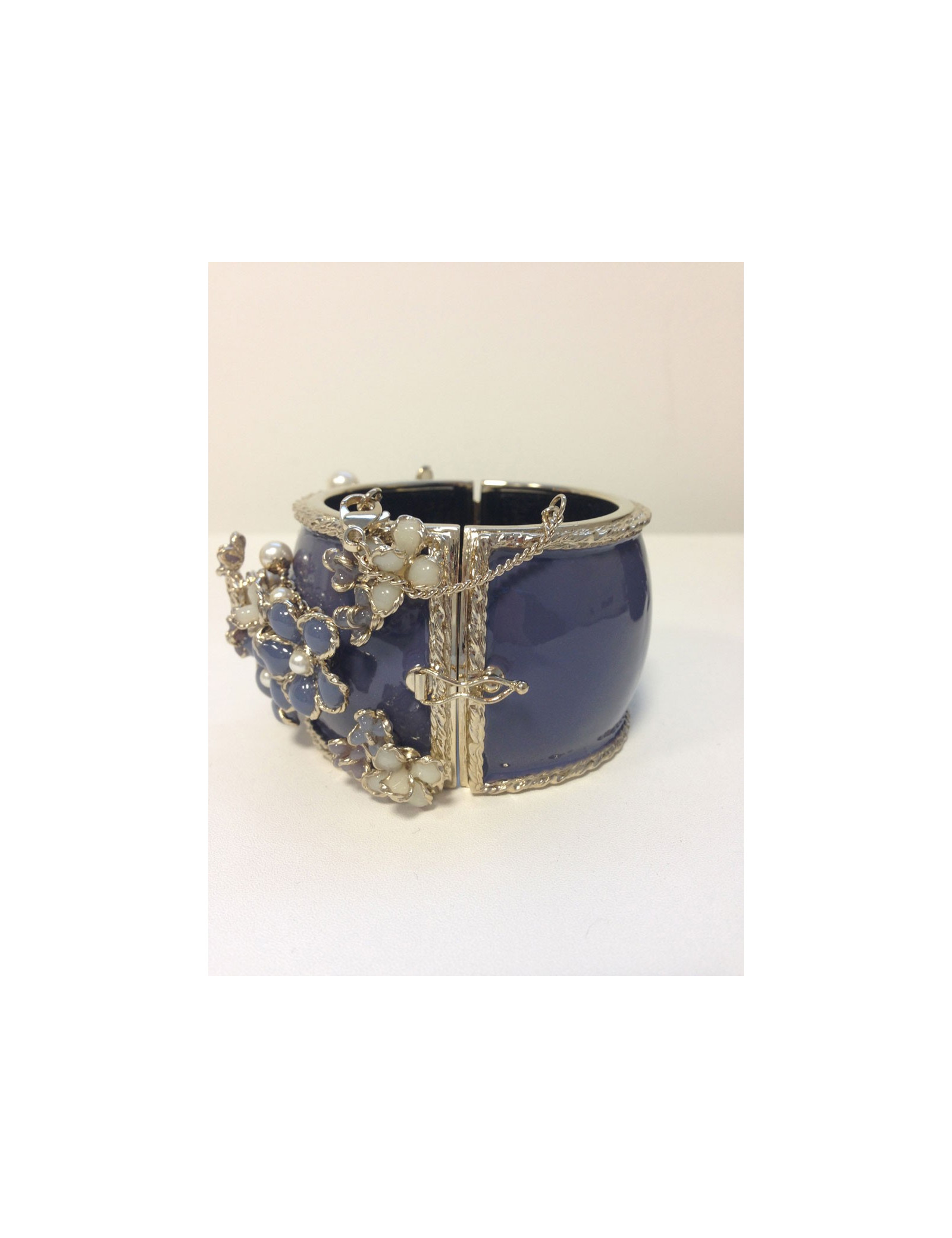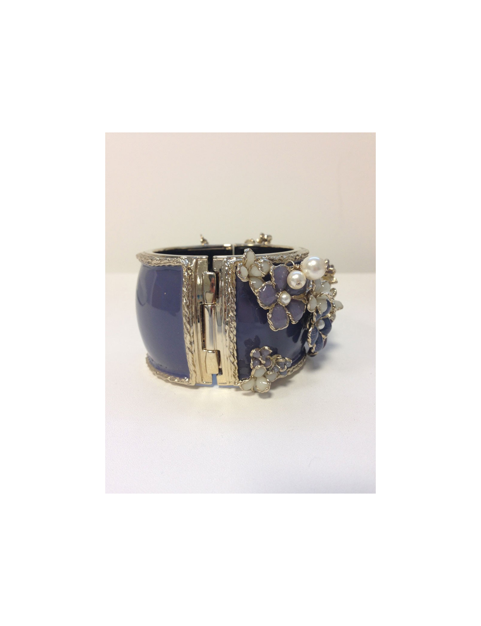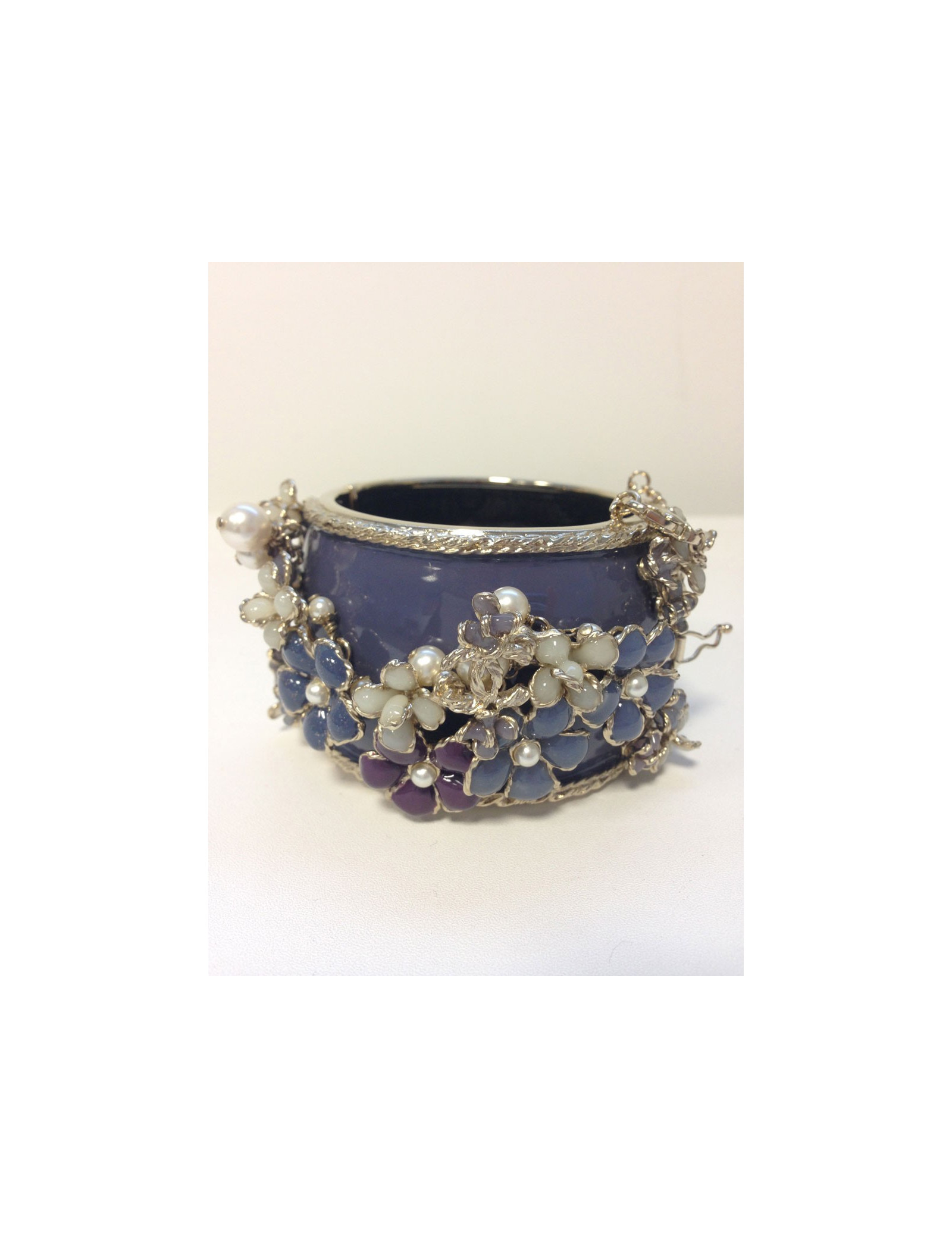 Manchette Chanel fleurettes en pâte de verre bleue lavande, violette, blanche, coeur en perles nacrées. Le fond de la manchette est en résine bleue lavande monté sur métal doré à l'or fin.