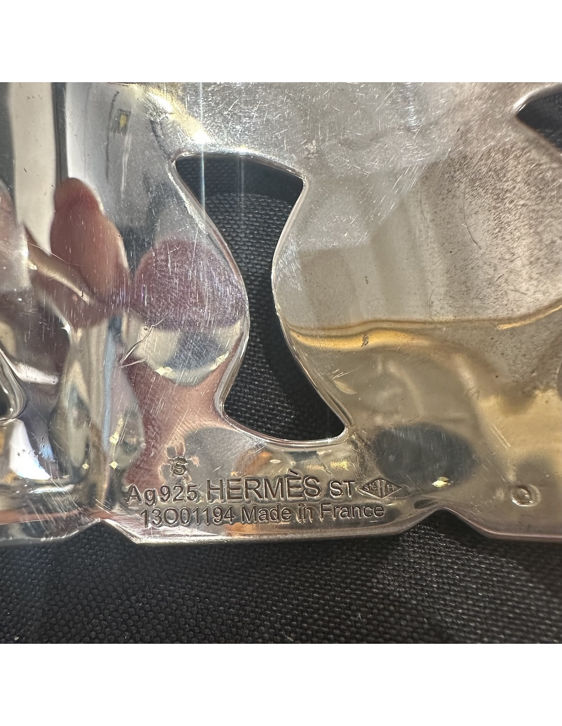 Détails : signature "Hermès Paris" à l'intérieur. Bracelet jonc en argent avec de larges maillons.