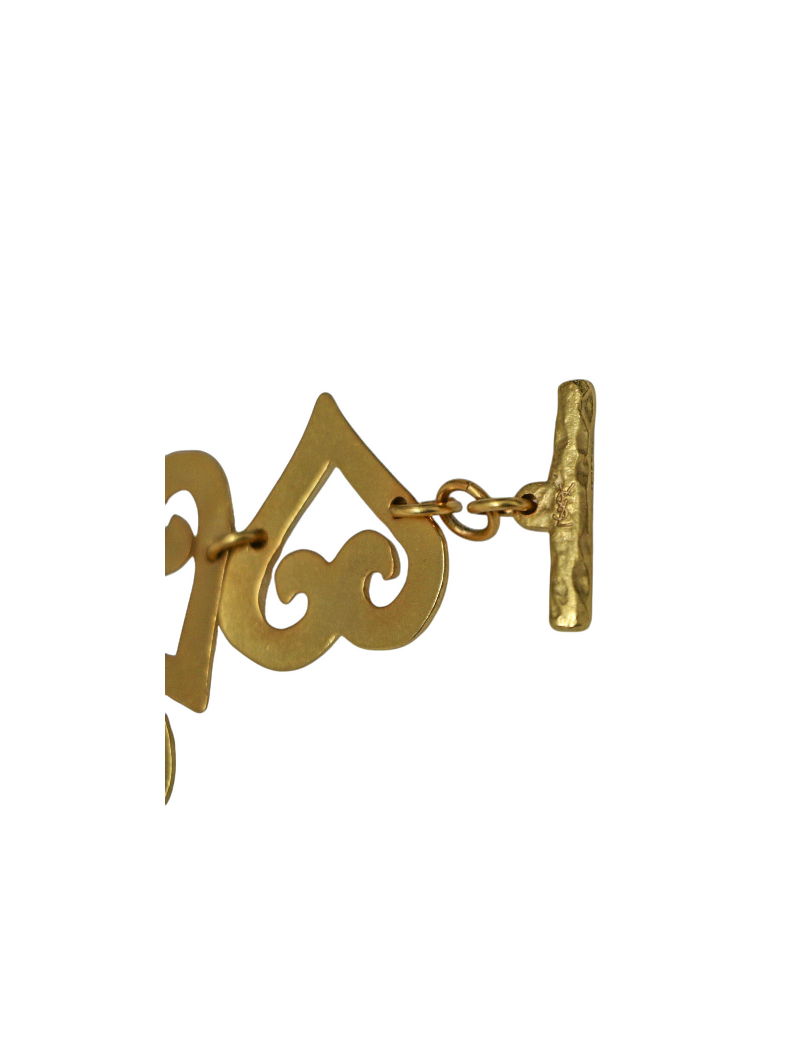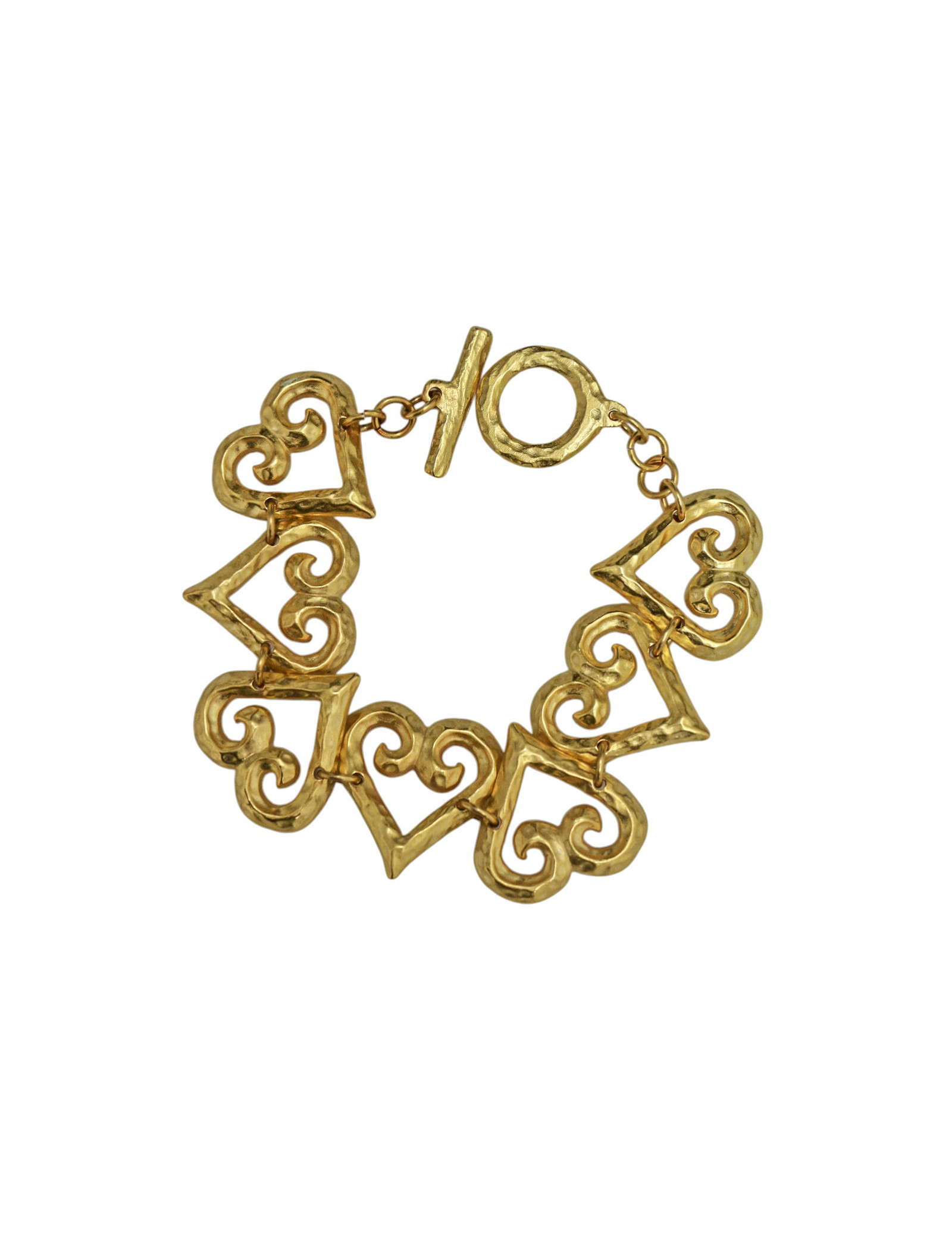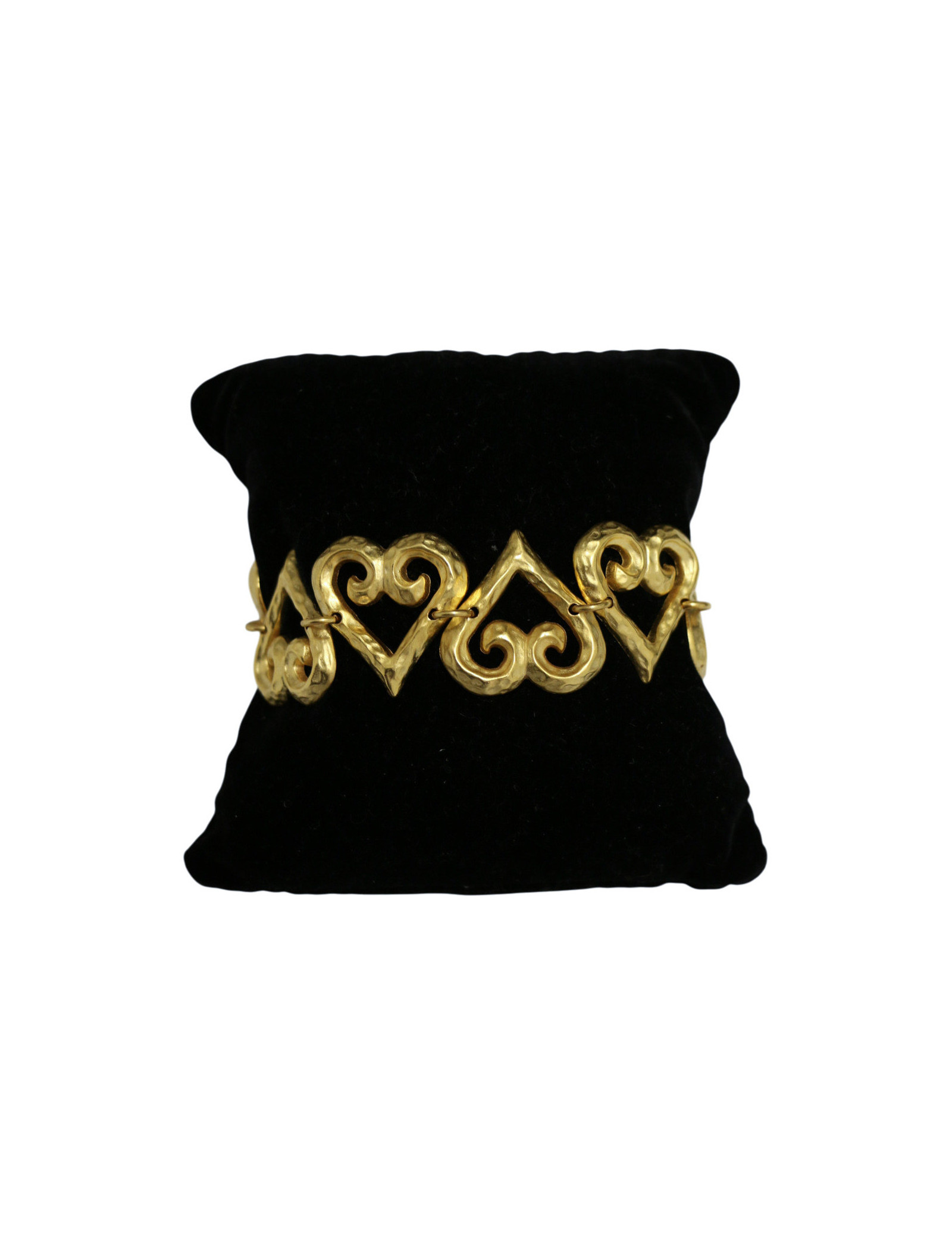 Ce bracelet vintage signé Yves Saint Laurent se distingue par une succession de cœurs en métal doré à l’effet martelé, apportant relief et caractère. Chaque élément est délicatement travaillé et orné de fines volutes, soulignant le sens du détail propre à la maison. Les maillons, à la fois présents et harmonieux, s’articulent avec fluidité et se terminent par un fermoir bâtonnet classique, signé du logo YSL, alliant esthétique et sécurité. Avec ses dimensions de 19,3 cm de long et 2,7 cm de large, ce bracelet habille le poignet avec une allure affirmée. En très bon état, il conserve toute sa prestance et son charme d’origine. Une pièce de caractère, idéale pour les amateurs de bijoux signés et de style vintage assumé.