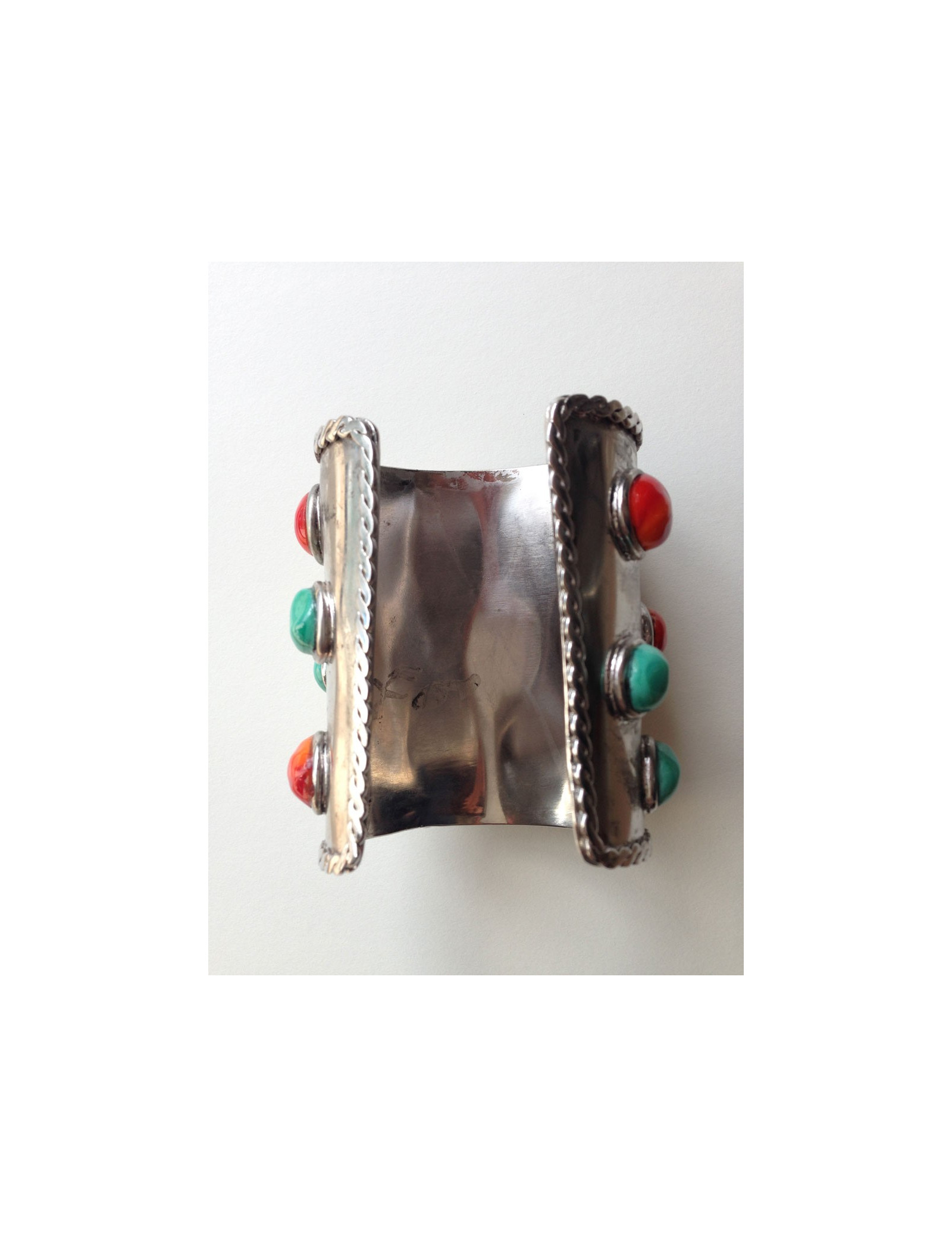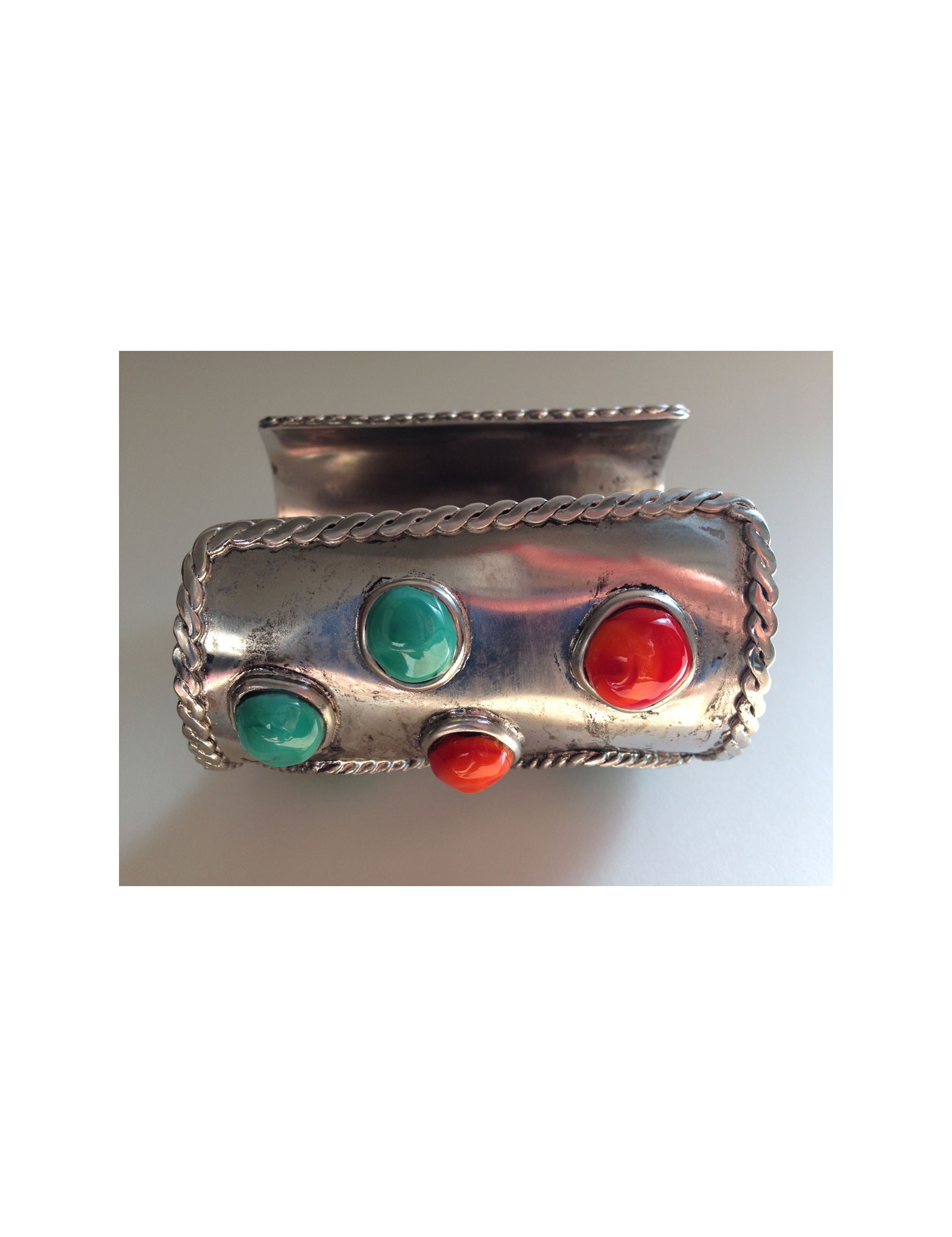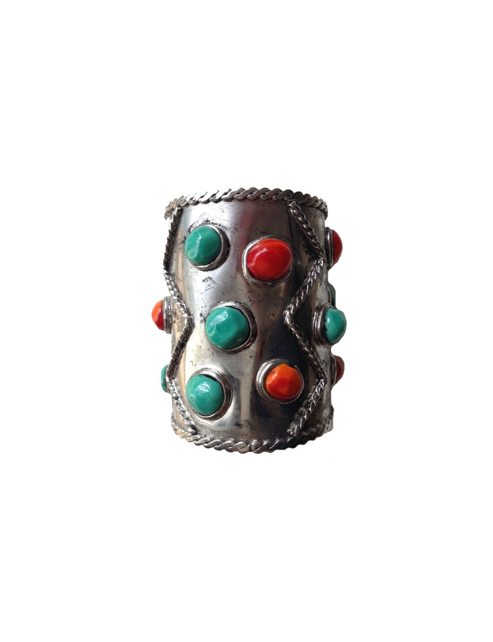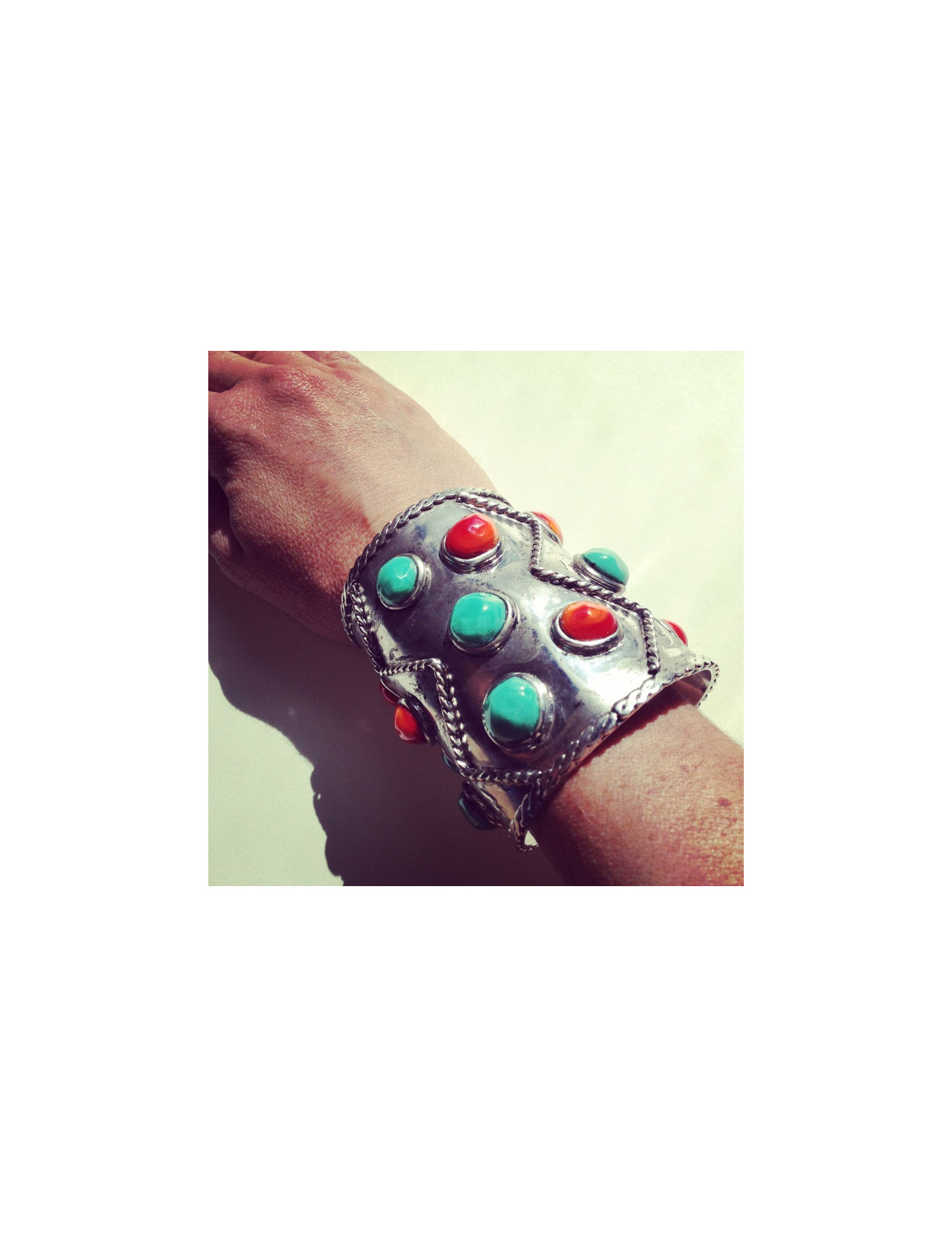 Manchette corail et turquoise MARGUERITE DE VALOIS cabochons pâte de verre et métal argenté
