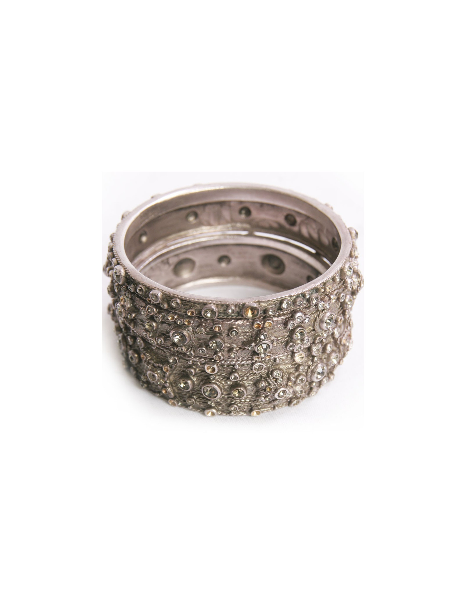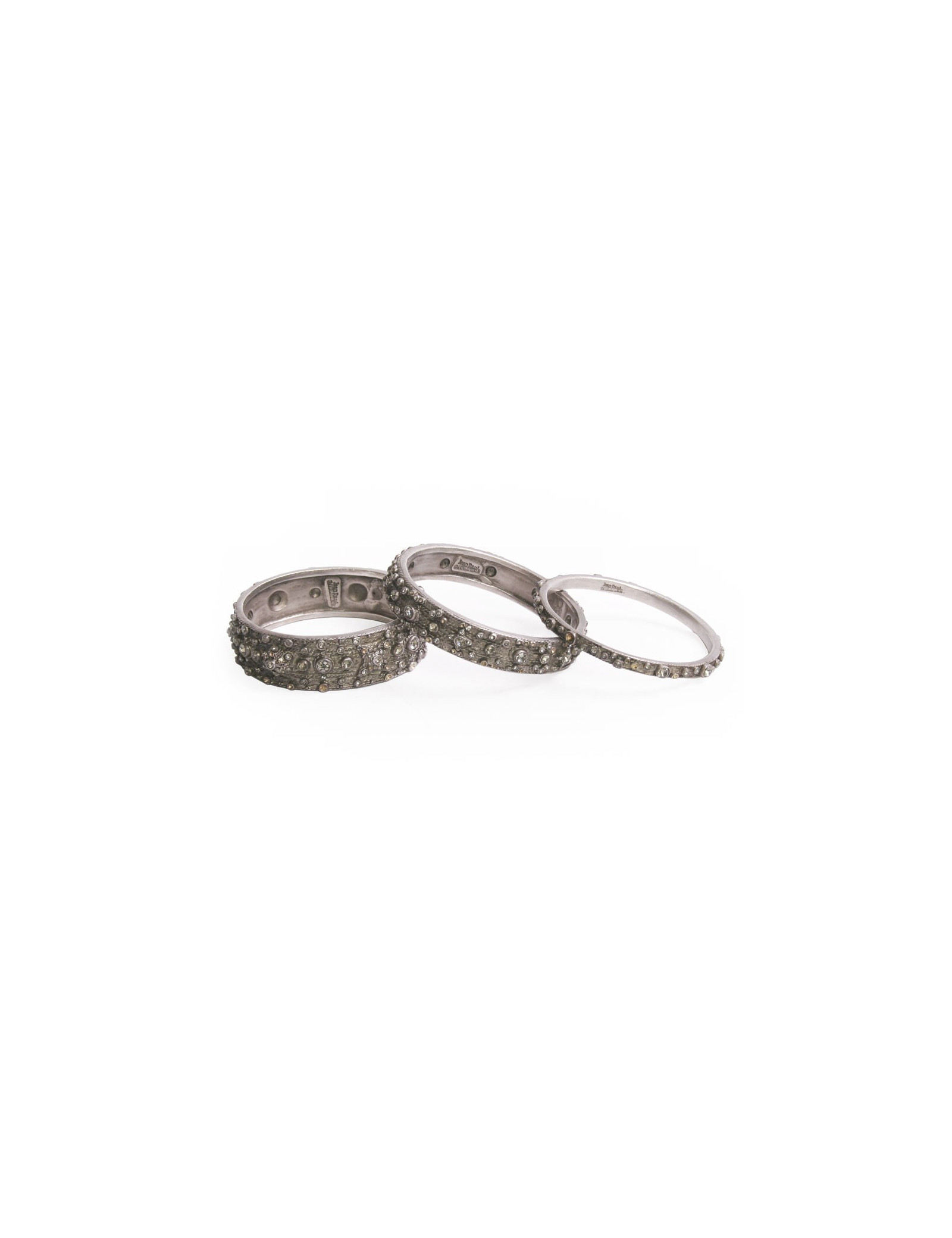 Magnifique série de trois bracelets Jean Paul Gaultier. Les trois bracelets sont en métal argenté incrustés et surmontés de brillants swarovski, tous les trois sont de tailles différentes, fin, medium et large. Ils sont en parfait état.