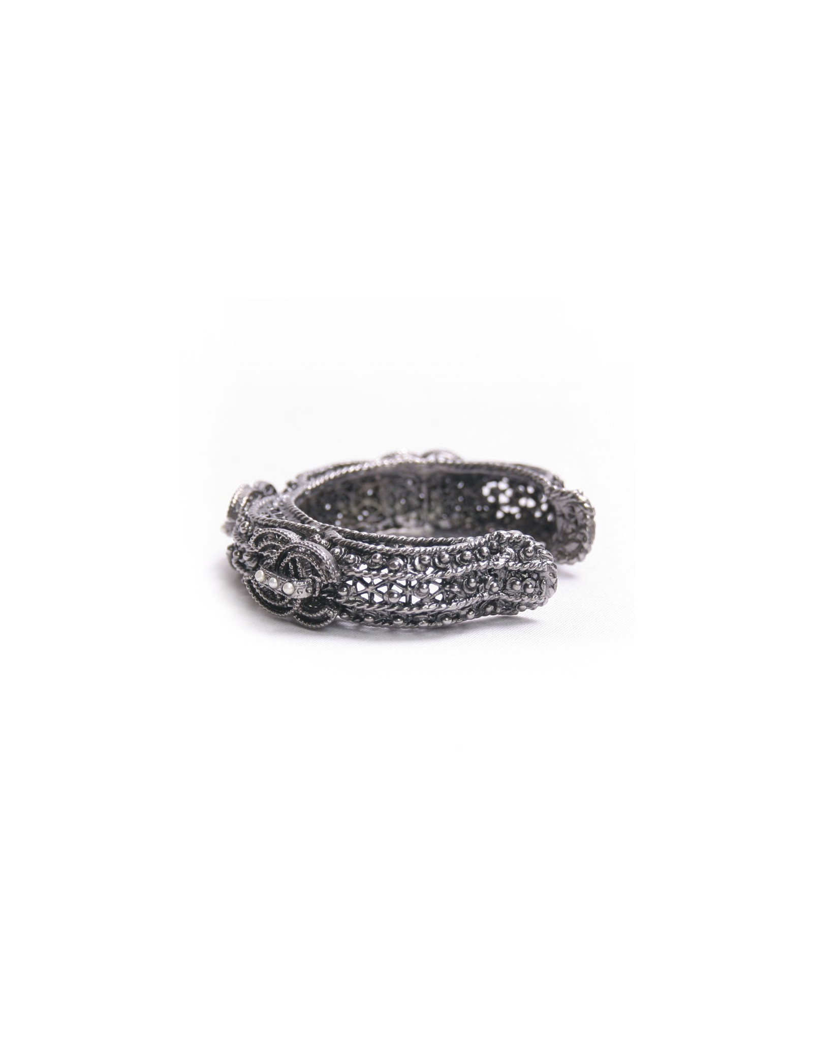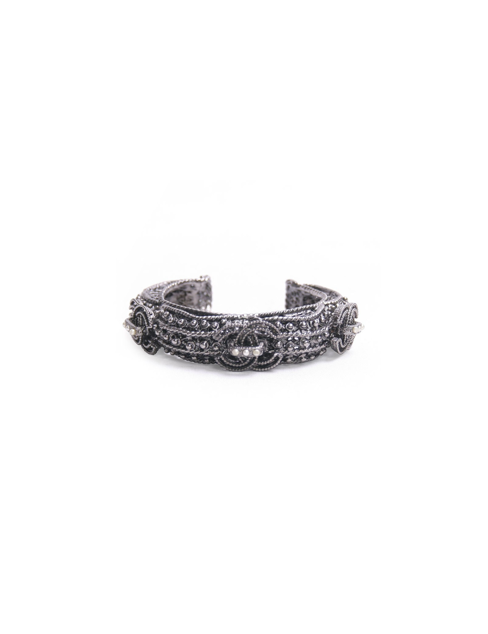 Bracelet en filigrane Chanel, en métal argent vieilli, surmonté de 3 double C sertis de perles nacrées.