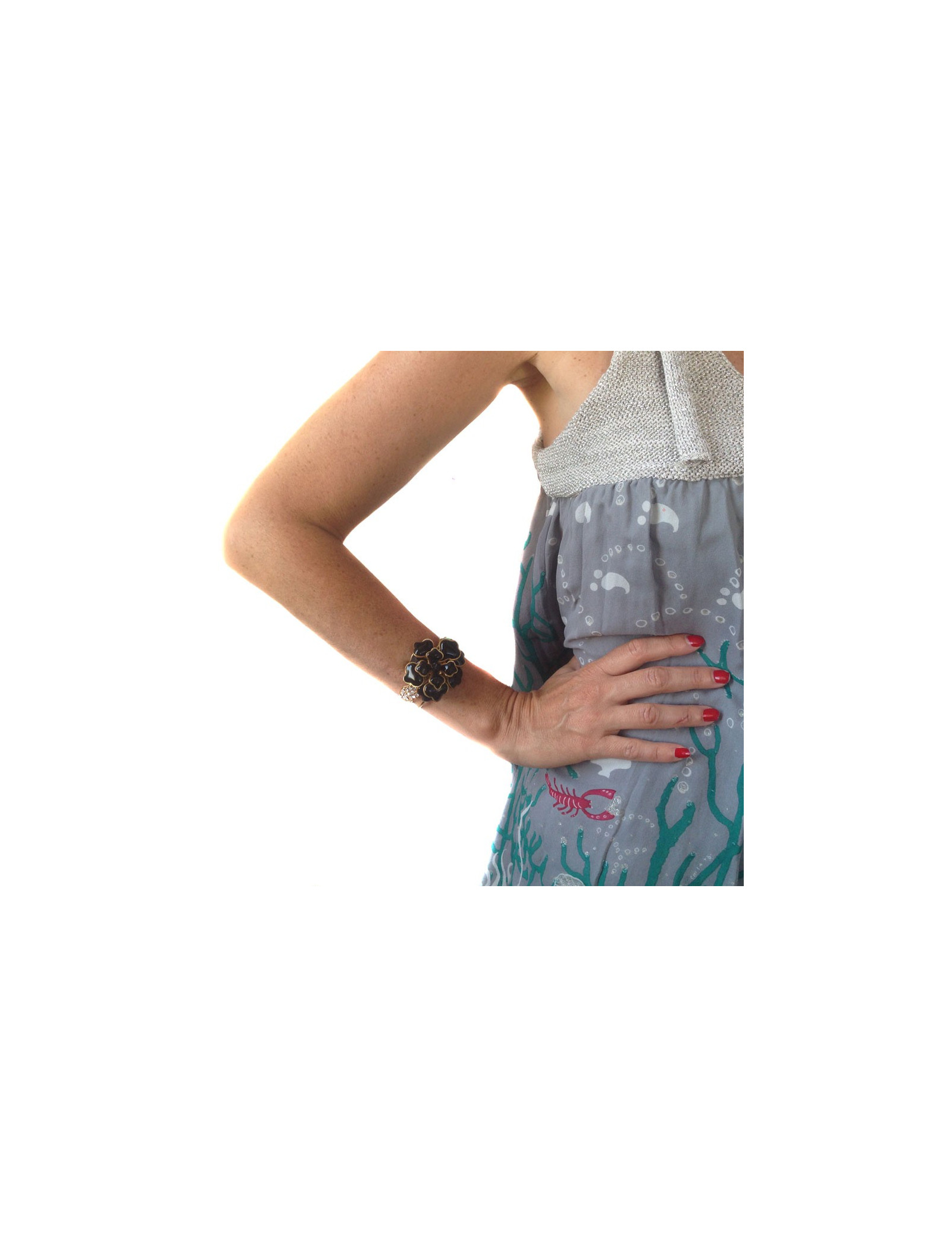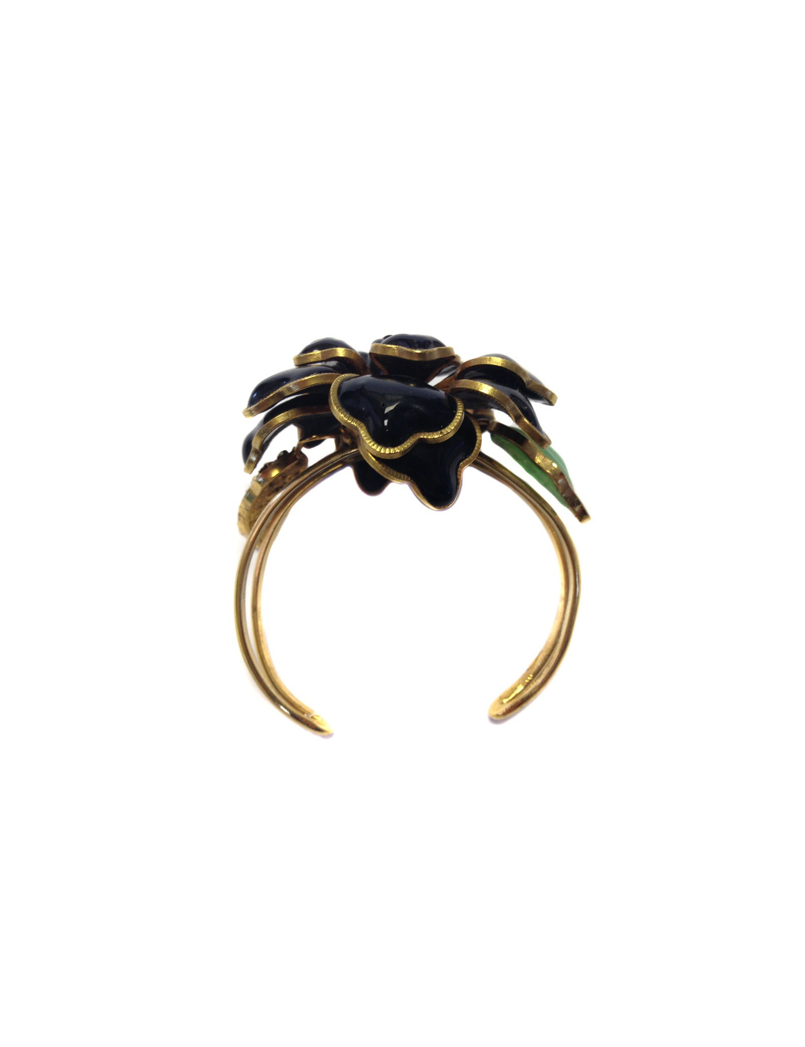 Magnifique bracelet Marguerite de Valois couture. Monture en métal doré à l'or fin, grande fleur en pâte de verre noire, feuille en pâte de verre couleur jade et feuille surmontée de strass Swarovski. Jamais porté.