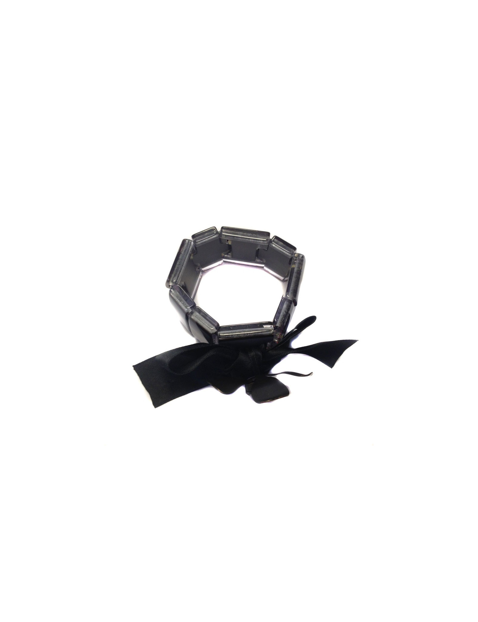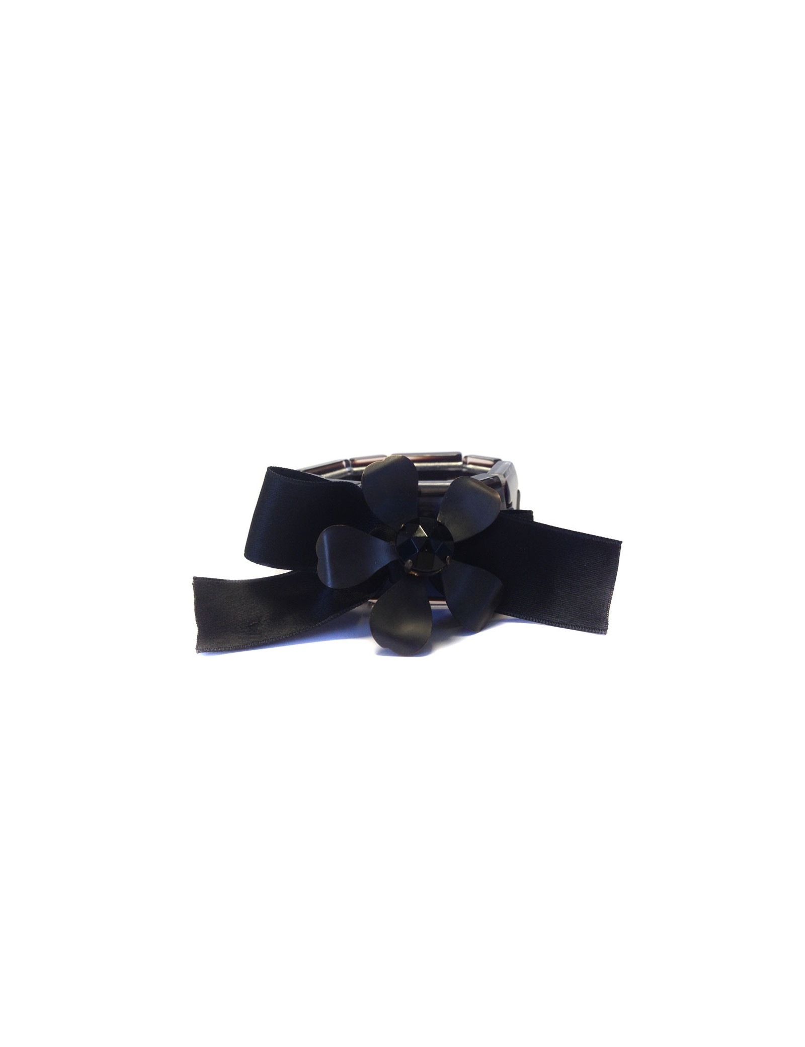 Beau bracelet MARNI élastique en plexi mauve, noeud en satin noir et fleur en métal avec en son centre une perle noire facettée. Légères micro rayures sur le plexi. En très bon état.