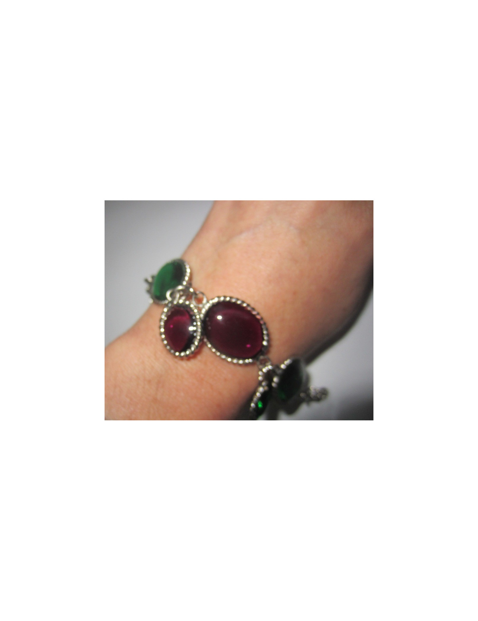 Magnifique bracelet "Gouttes d'eau" de la Maison Marguerite de Valois, en métal argenté et pâte de verre améthyste & vert bouteille.