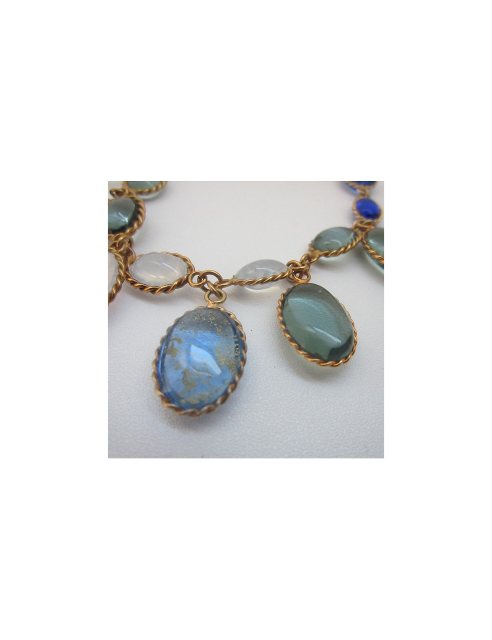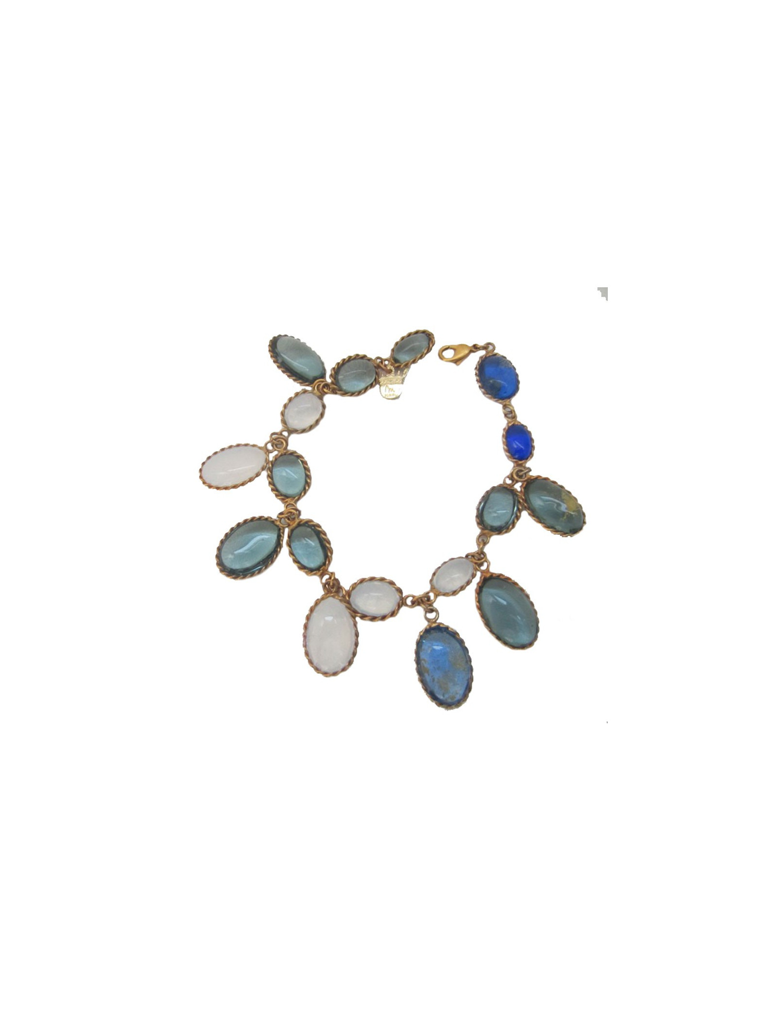 Dégradé de bleu saphir, de gris, de blanc laiteux. Quellques feuilles d'or incrustées dans certaines "gouttes". Travail remarquable réalisé à la main par les artisans bijoutiers de la Maison Marguerite de Valois.