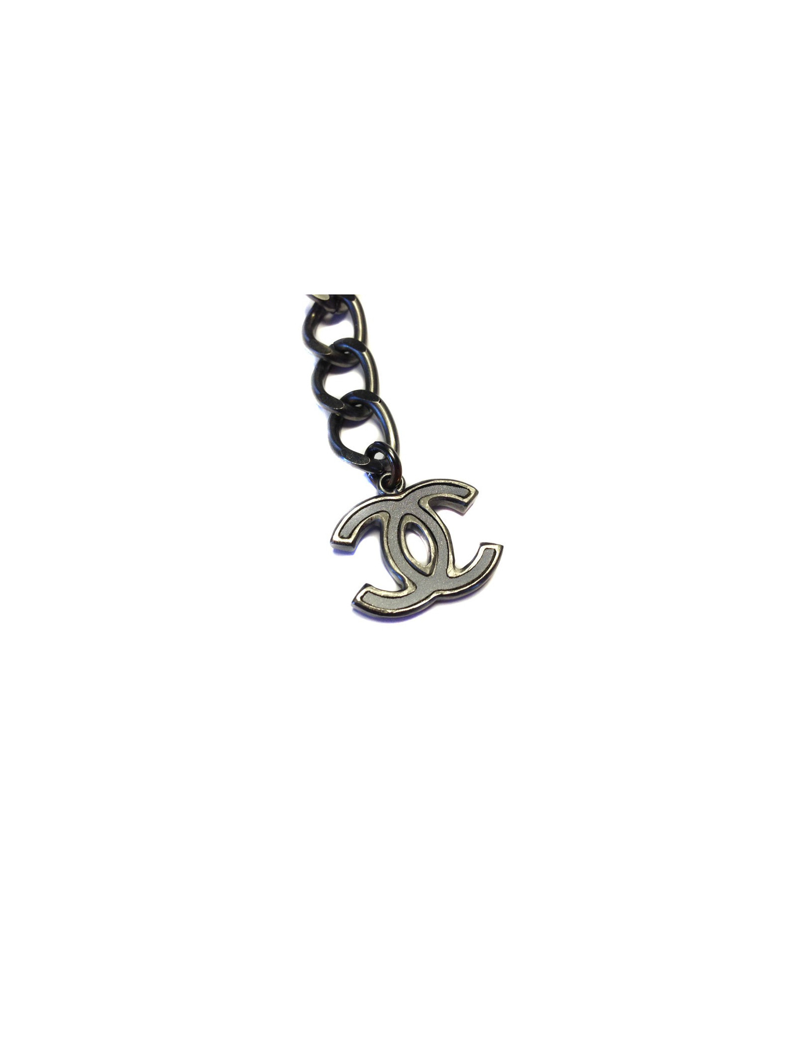 Très beau bracelet CHANEL, chaîne à gros maille argentée (gourmette). La maille est colorée en gris perle sur le dessus. CC à l'extrémité du fermoir. En très bon état.
