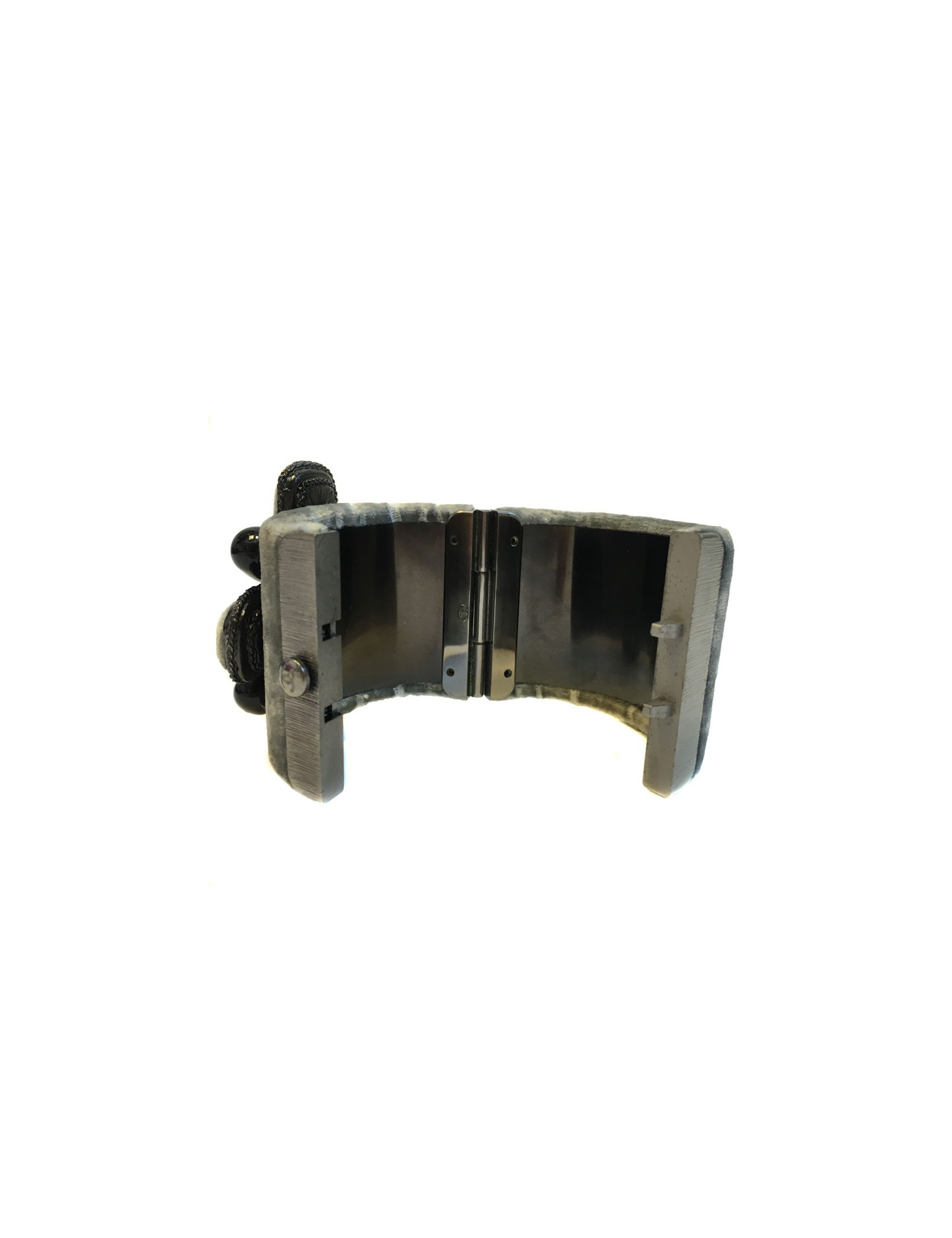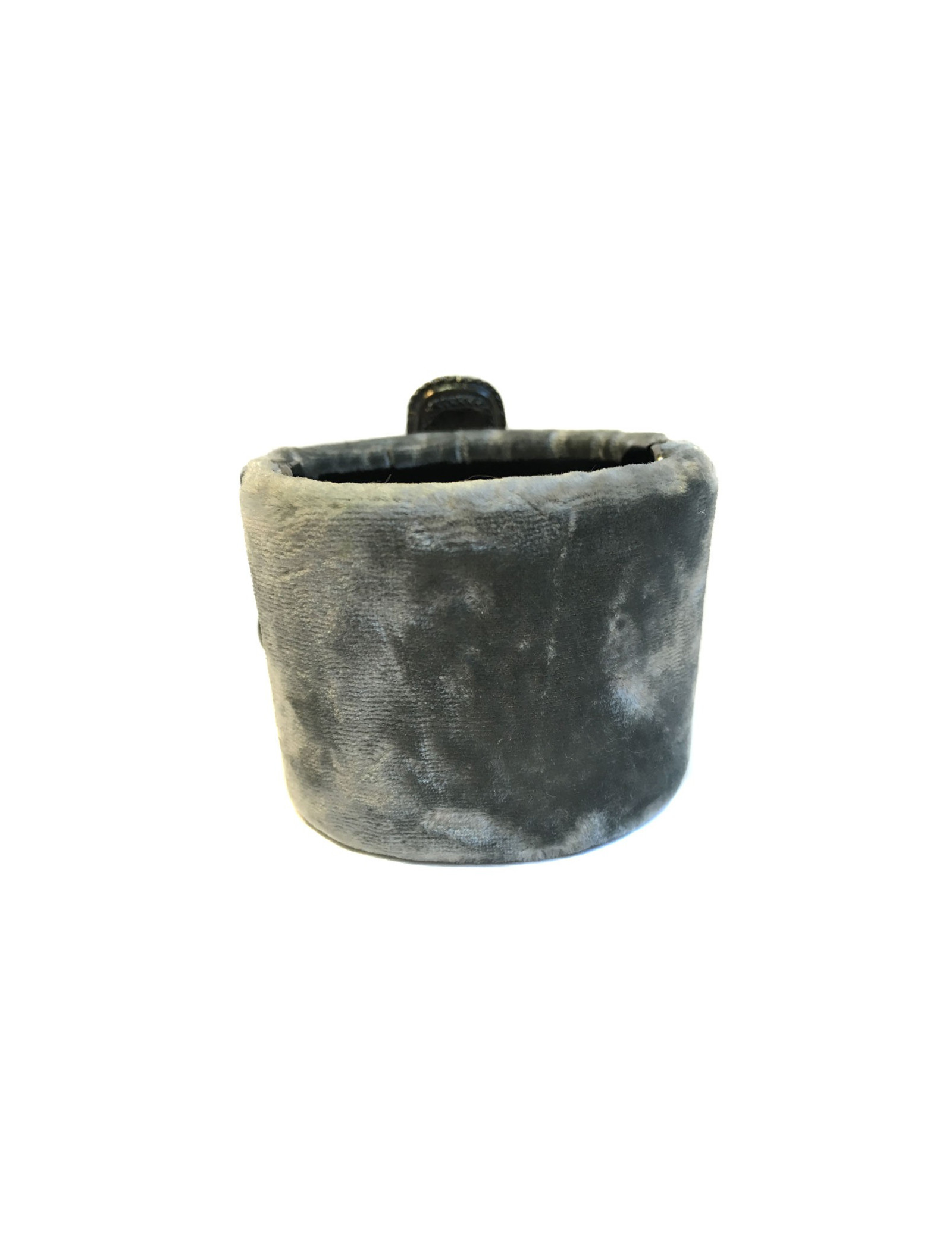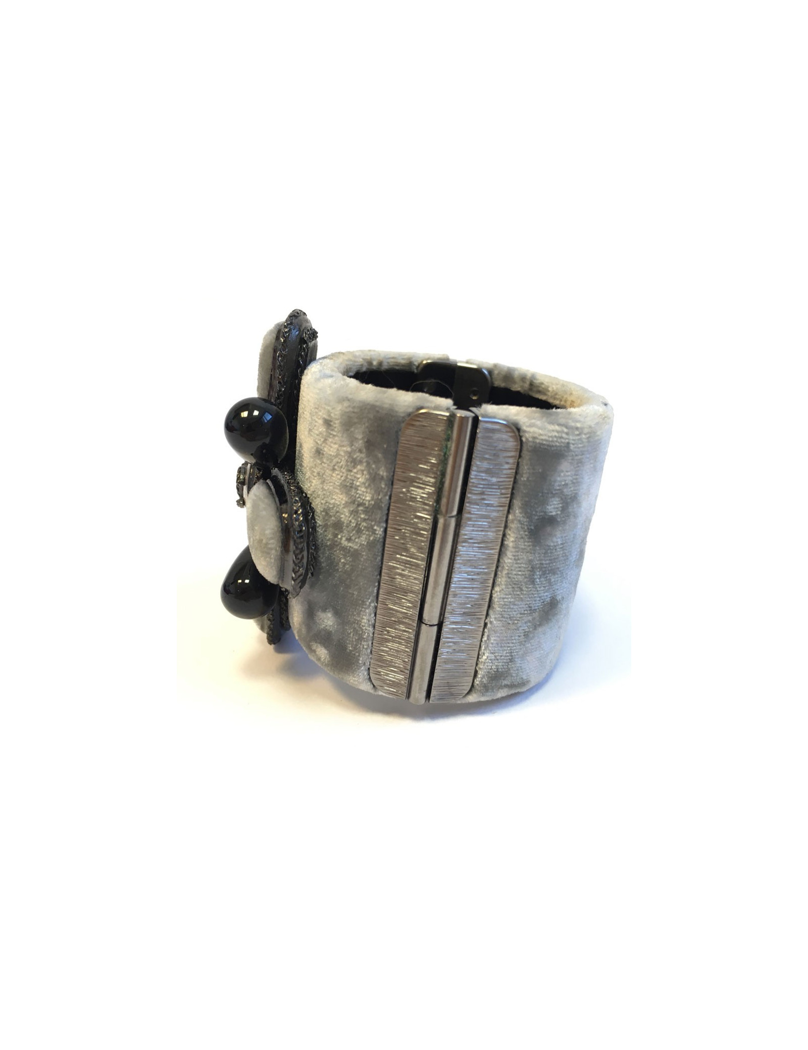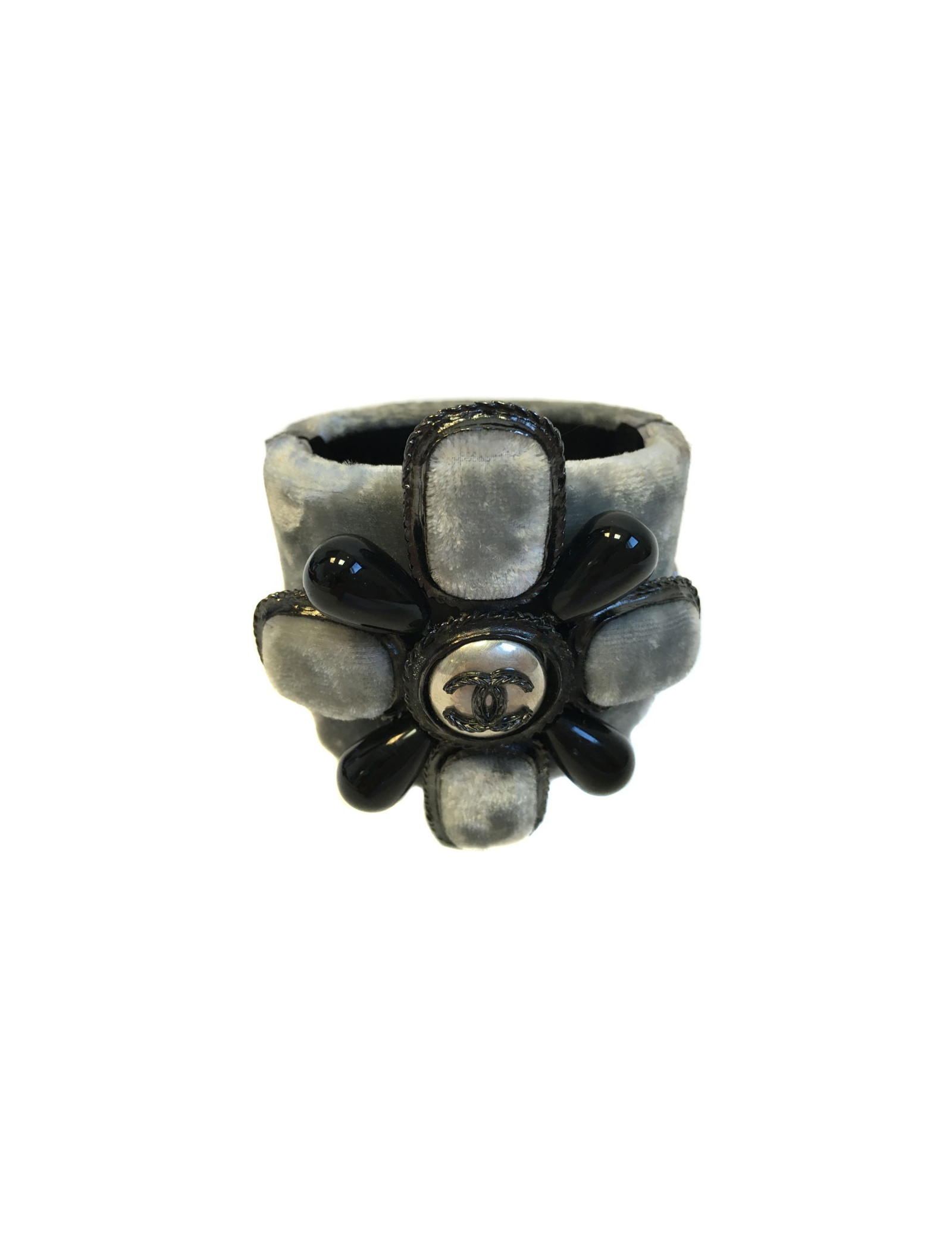 Magnifique manchette CHANEL en panne de velours gris et pâte de verre noire. Manchette en ruthénium.
