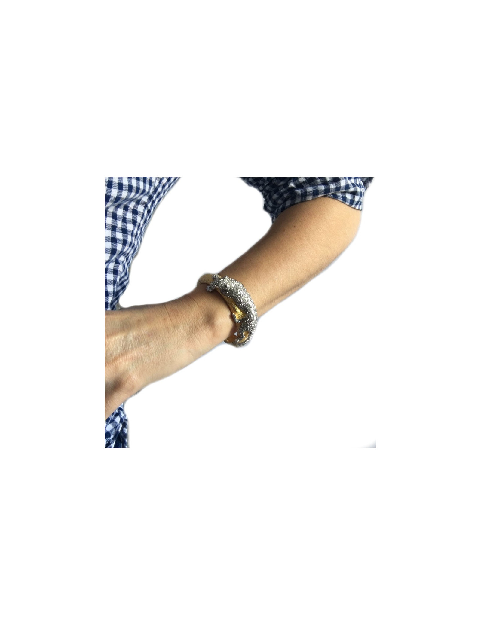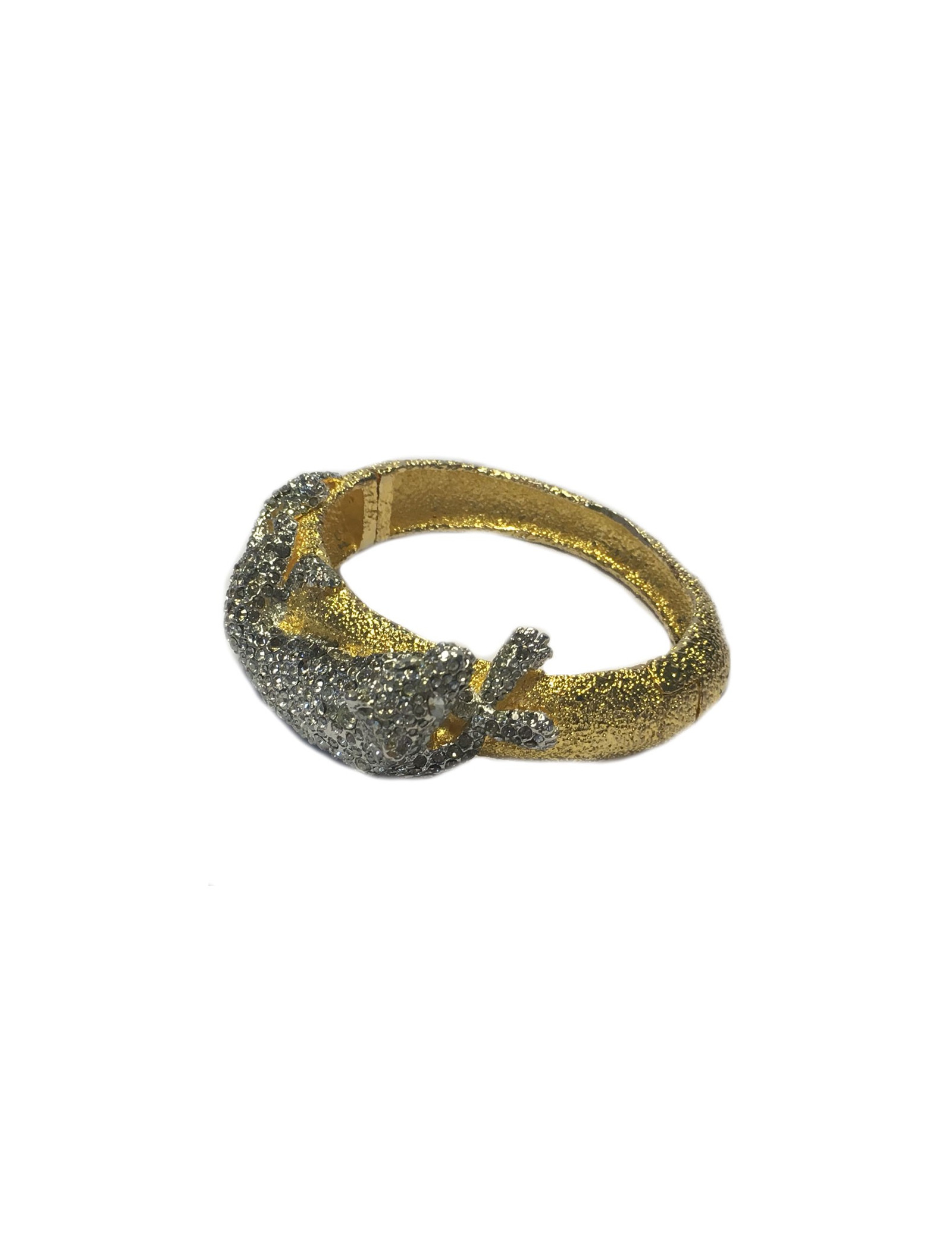 Bracelet de star ! Ce bracelet du célèbre designer américain Alexis Bittar est un bijou inspiré de la haute joaillerie. Il est porté sur de nombreuses célébrités. En métal doré surmonté d'une panthère entièrement sertie de strass. Fermoir aimanté. Pastille de la marque à l'intérieur.