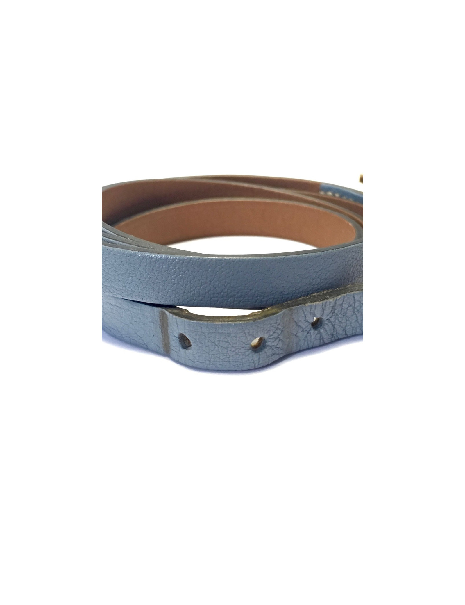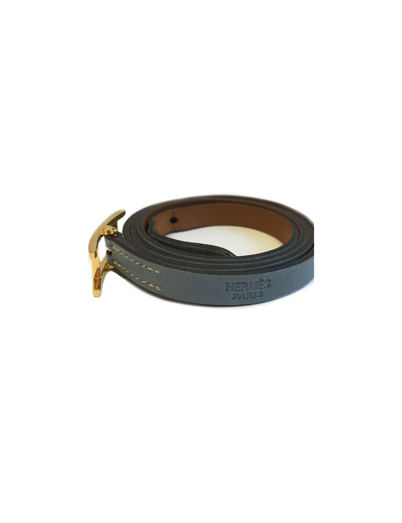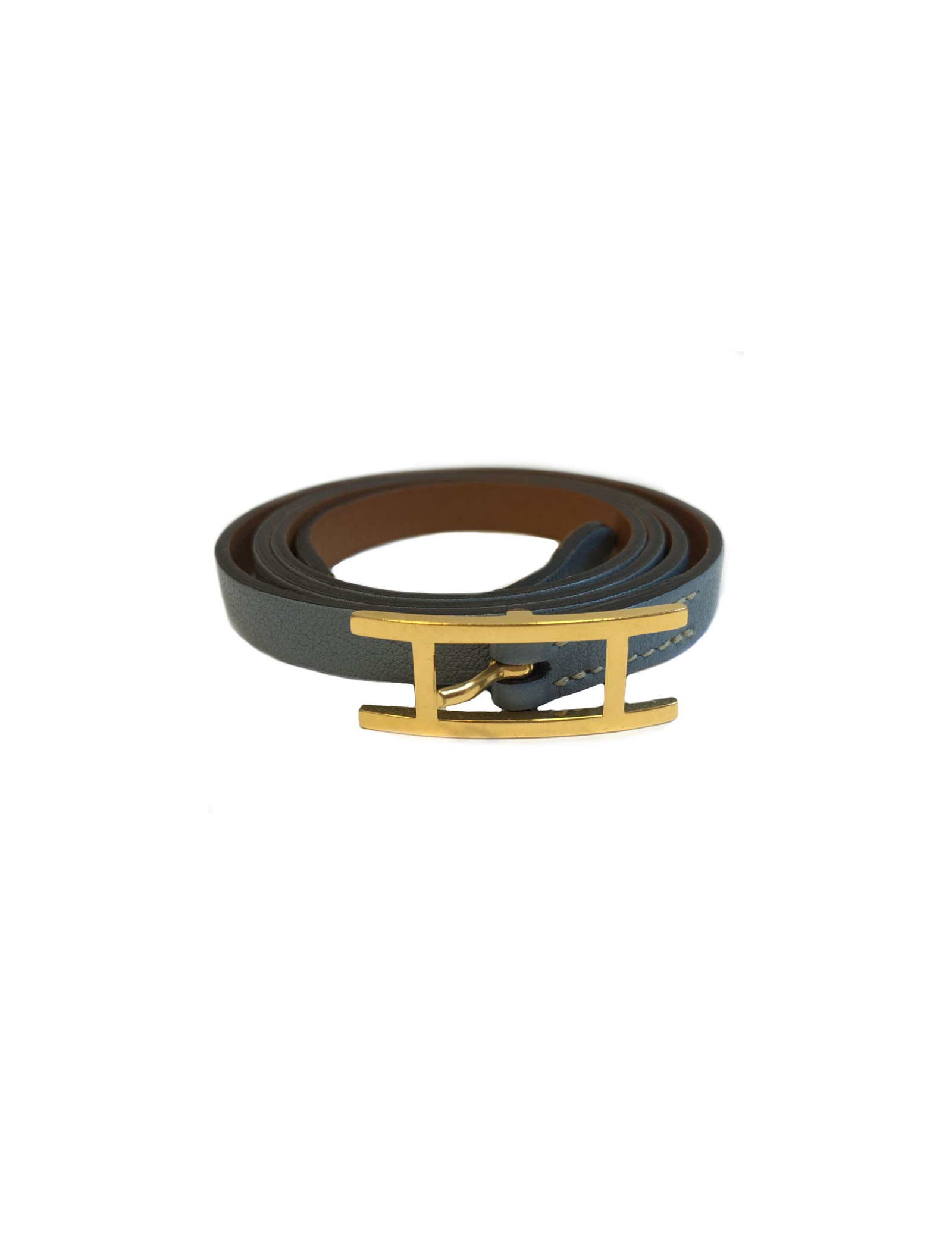 Bracelet HERMES "HAPI" multi tours en cuir bleu. la bijouterie est dorée. En très bon état. Lettre P dans un carré. S des soldes. Le cuir est un peu marqué au dernier et avant dernier trou du fait d'avoir été porté.