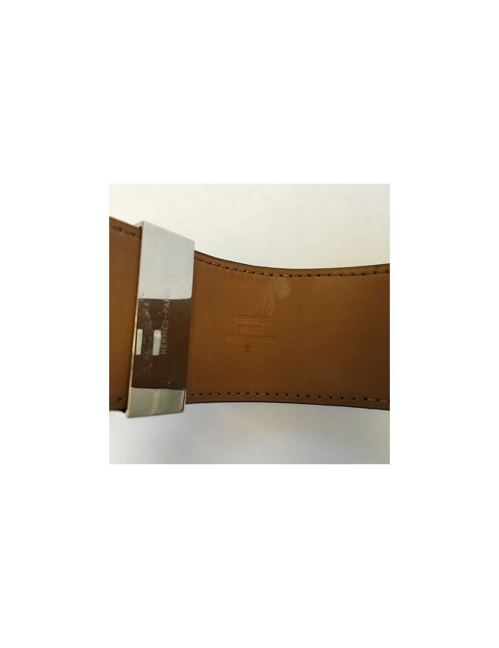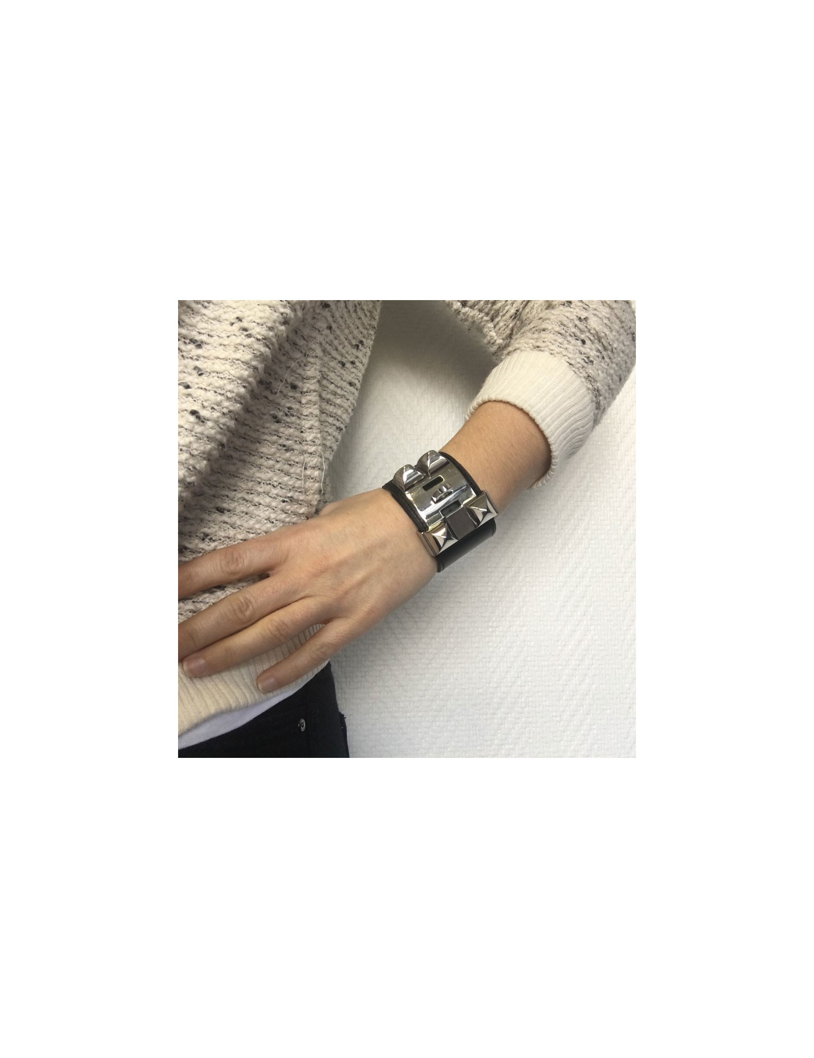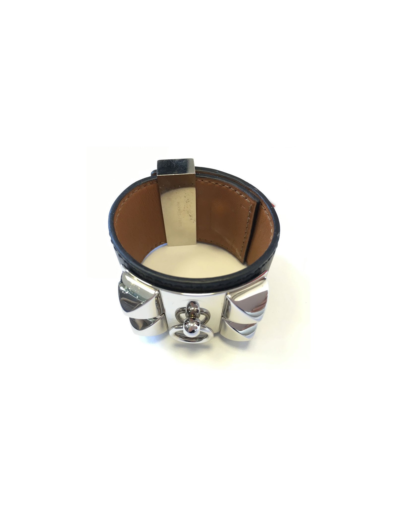 Manchette HERMES "Médor" en cuir box noir et bijouterie argentée. Taille S. Lettre Q dans un carré. S des soldes.