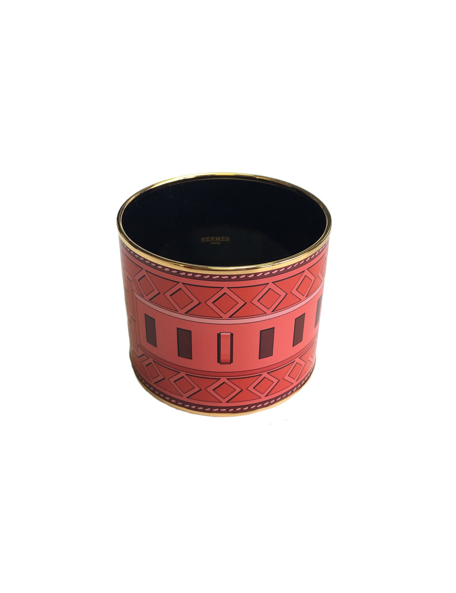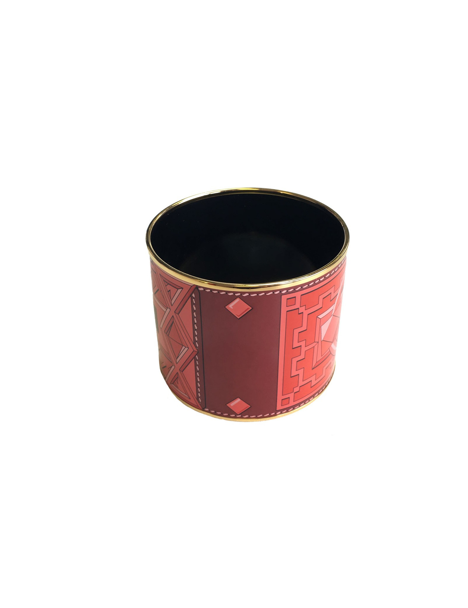 Bracelet mega large en émail rouge et rose de la maison HERMES. Les dessins sont fins dans les tons rouge, lie de vin et rose. Le cerclage est en plaqué or. Griffé "Made in France + P".