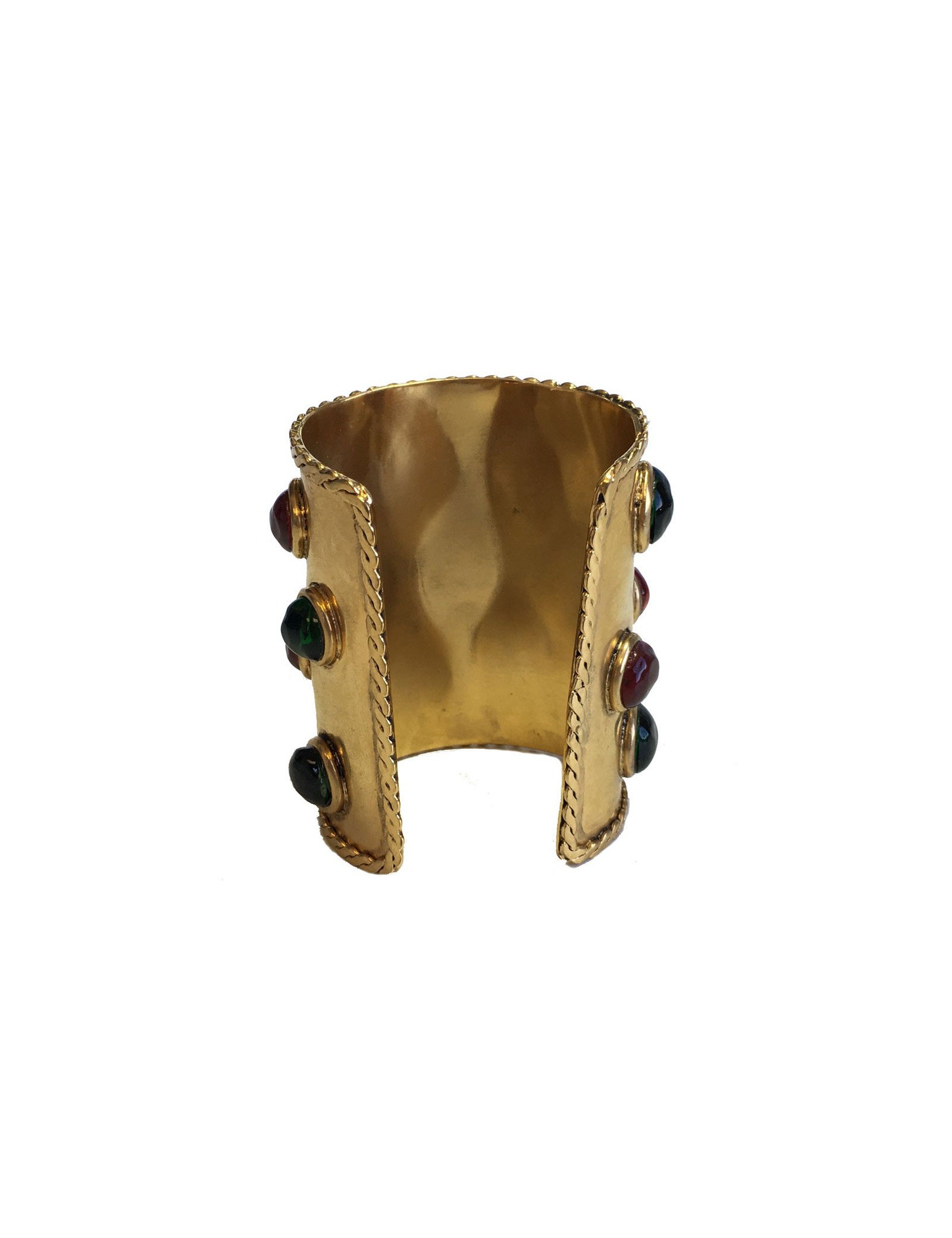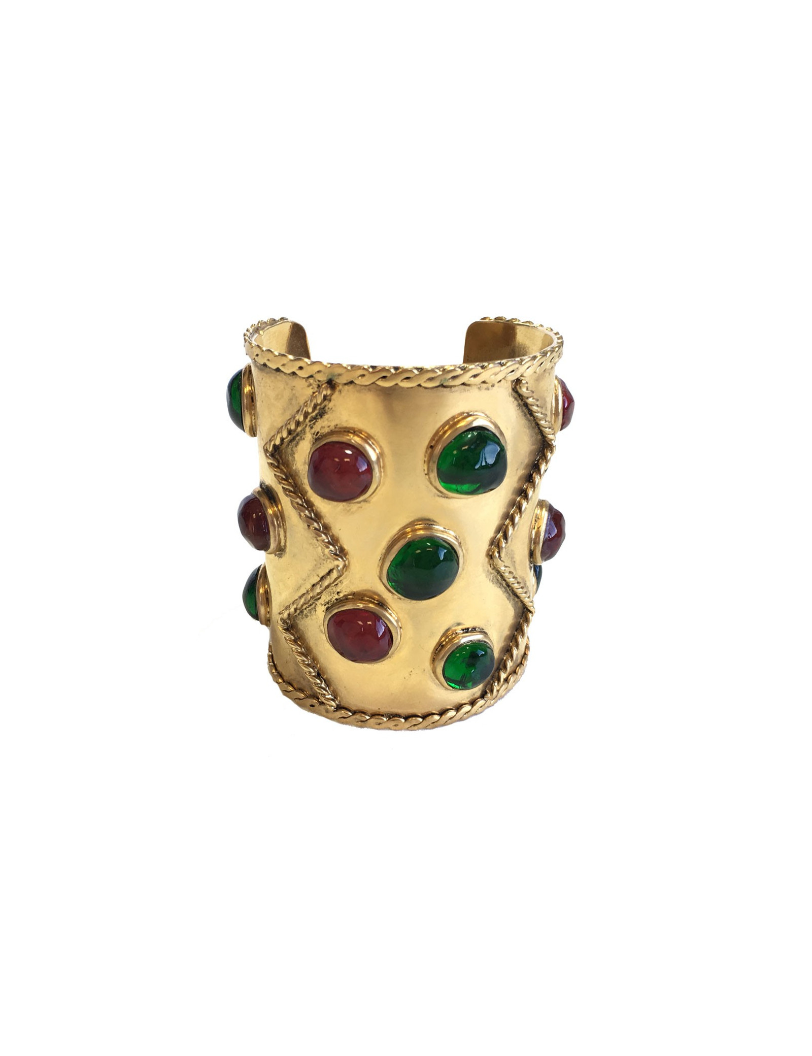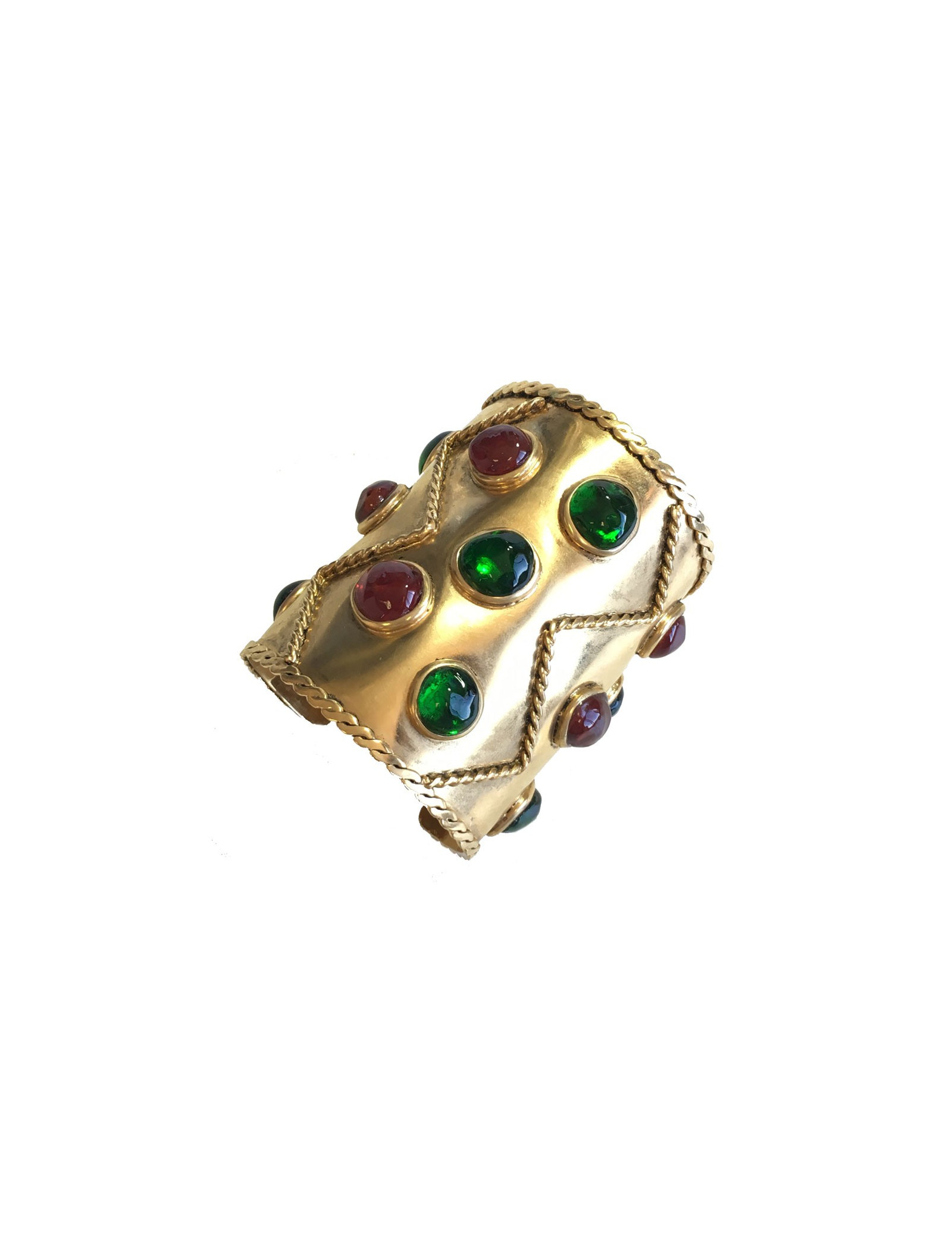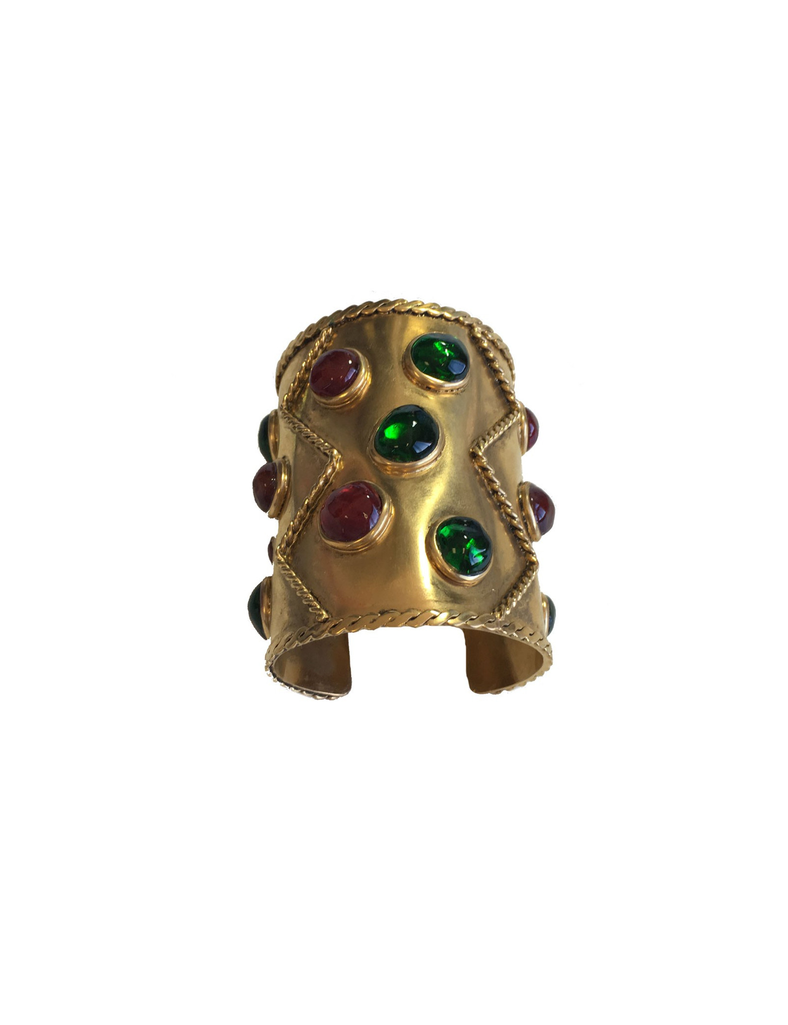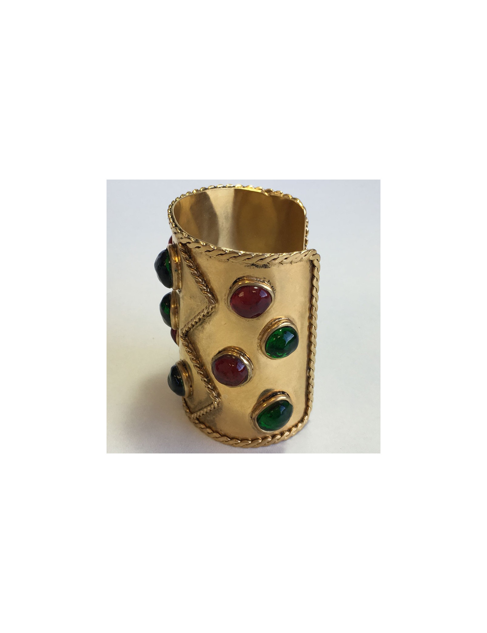 Manchette MARGUERITE de VALOIS en métal doré et pâte de verre couleur émeraude et grenat