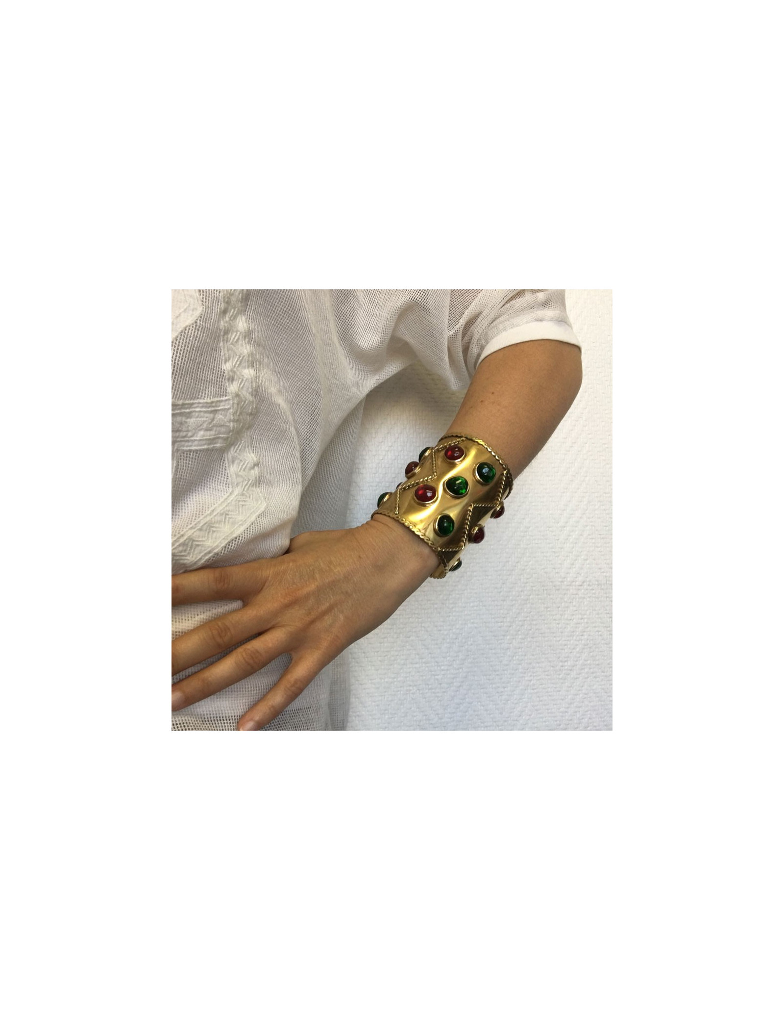 Manchette MARGUERITE DE VALOIS, style byzantin, en métal doré sertie de pâte de verre couleur émeraude et grenat. En très bon état.
