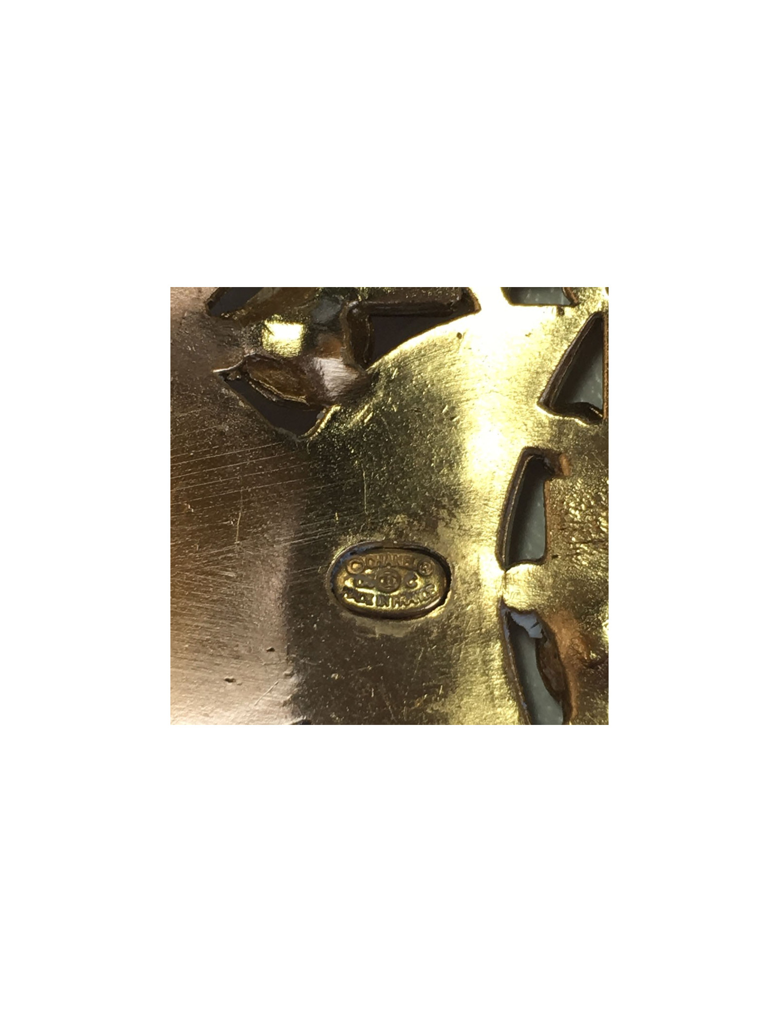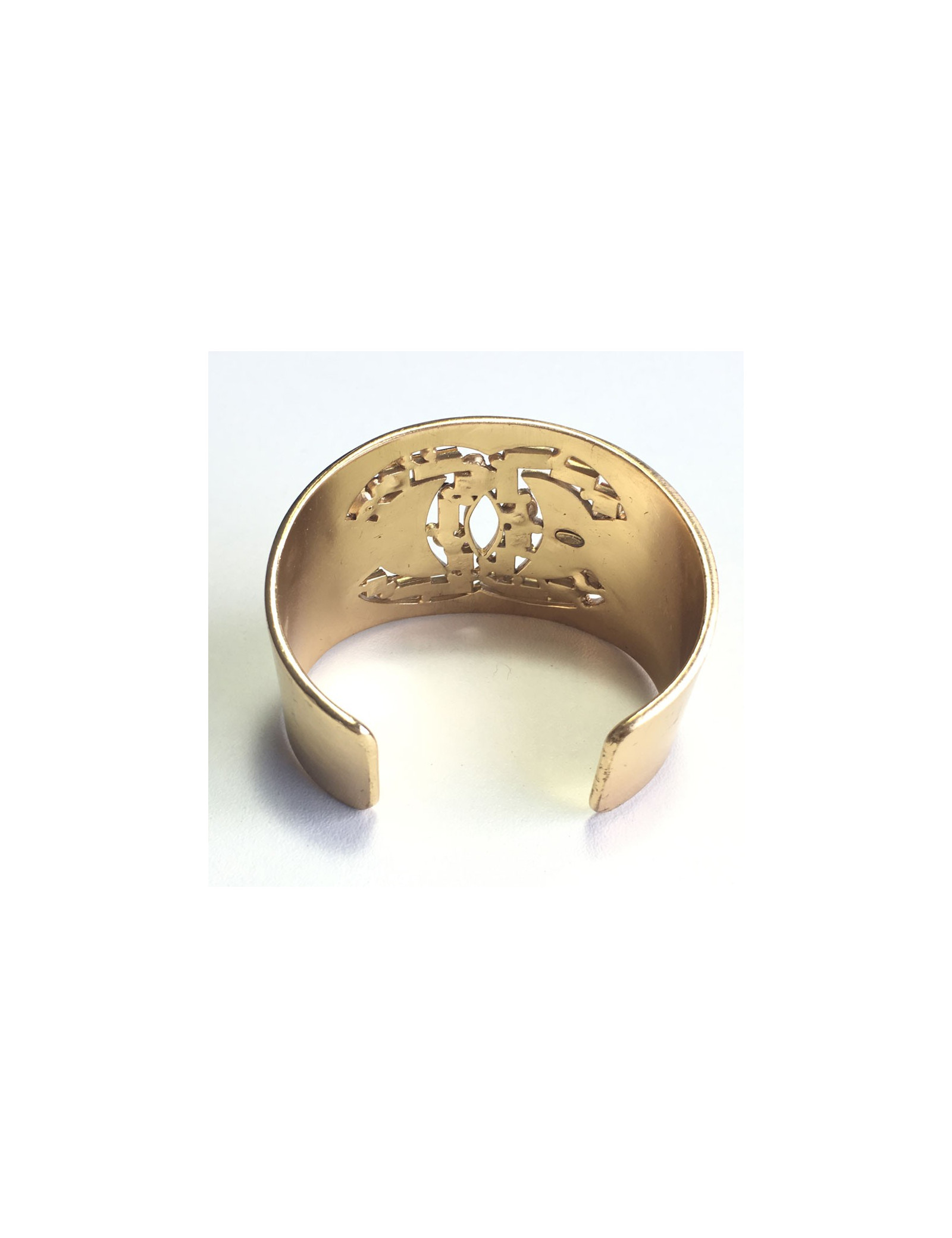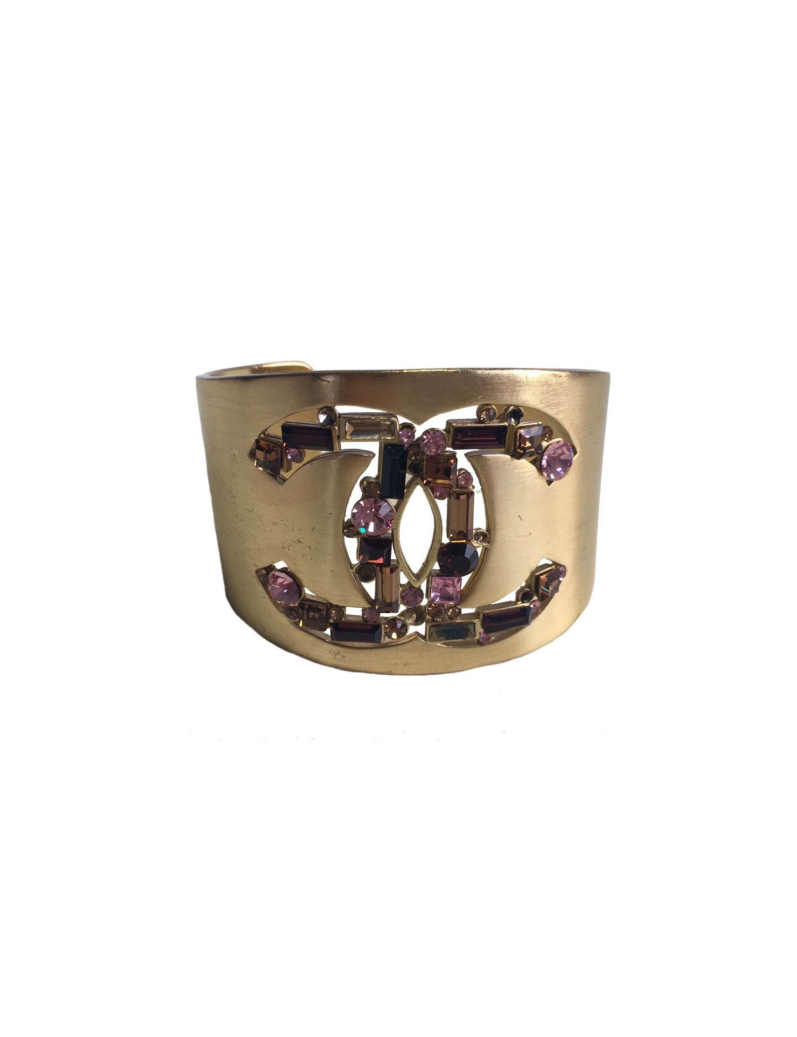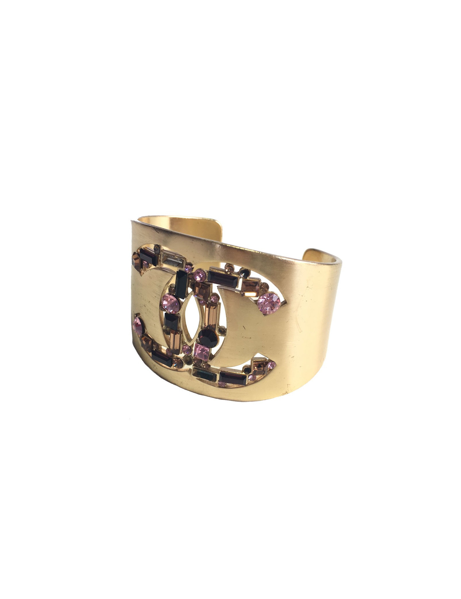 Belle manchette CHANEL en métal doré et CC serti de strass multicolores. En bon état. Des micros rayures sur l'ensemble du métal. Il manque quelques strass sur la manchette.