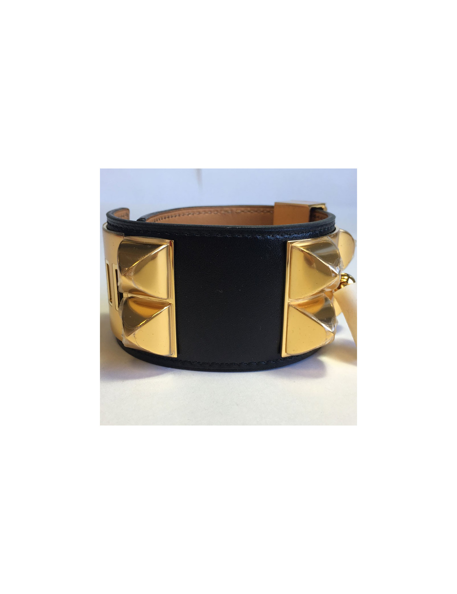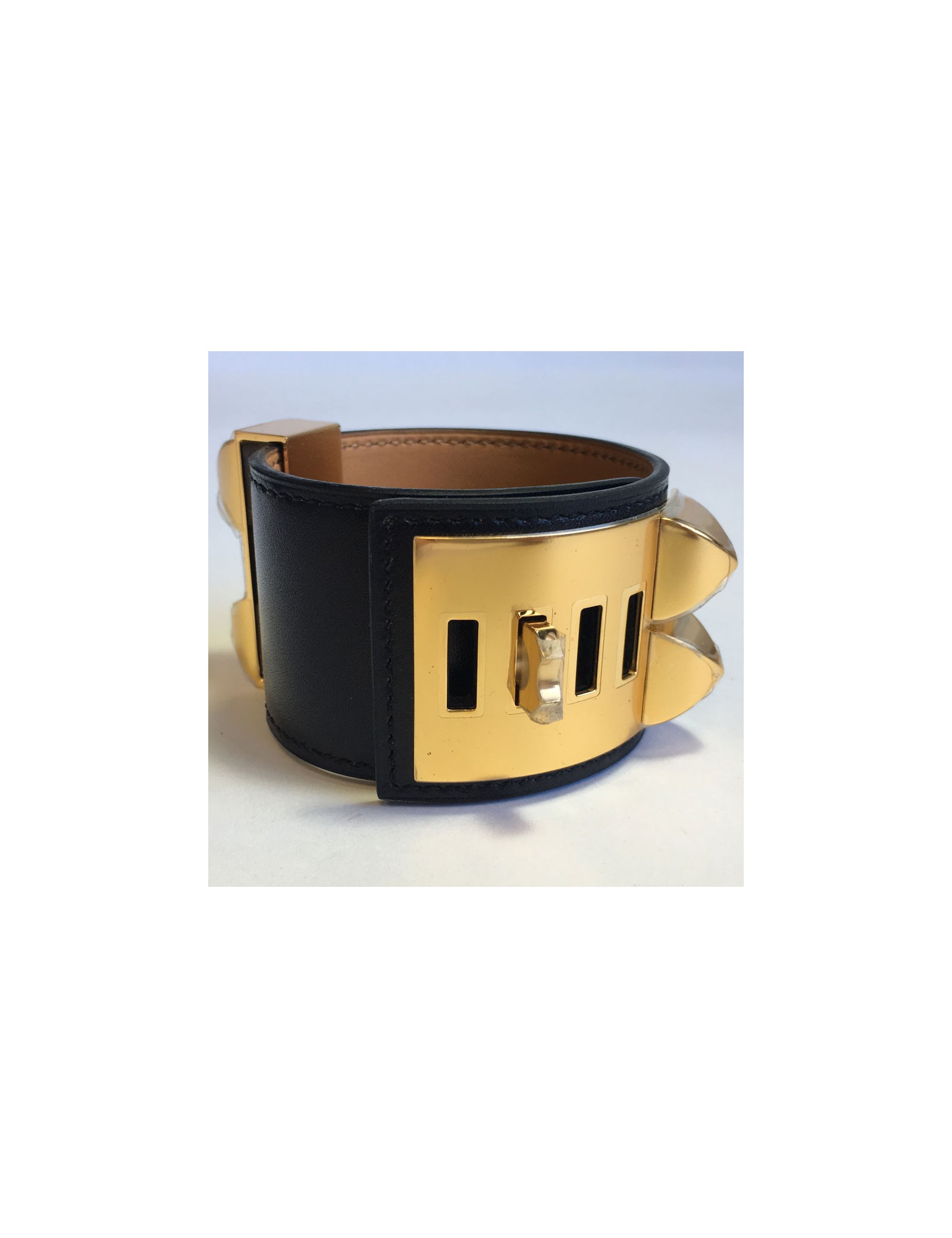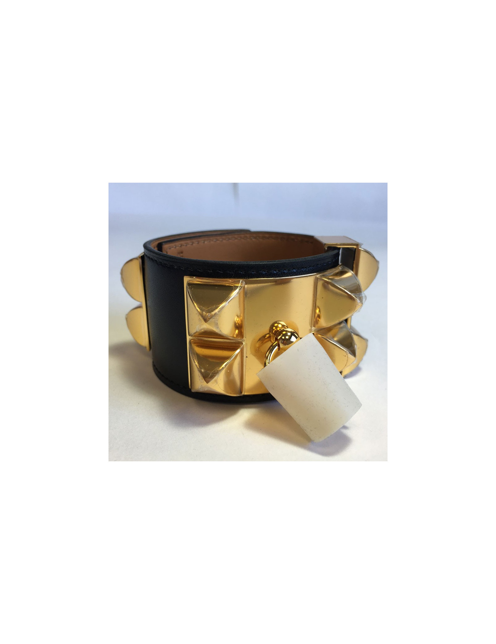 Superbe manchette HERMES Collier de Chien, taille S, en cuir box noir et bijouterie laiton plaquée or.