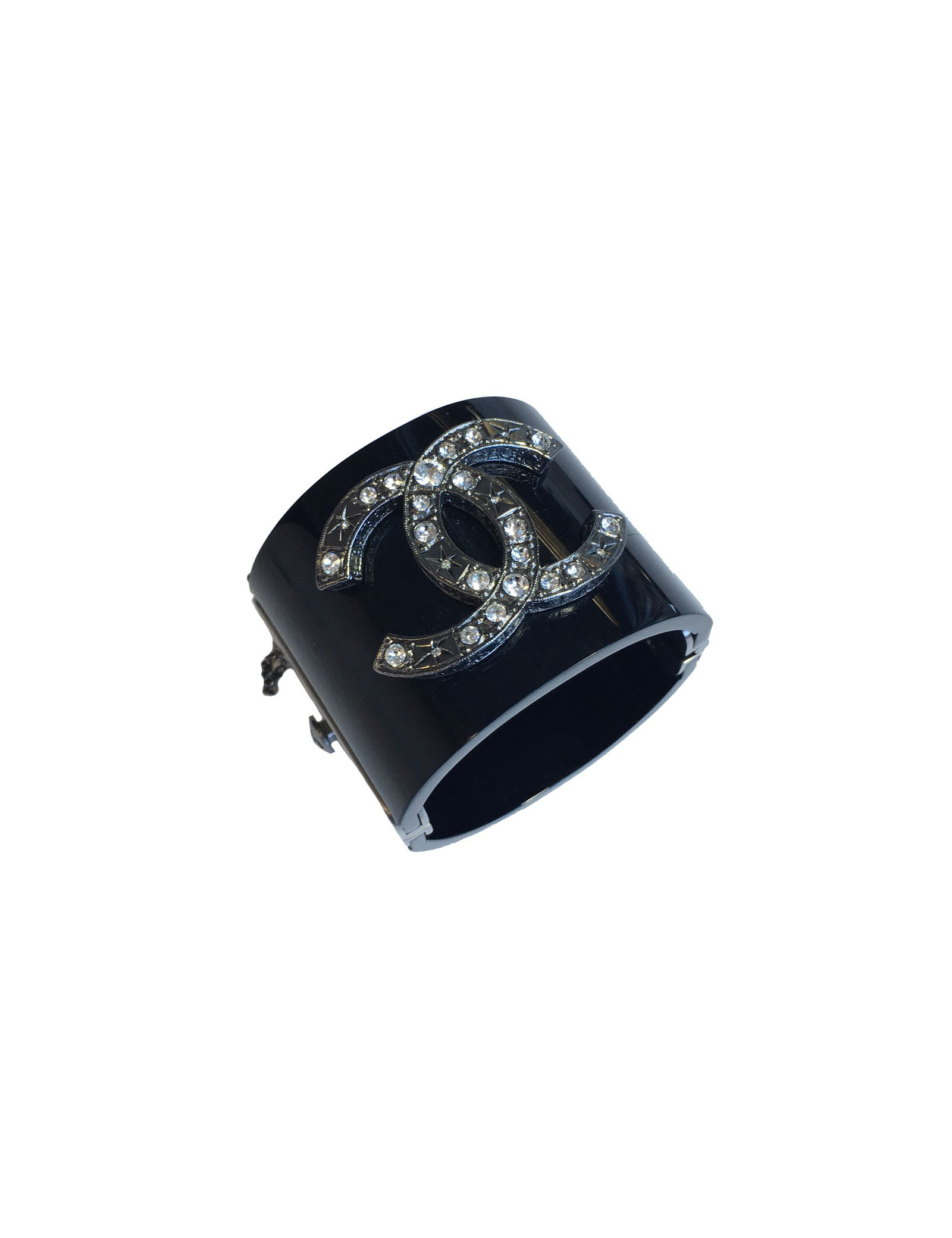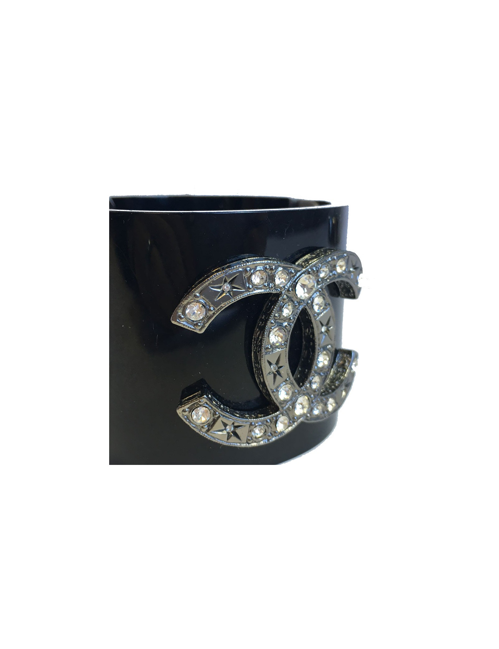 Manchette CHANEL en plexi noir et CC central en strass