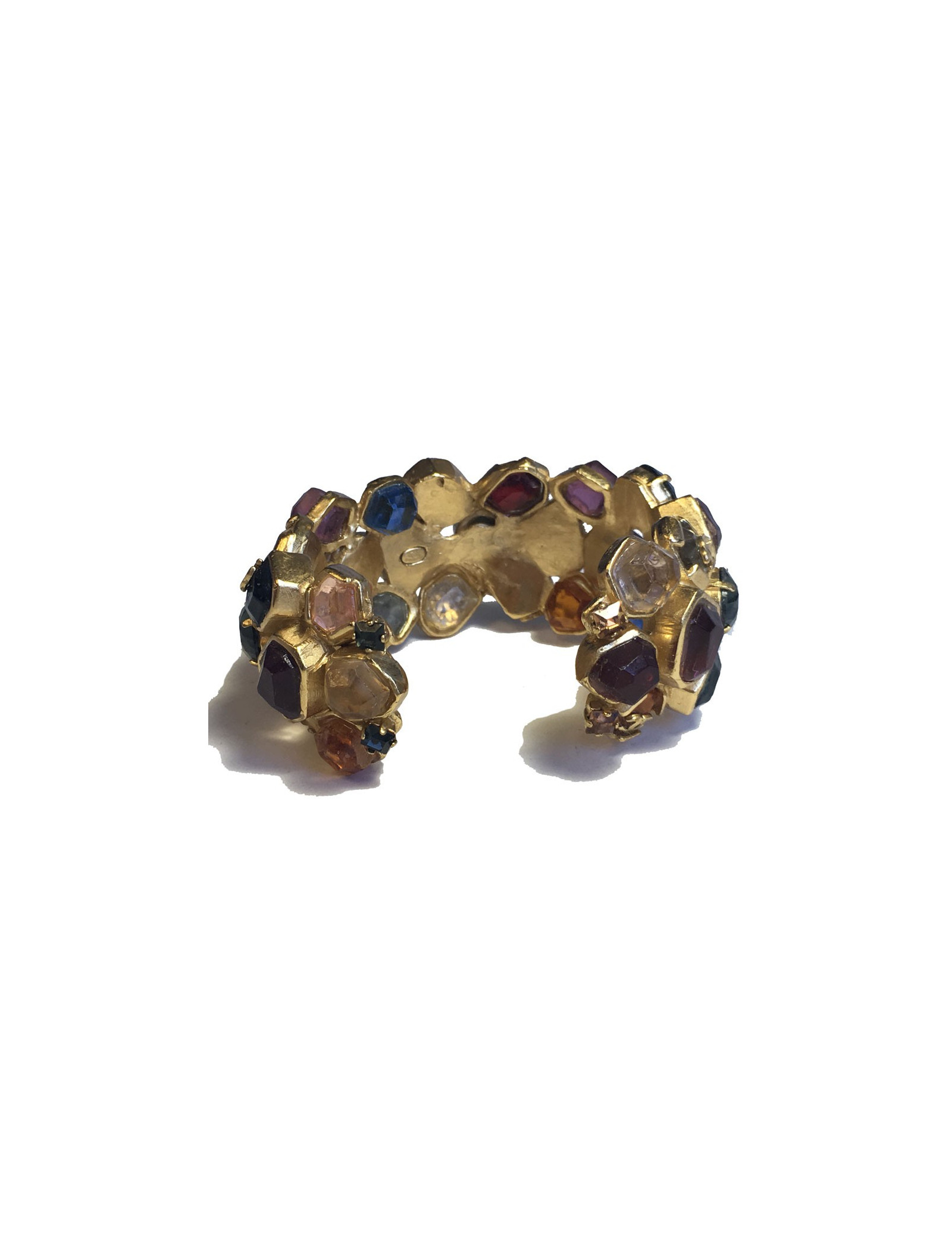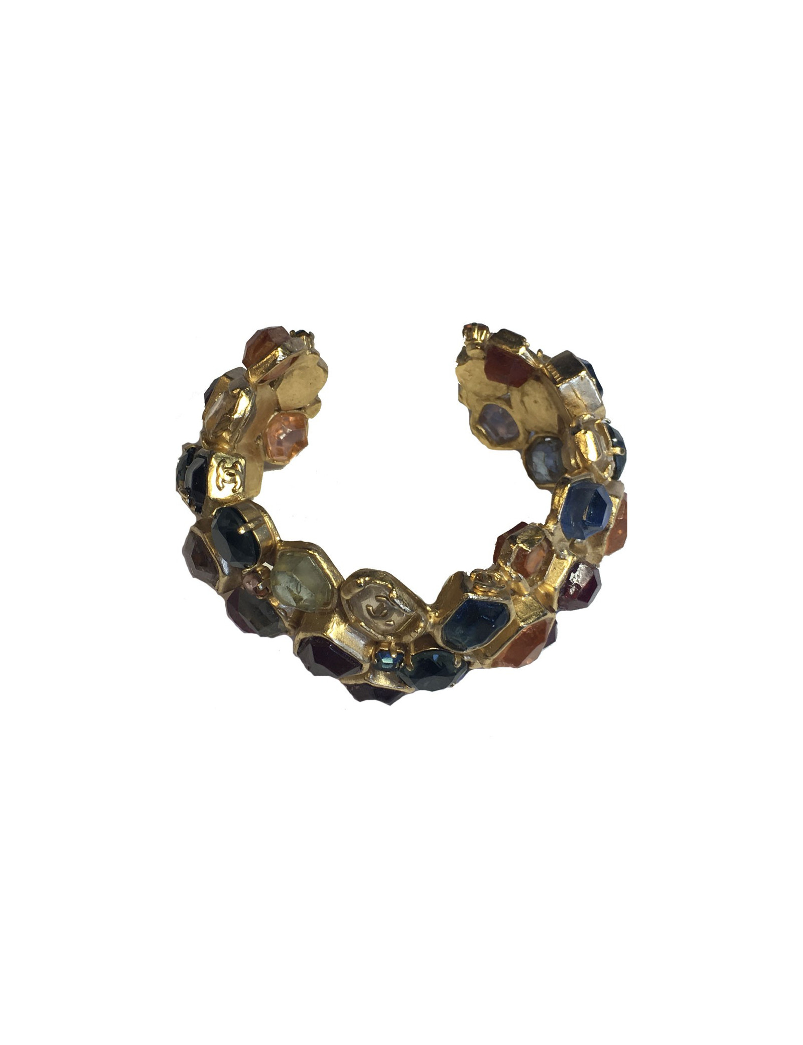Très beau bracelet CHANEL en métal doré à l'or fin et pierres multicolore. De petits CC dorés se trouvent sur quelques pierres. Jamais porté.