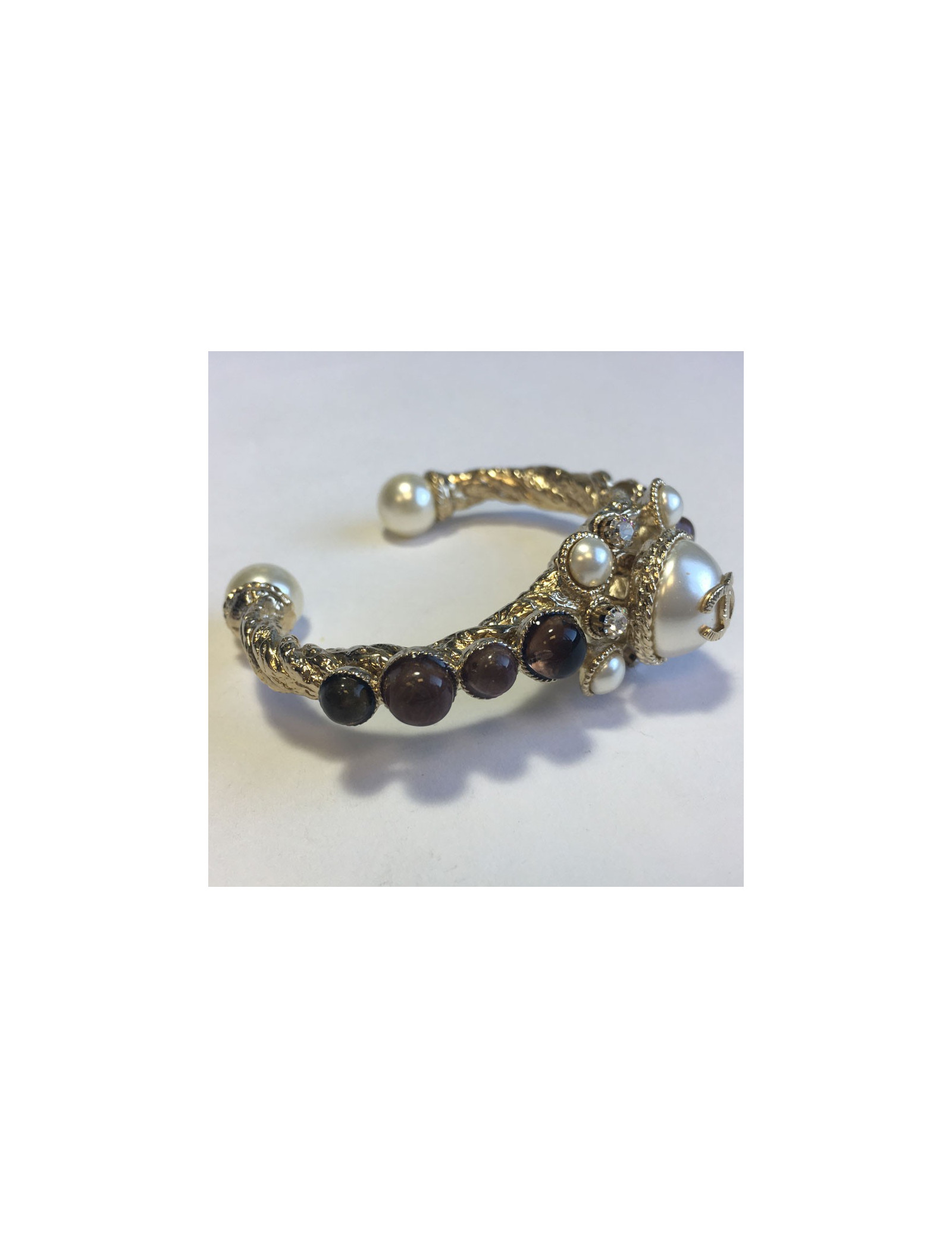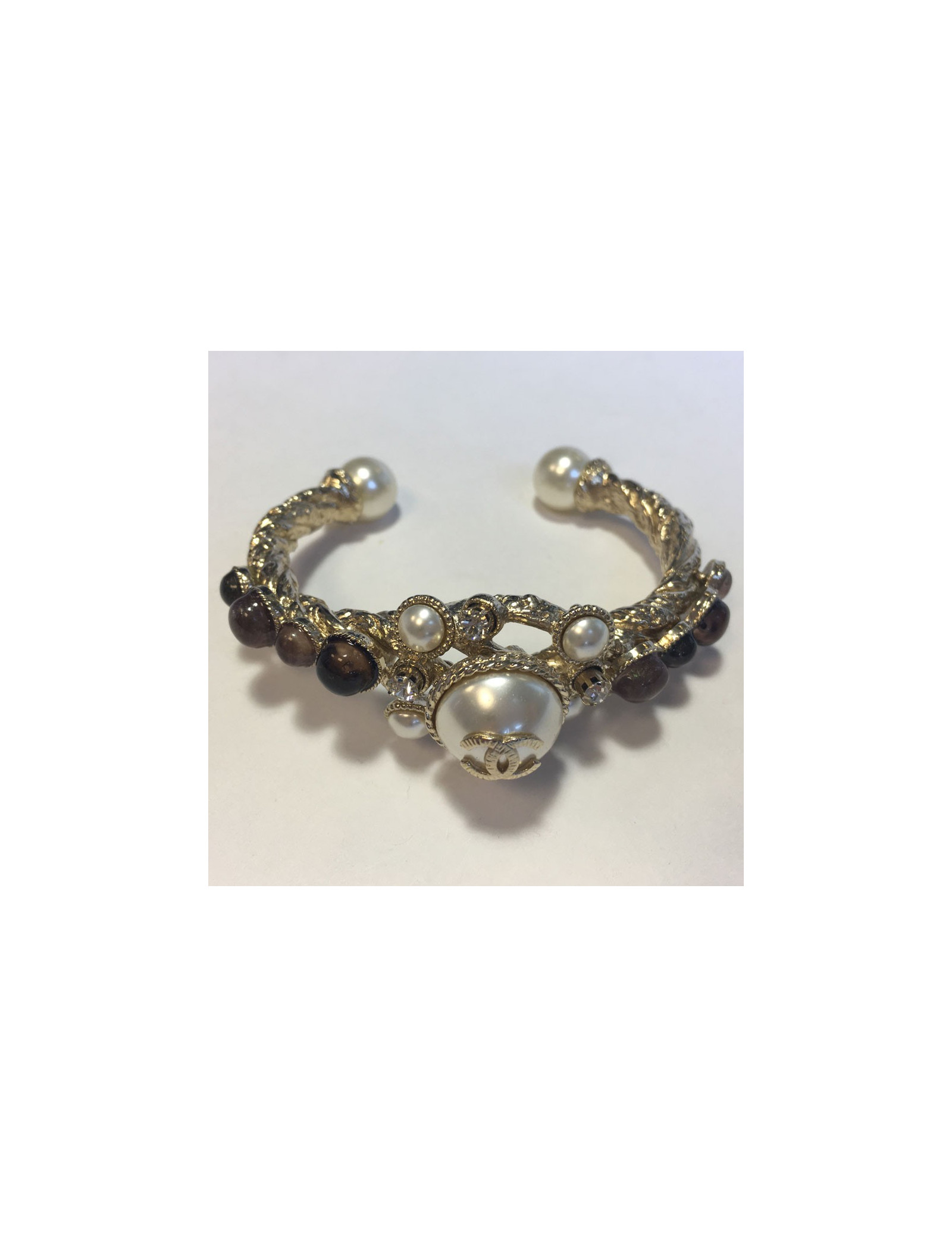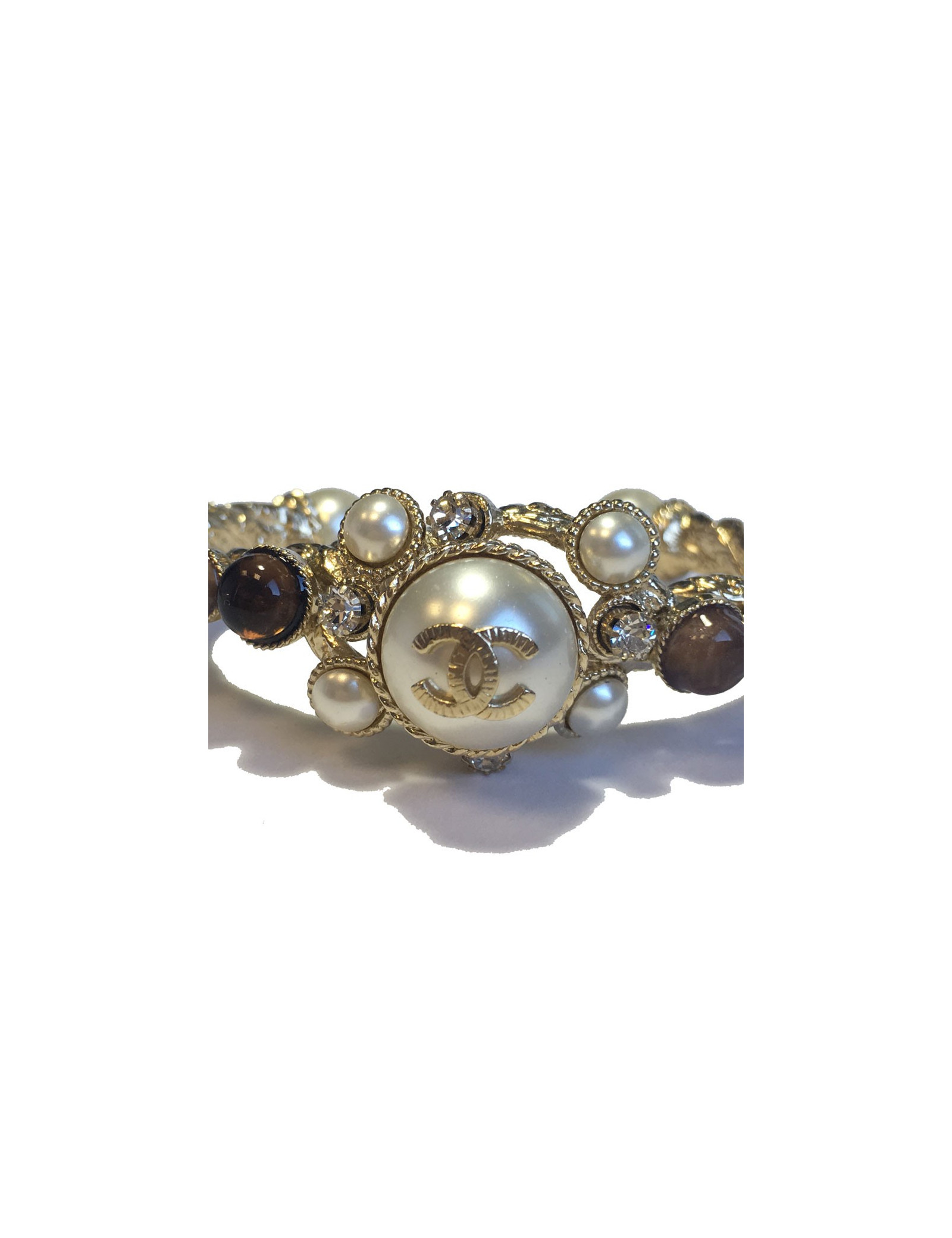 Magnifique bracelet CHANEL rigide, en métal doré torsadé, pâte de verre , strass et perles nacrées.