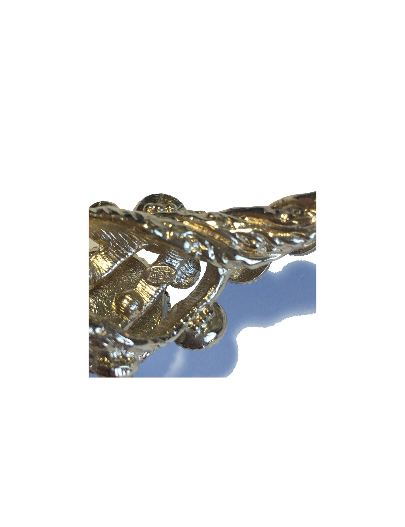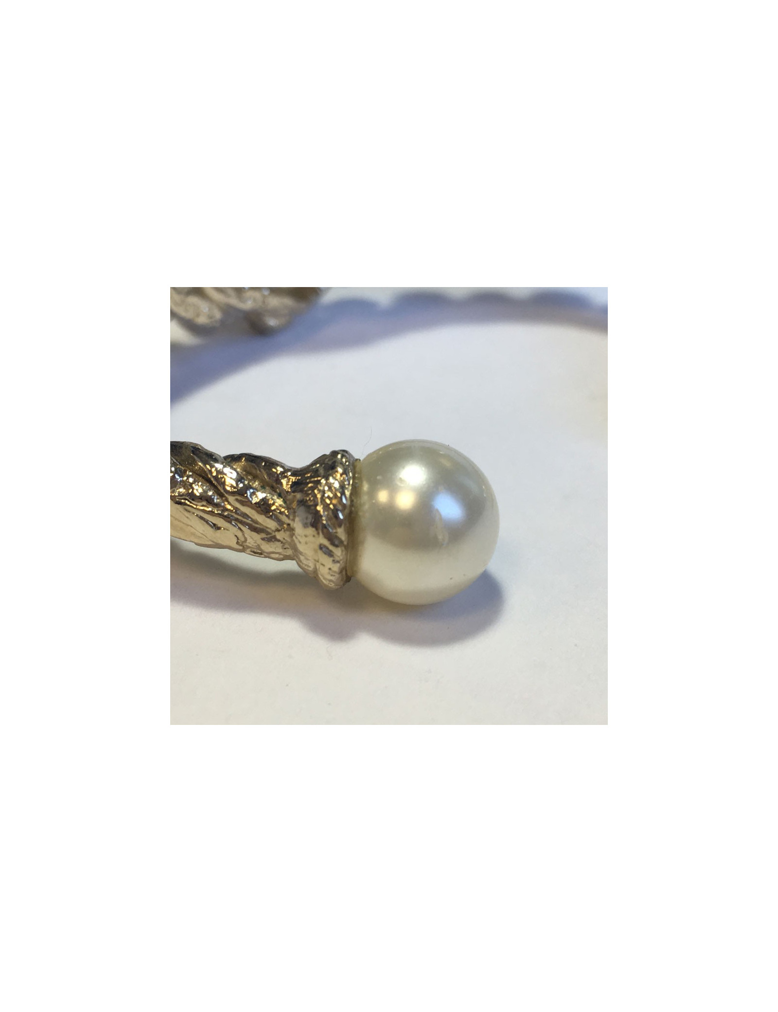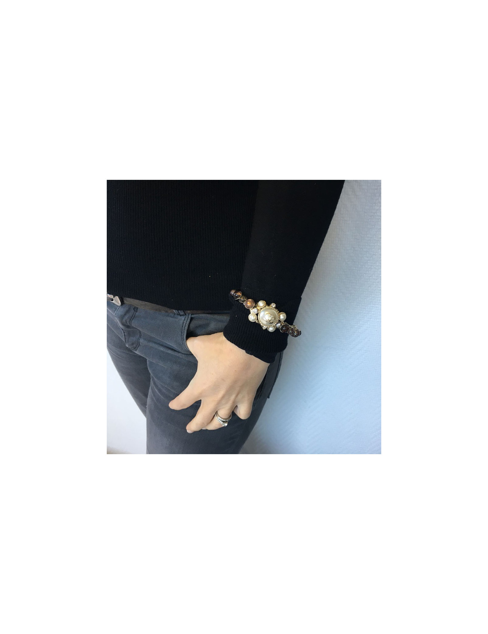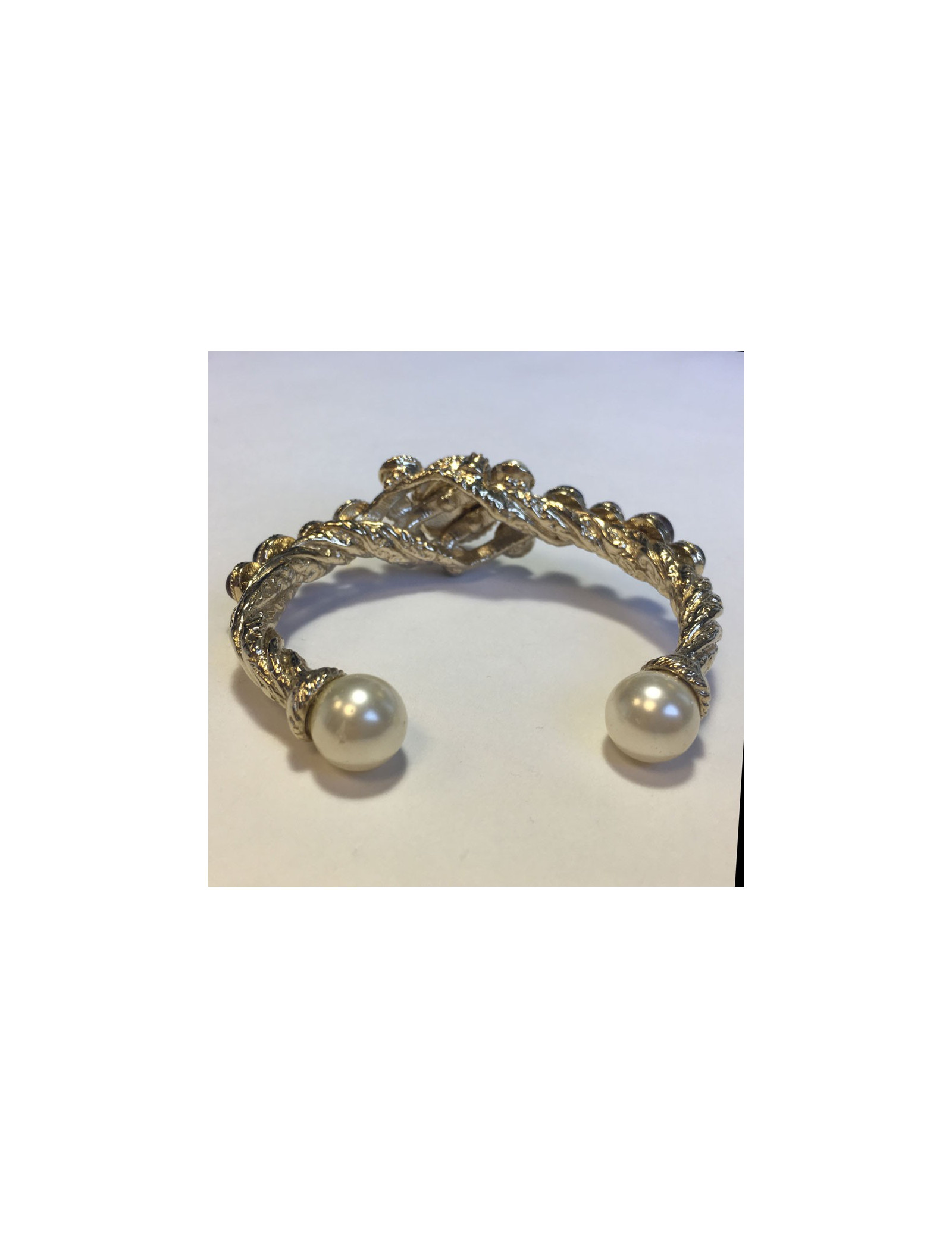 Magnifique bracelet CHANEL rigide, en métal doré torsadé, pâte de verre , strass et perles nacrées.