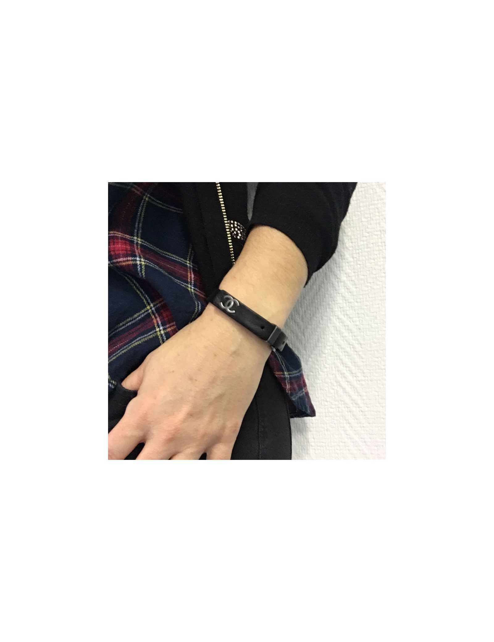 Bracelet CHANEL en cuir d'agneau lisse noir. Fermoir en métal argenté mat. Petit CC argenté sur l'extrémité du bracelet.