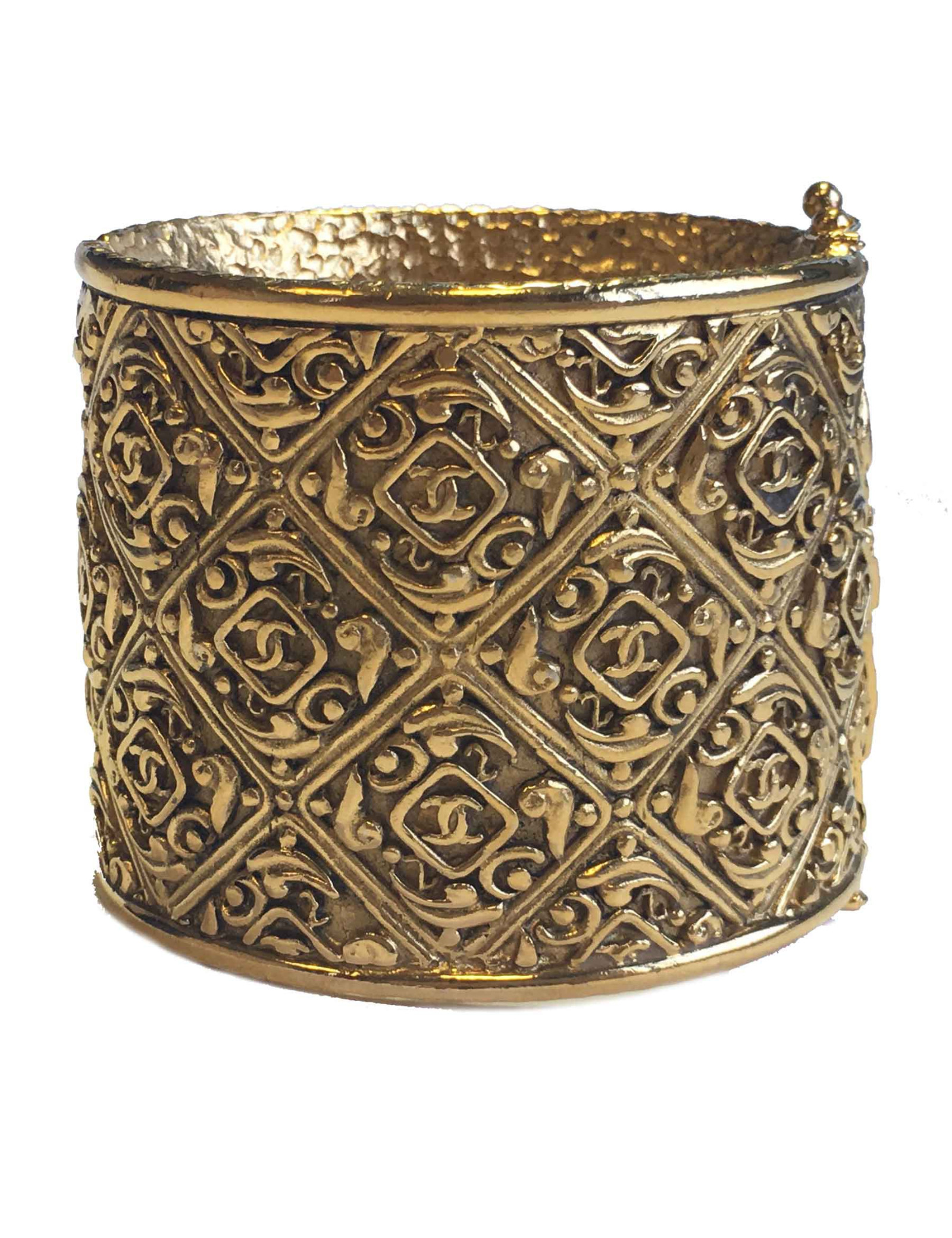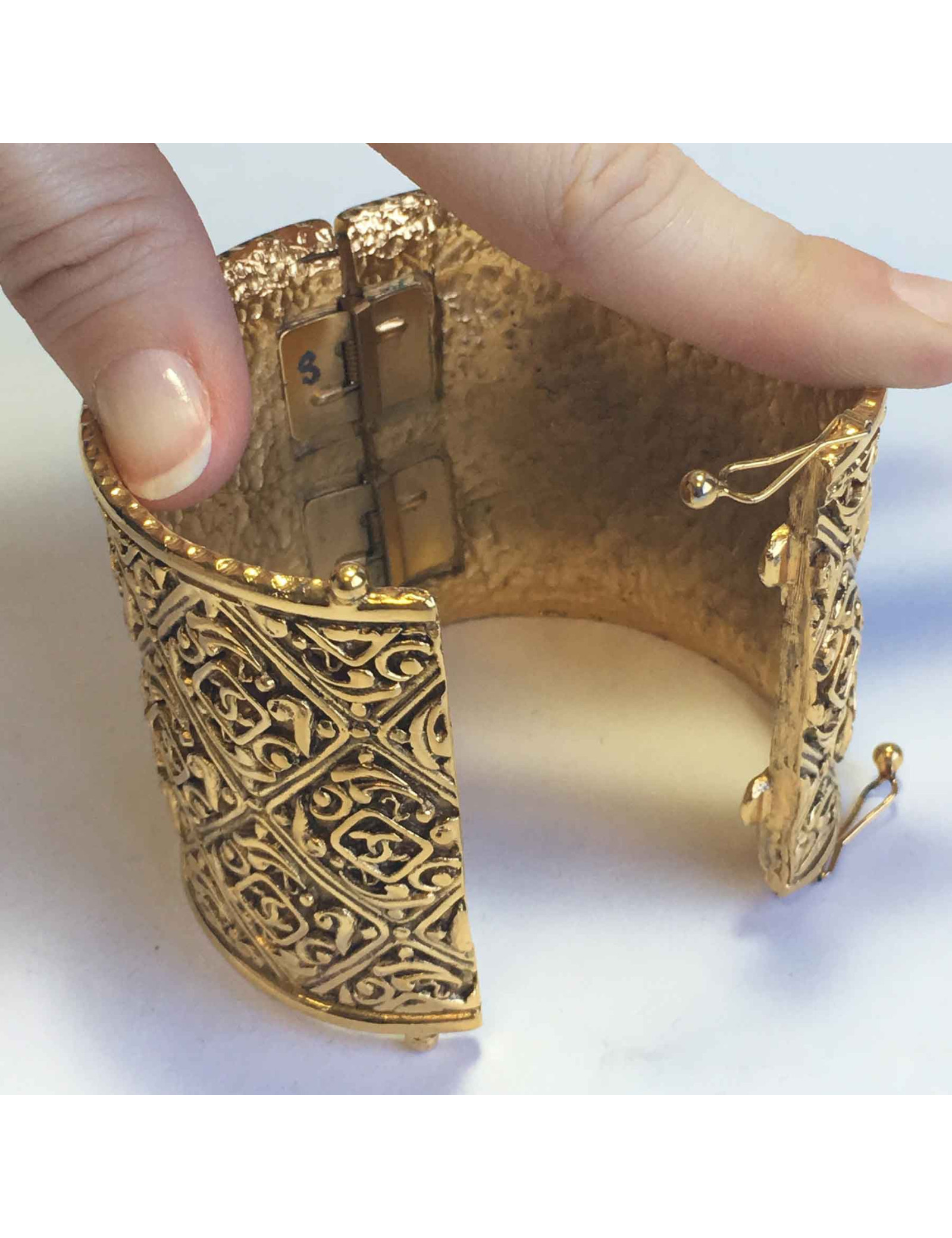 Exceptionnelle manchette CHANEL vintage en métal doré. Elle est articulée par 2 ressorts et se ferme avec 2 petits fermoirs. L'intérieur de la manchette est martelé, l'extérieur est orné de CC en relief.