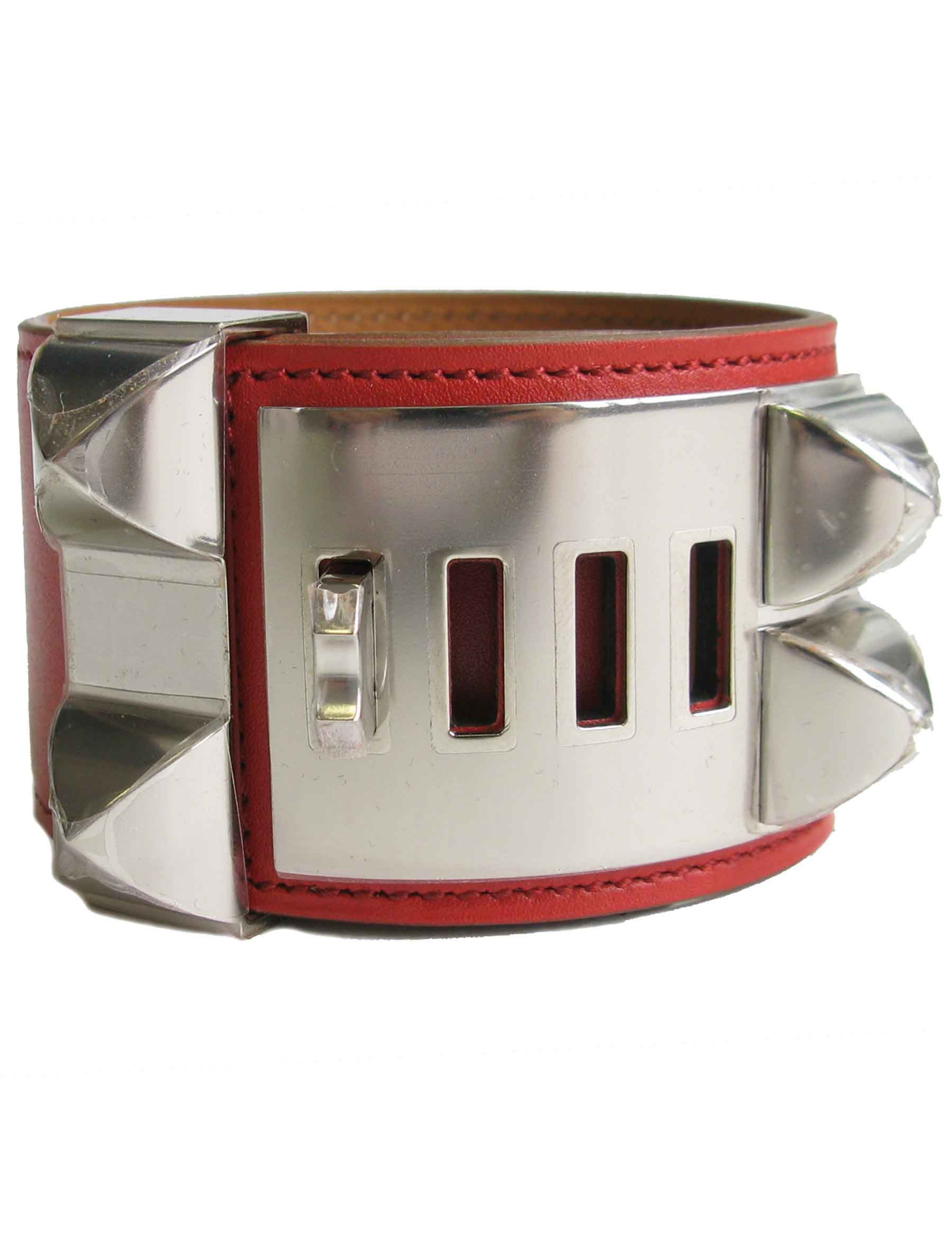 Manchette Médor Collier de Chien Hermès en cuir de veau tadelakt couleur sanguine, accastillage en métal argent palladié.