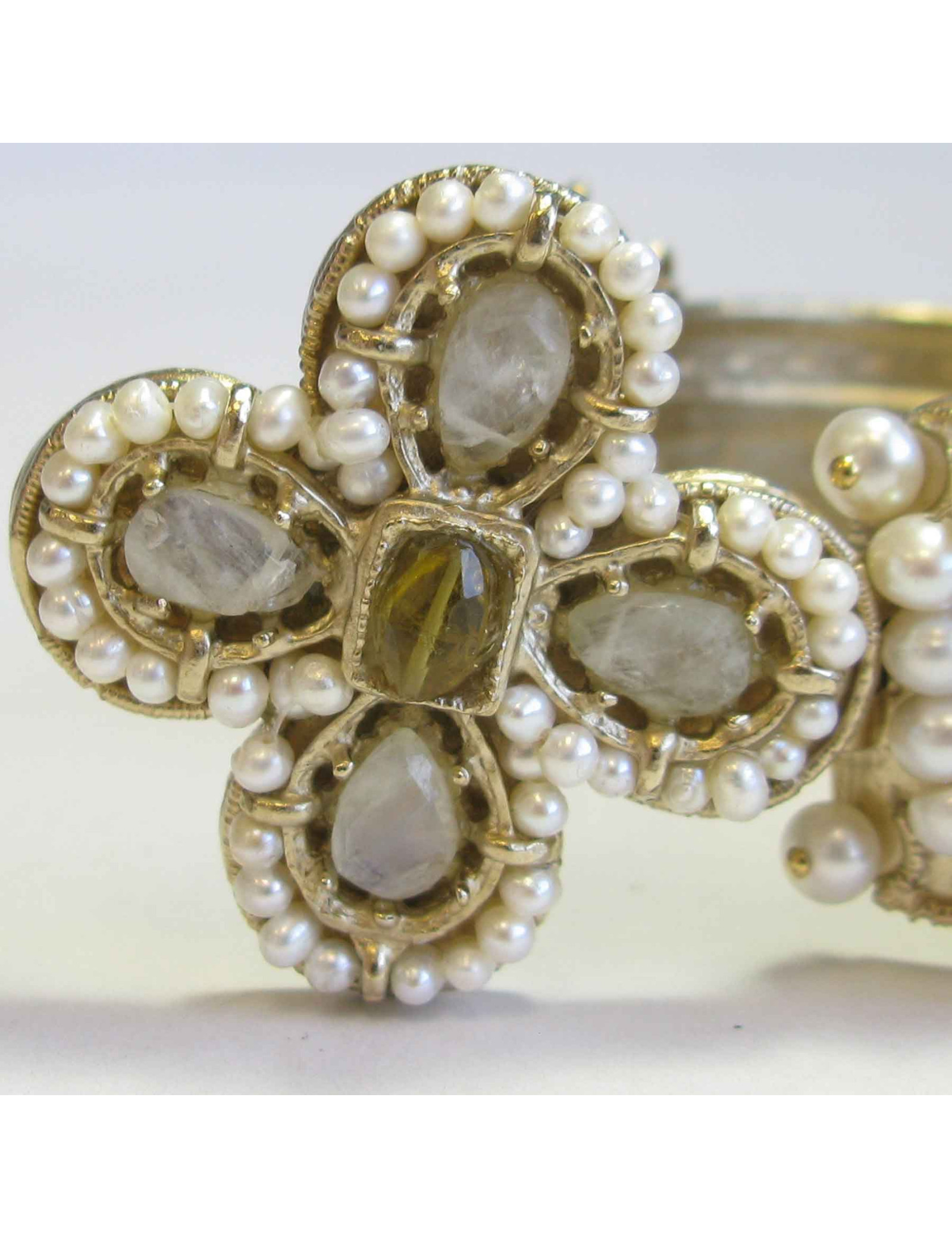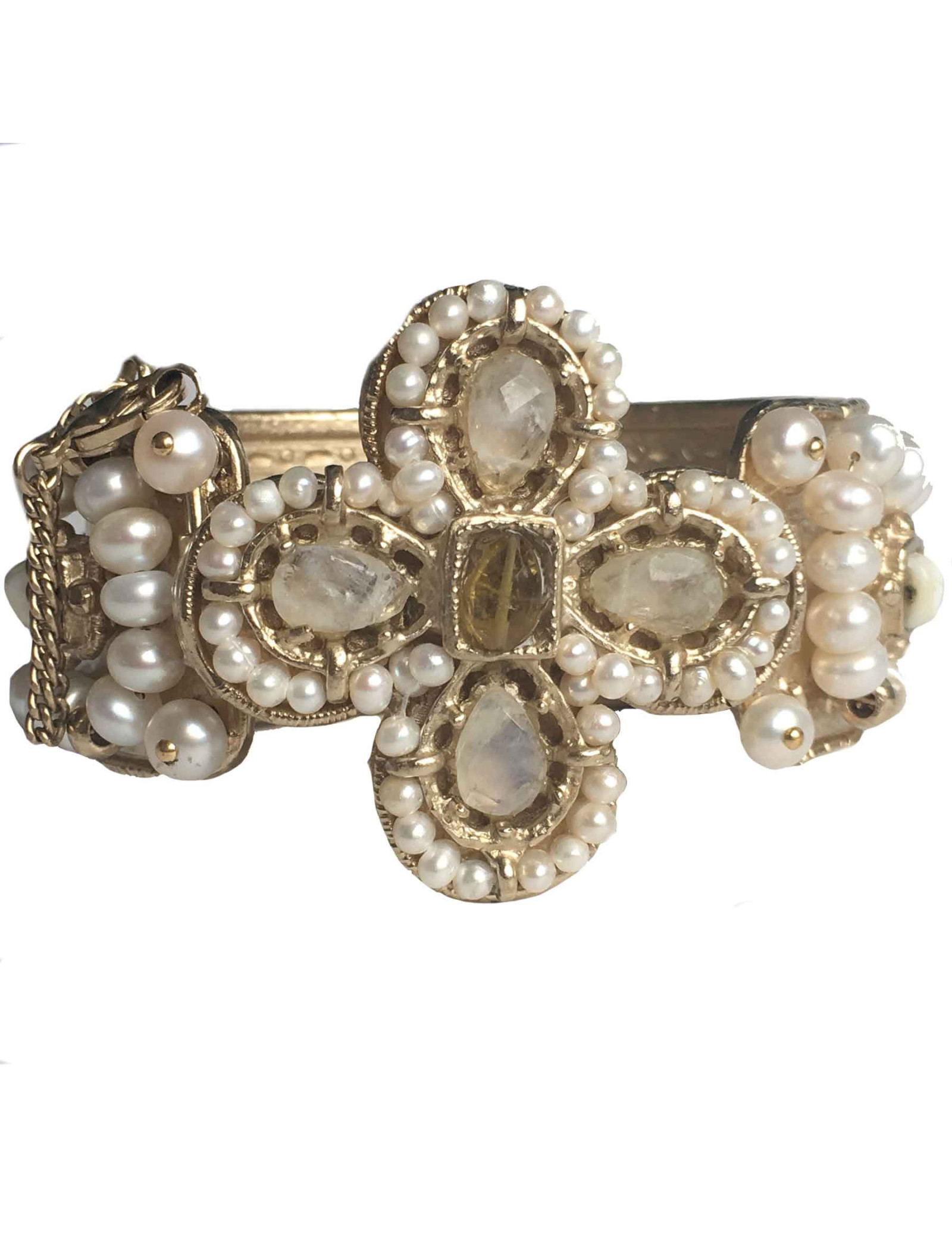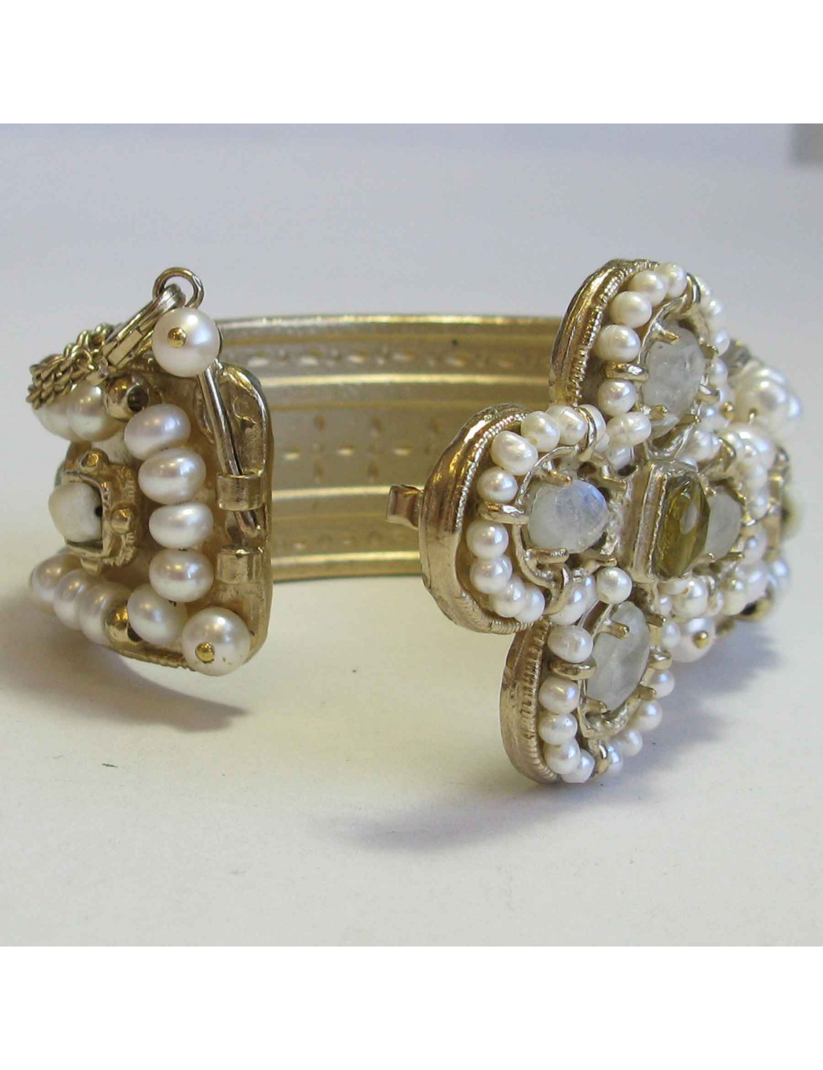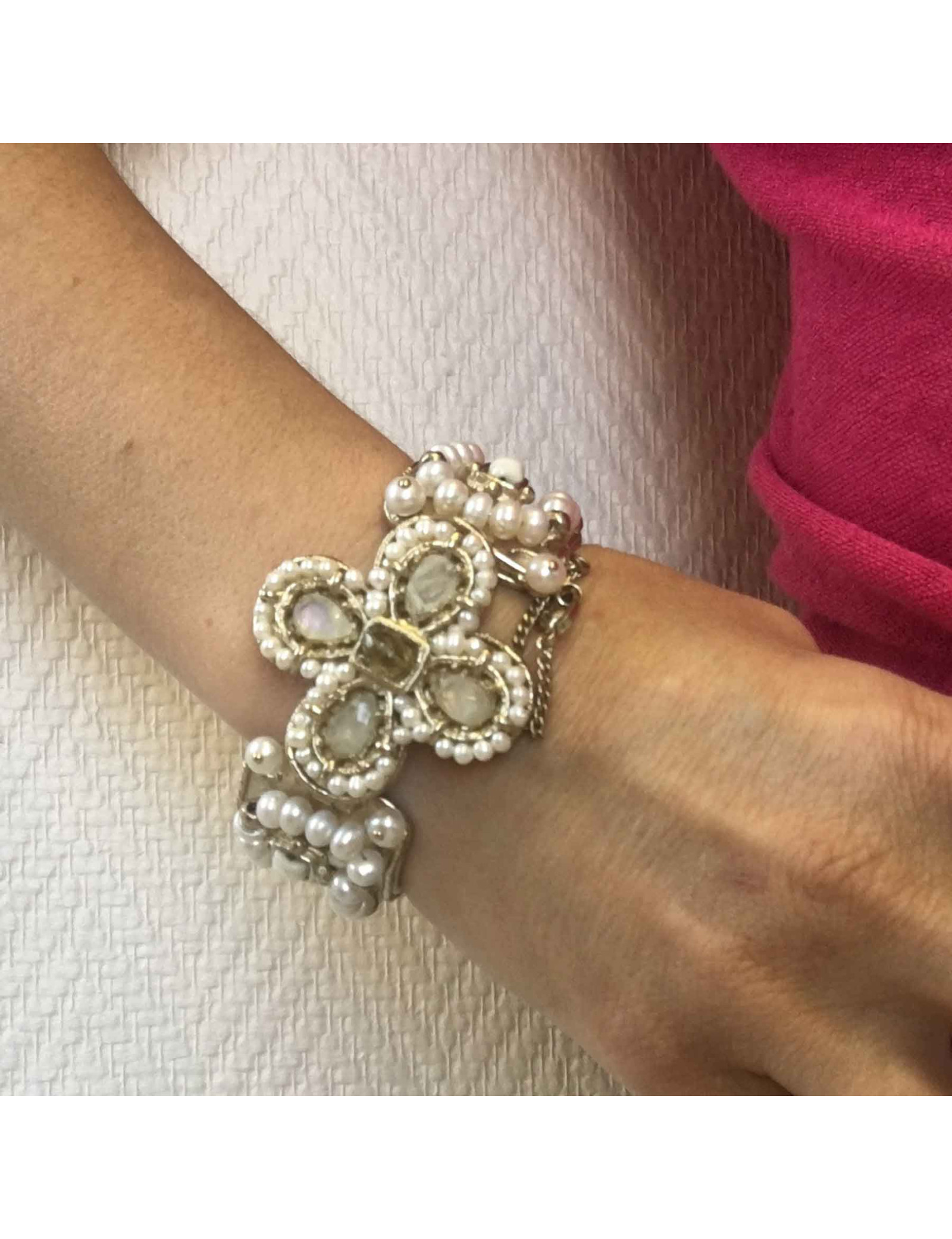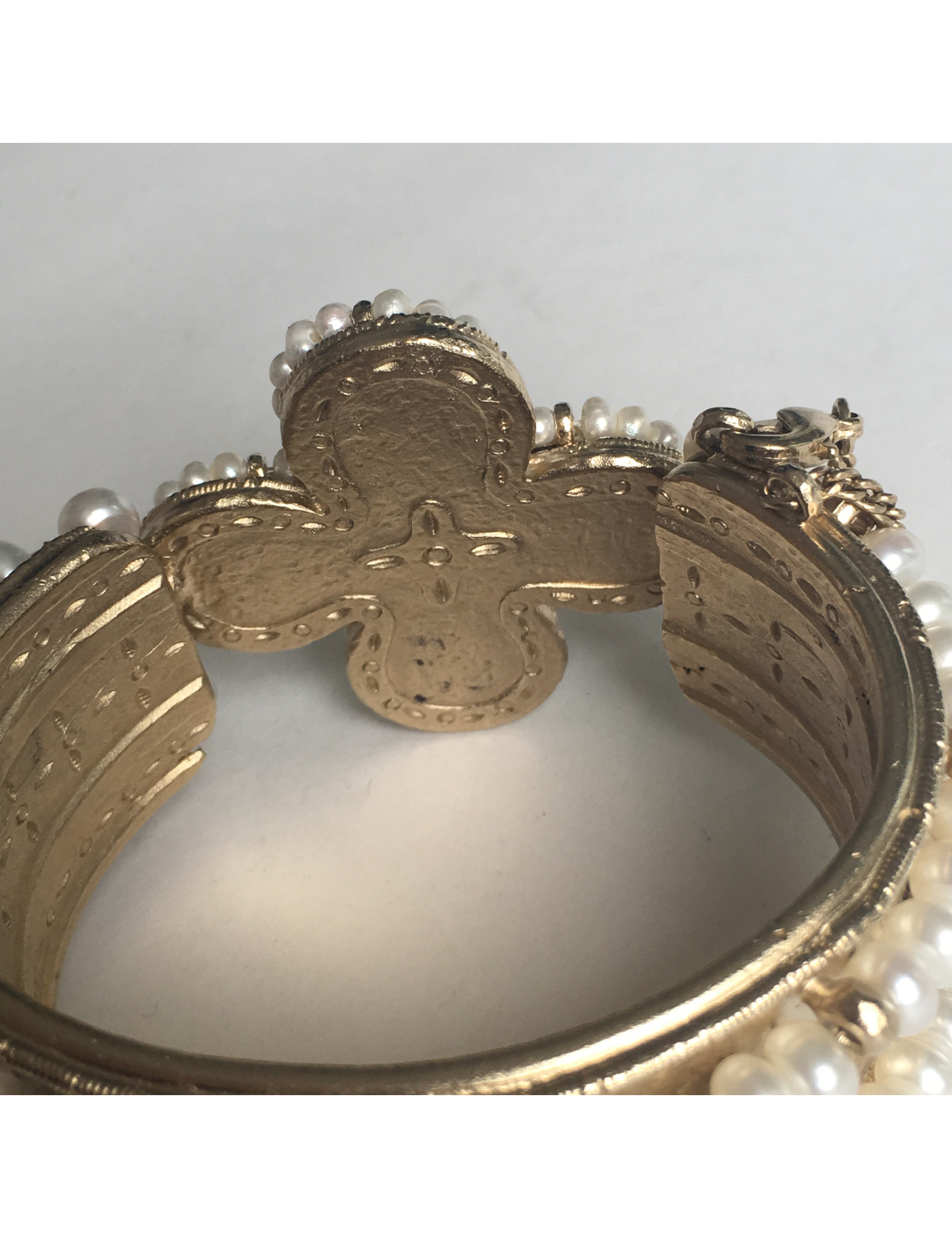 Sublime et couture, manchette Chanel issue de la collection des Métiers d'Art Paris-Rome. En métal doré or mat, sertie de perles nacrées, petites pierres ivoires, transparentes pailletées. Belle croix sur le devant du bracelet tout en perles et pierres facettées transparentes et ambre.