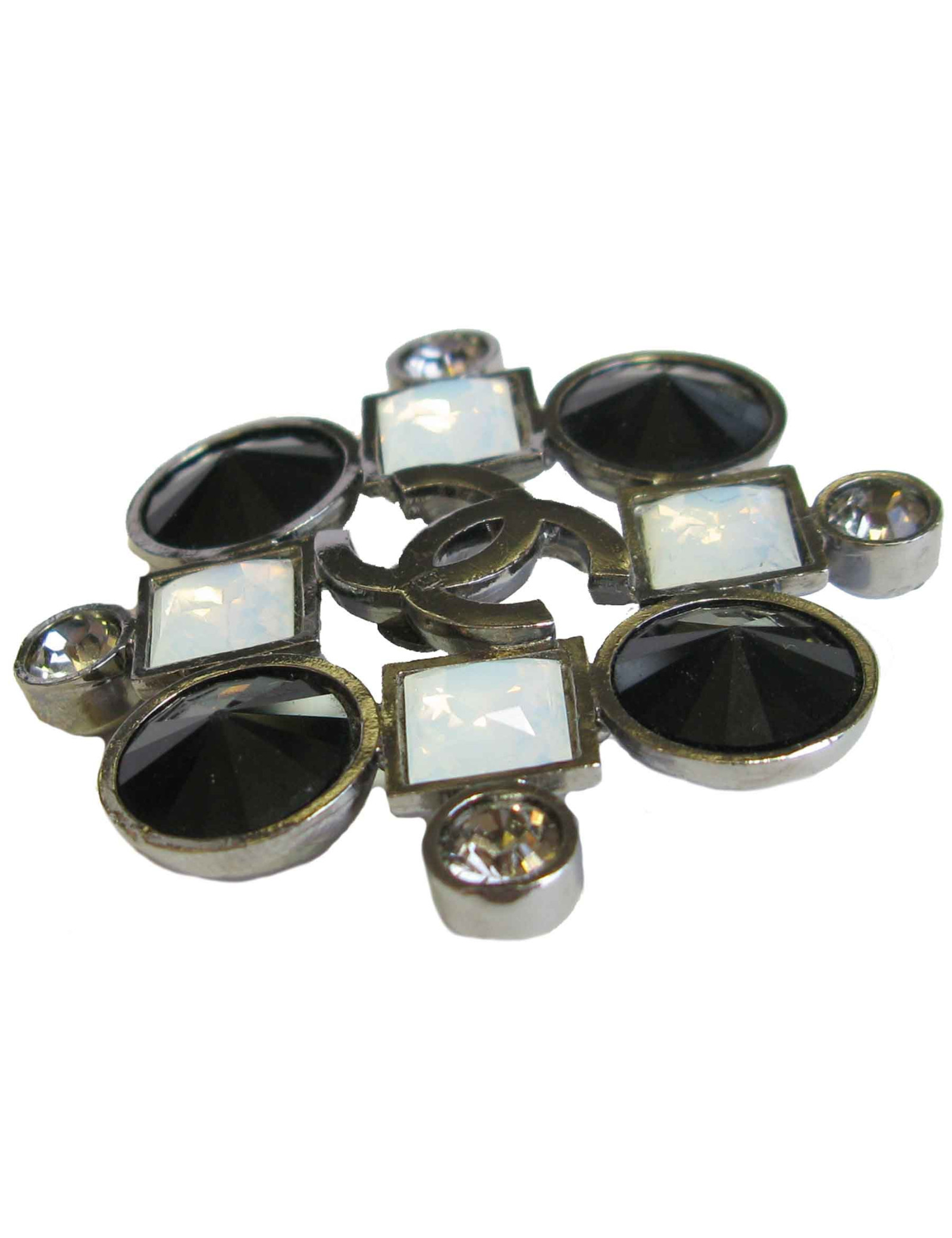 Broche Chanel en métal argenté serie de strass ronds et carrés. Couleur : noir, transparent et blanc. Un CC se trouve au centre de la broche.