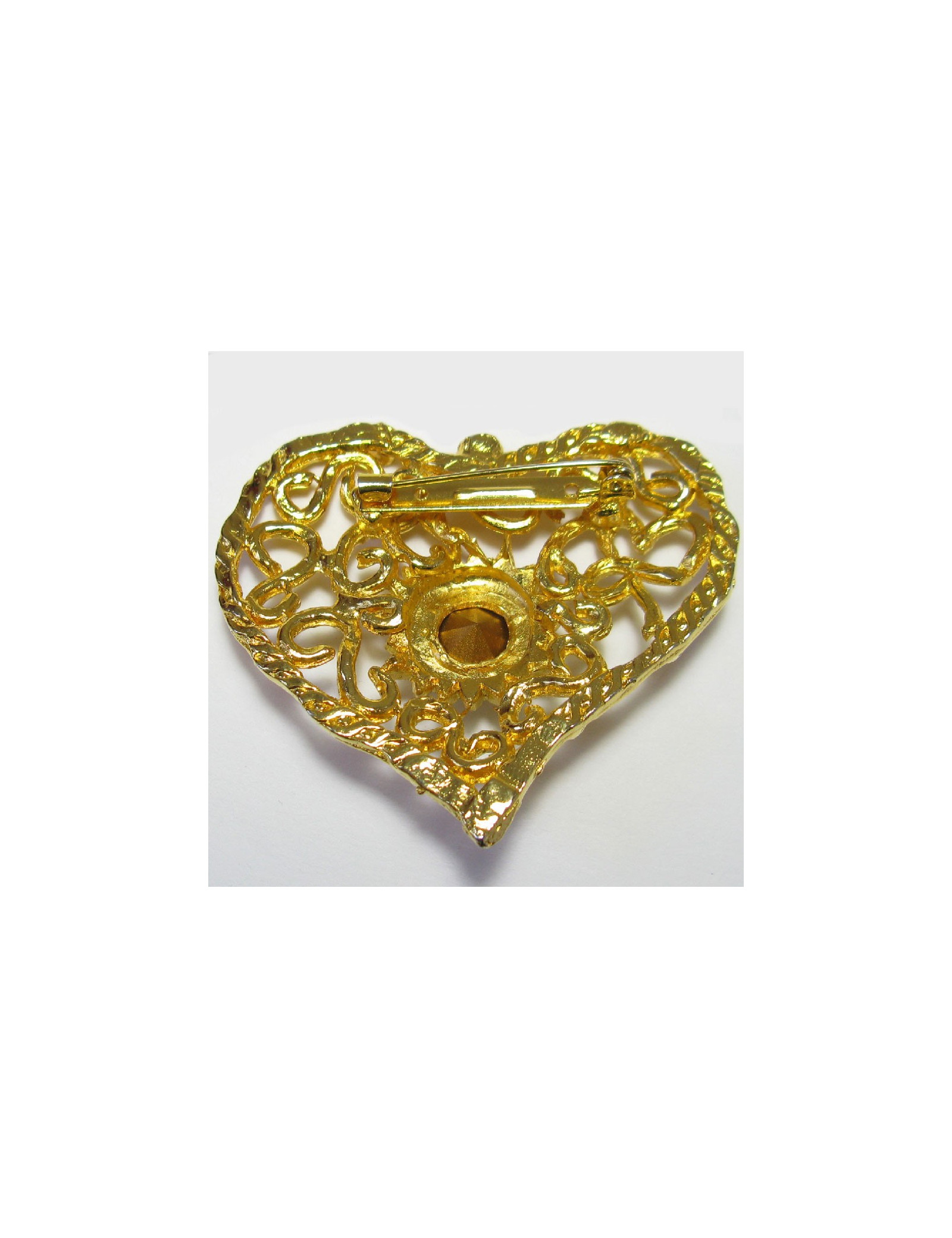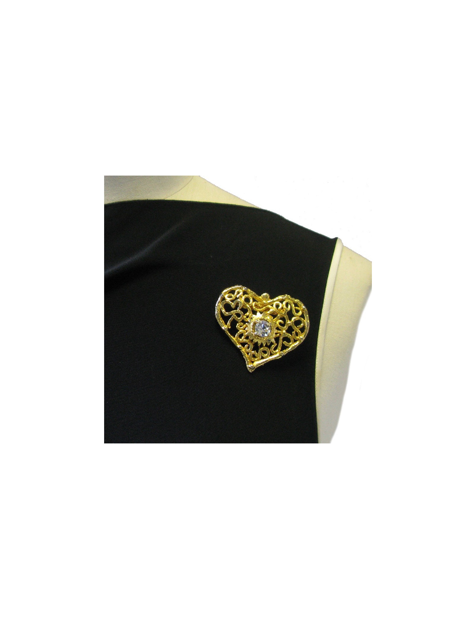 Broche CHRISTIAN LACROIX vintage coeur en métal doré serti d'un grand strass blanc au centre
