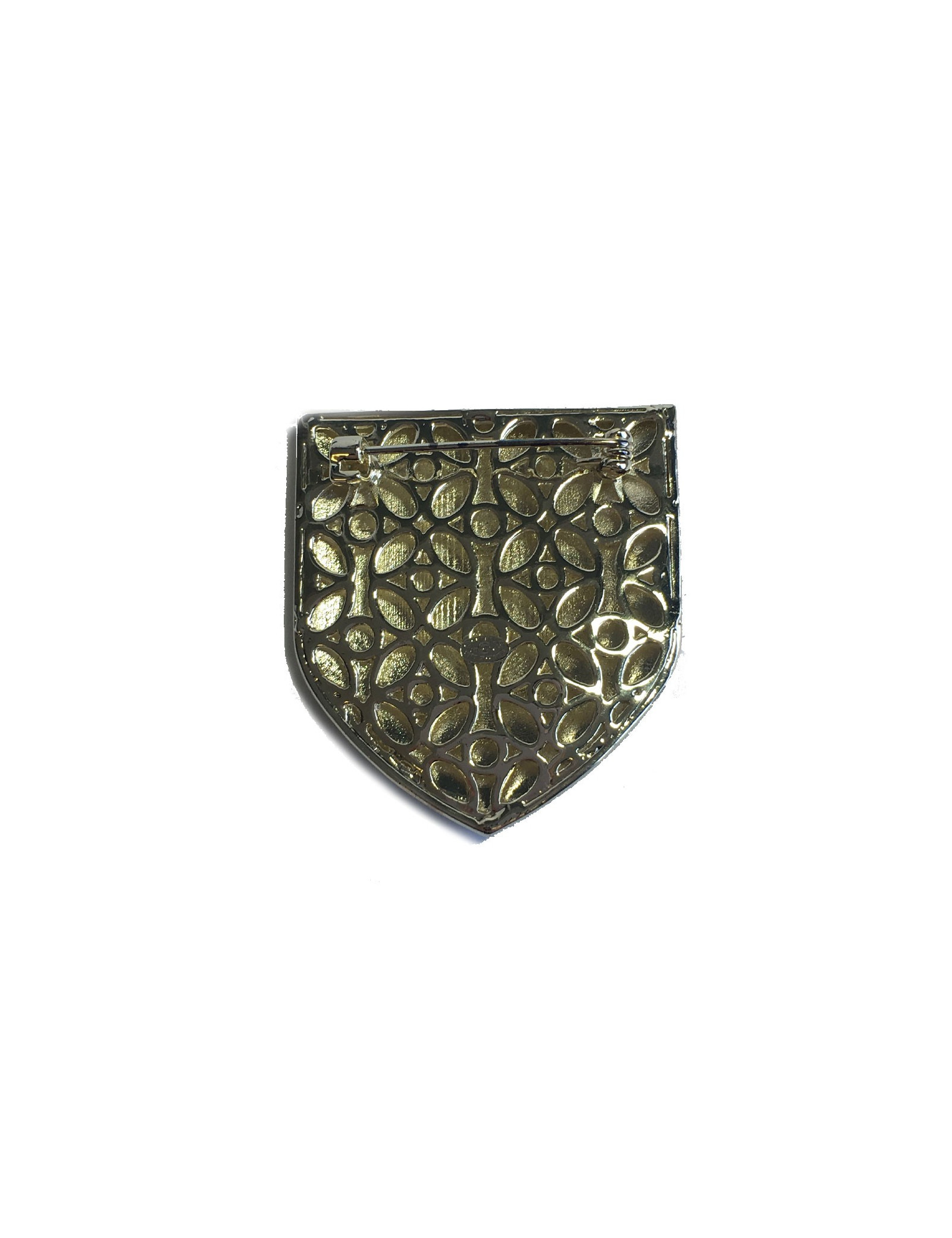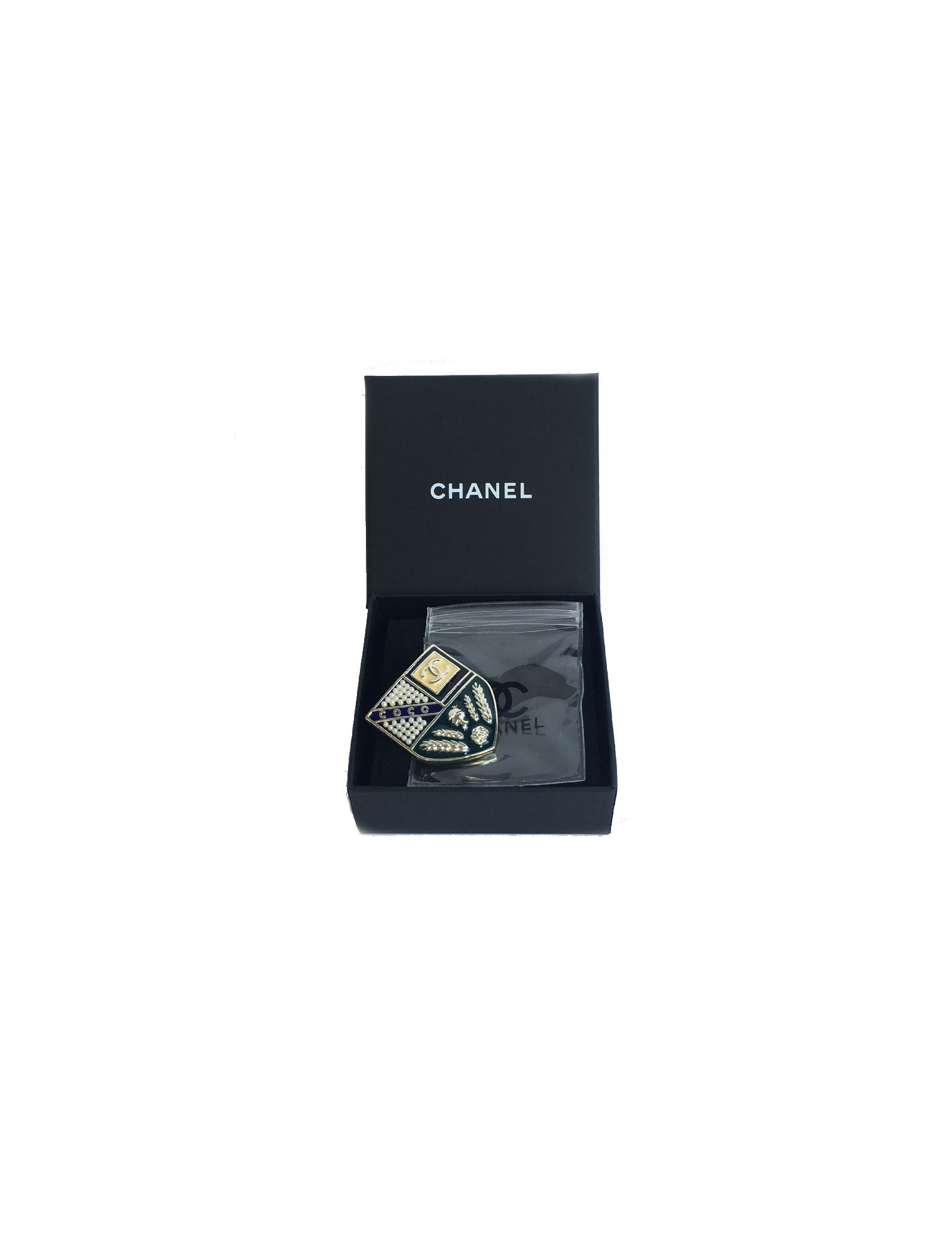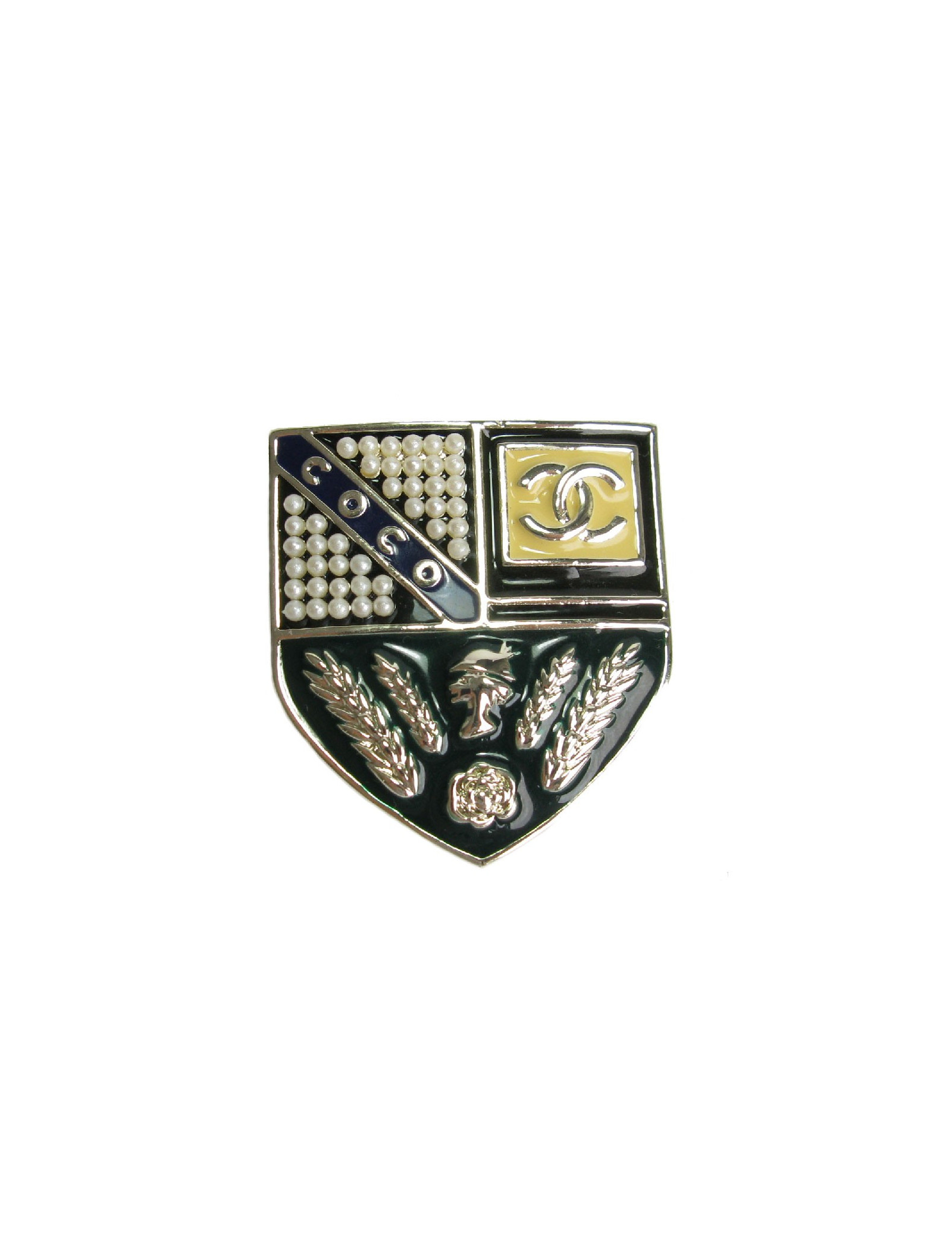 Broche Chanel écusson en métal or pâle, sertie de petites perles nacrées et résine de couleur : beige, noir, bleu et vert foncé.